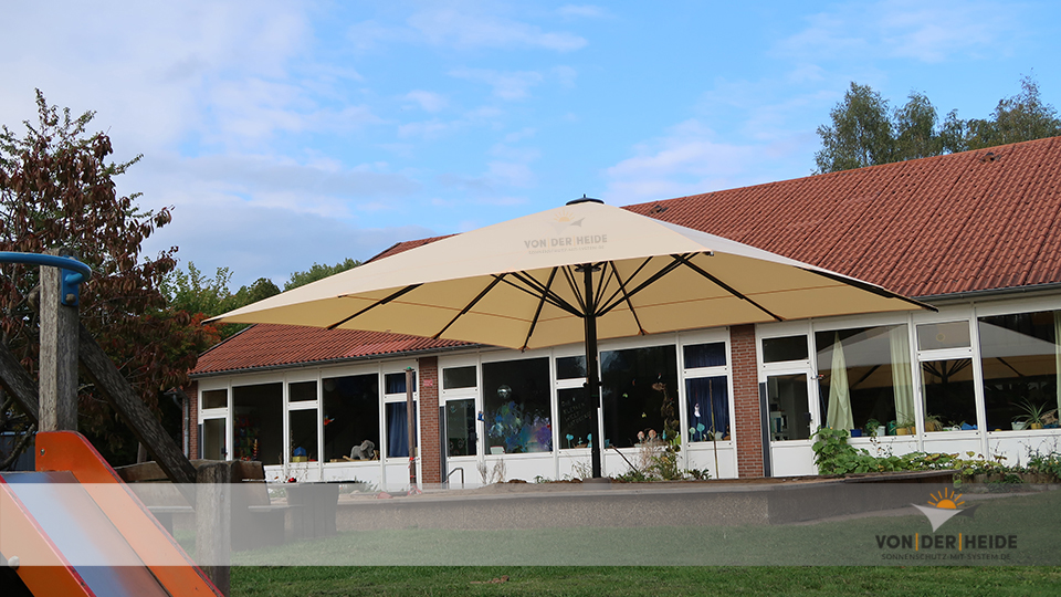 Roter Sonnenschirm May-Schattello mit PVC-Bespannung in einer Sandkiste eines Kindergartens