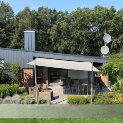 Ausgefahrenes Markisensegel Soliday CS – mit teilabgesenkten Höhenverstellungen