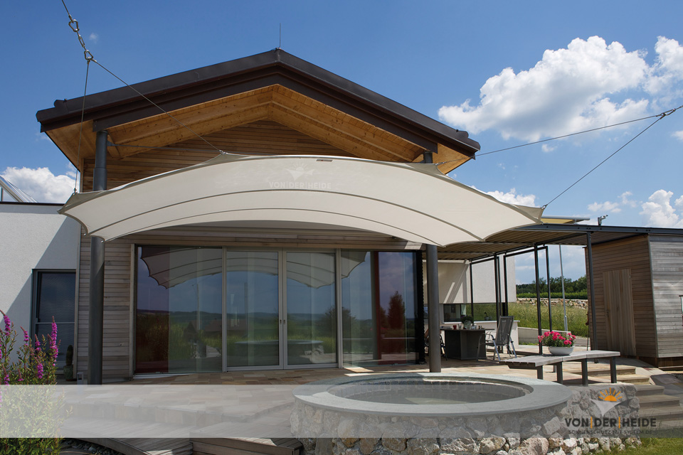 Das elegante Sonnensegel vereint Architektur-Design und Nutzen als Sonnen- und Regenschutz