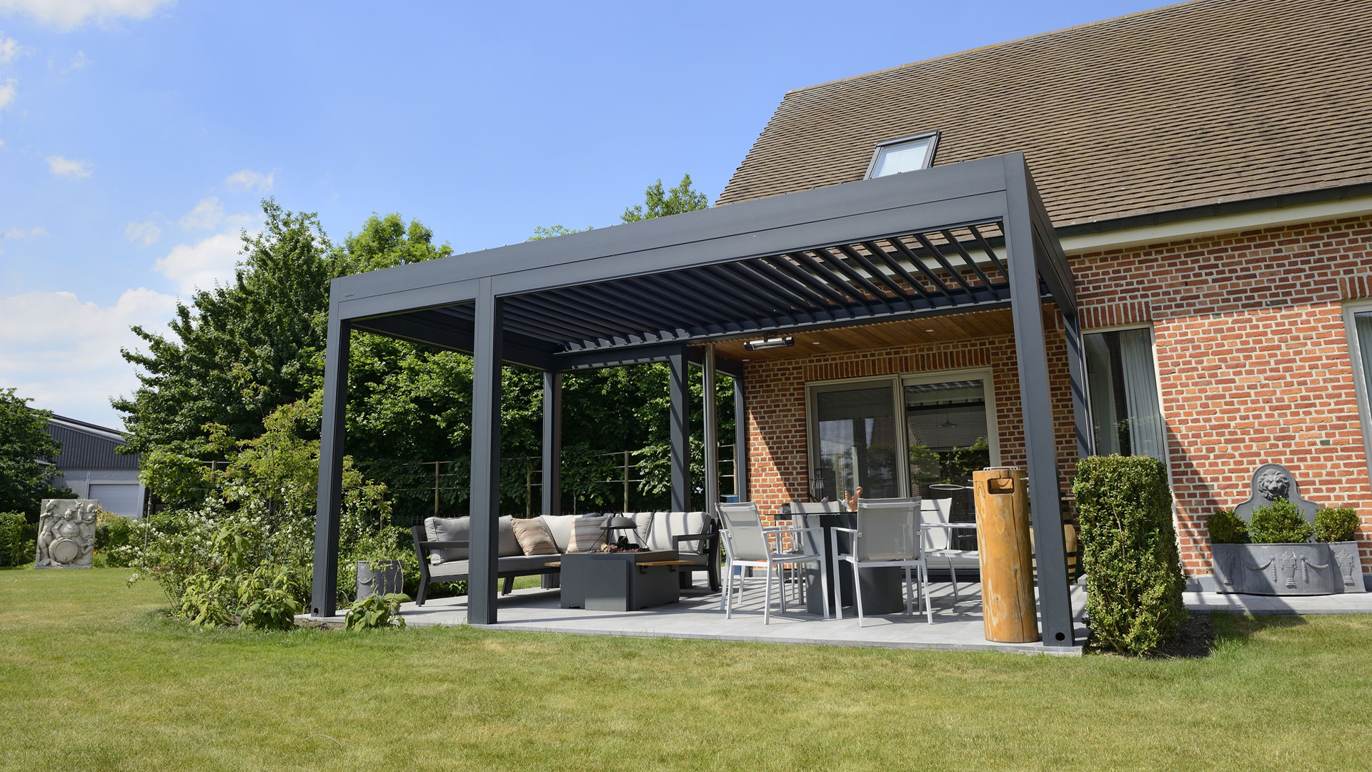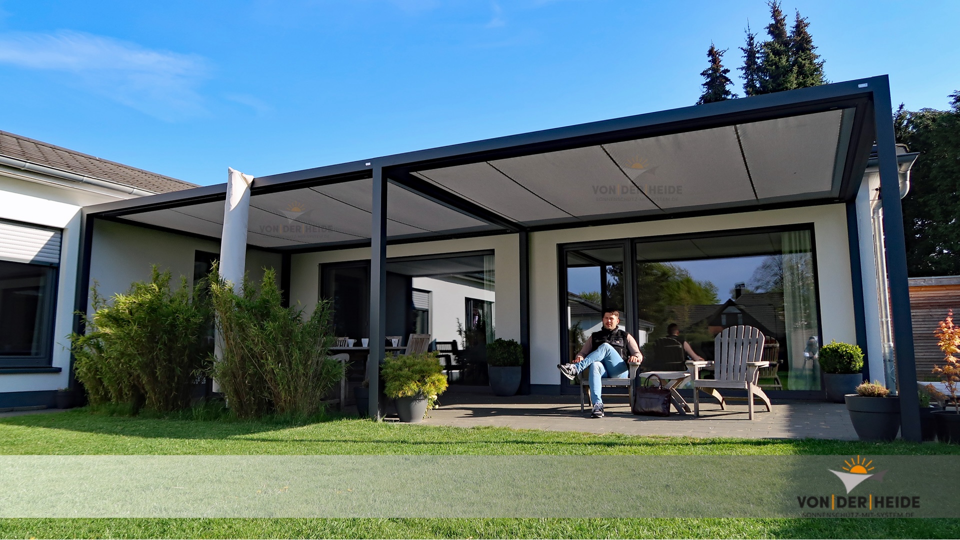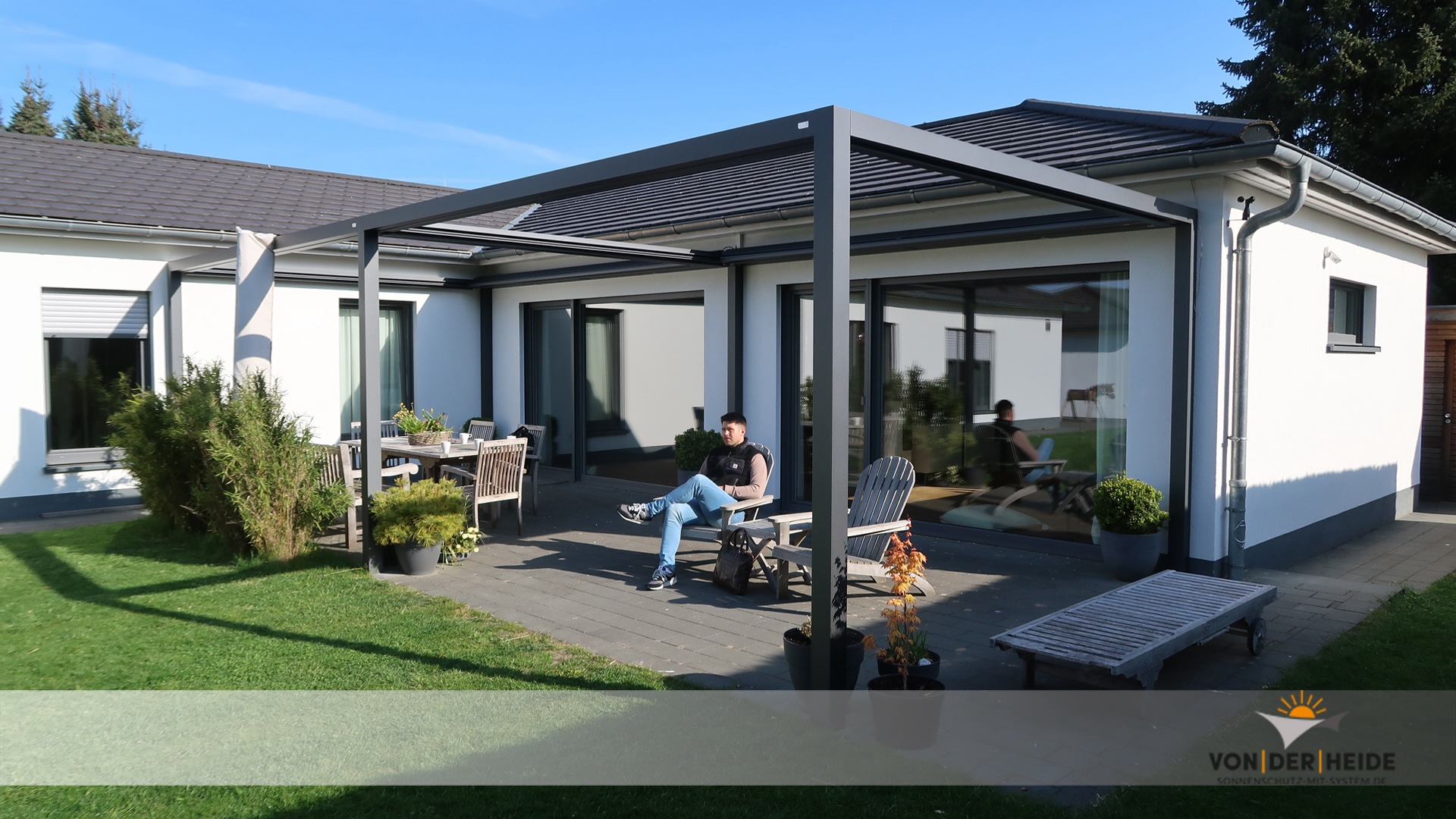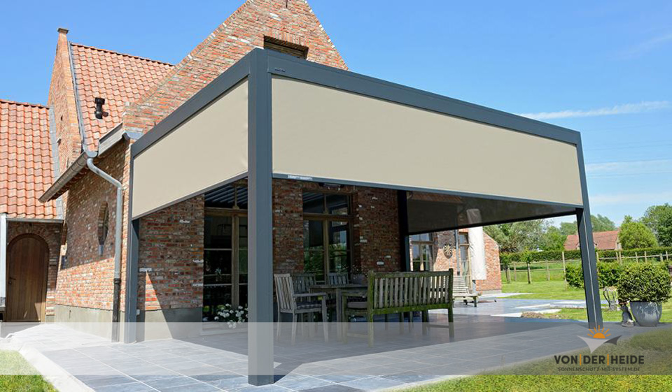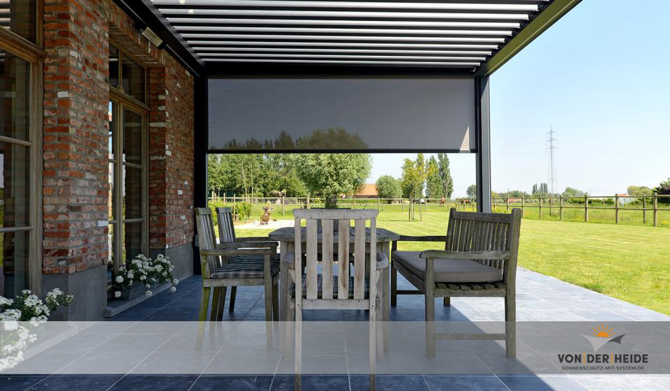 Terrassendach Leiner Q.bus mit integrierter Pergola-Markise und Zip-Screens im ausgefahrenen Zustand.
