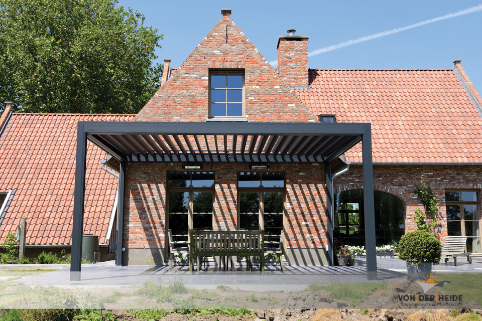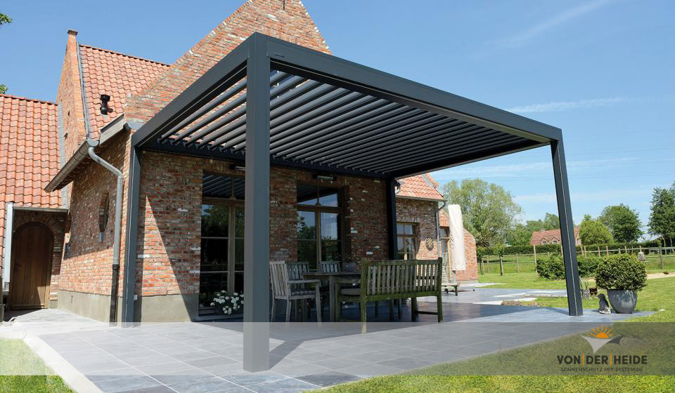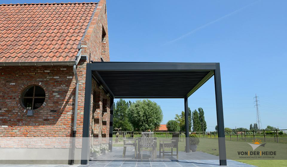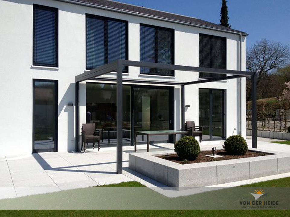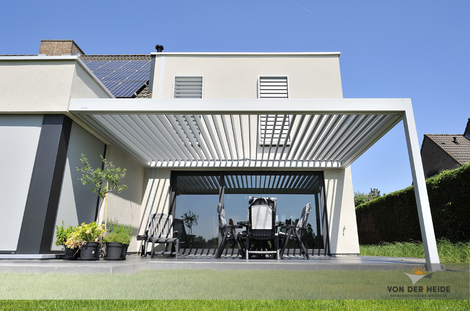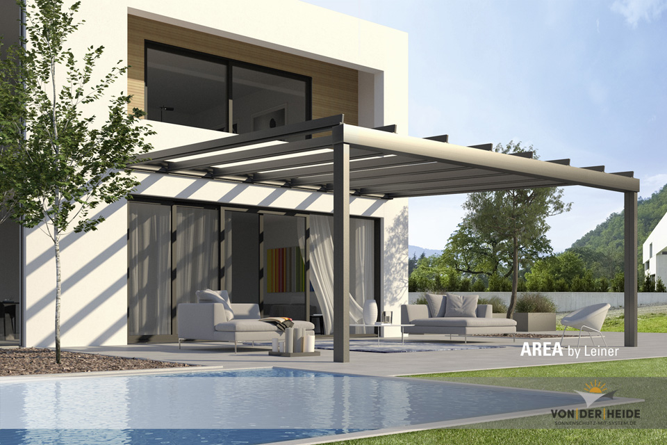 Terrassendach Leiner Q.bus mit integrierter Pergola-Markise und Zip-Screens im ausgefahrenen Zustand.