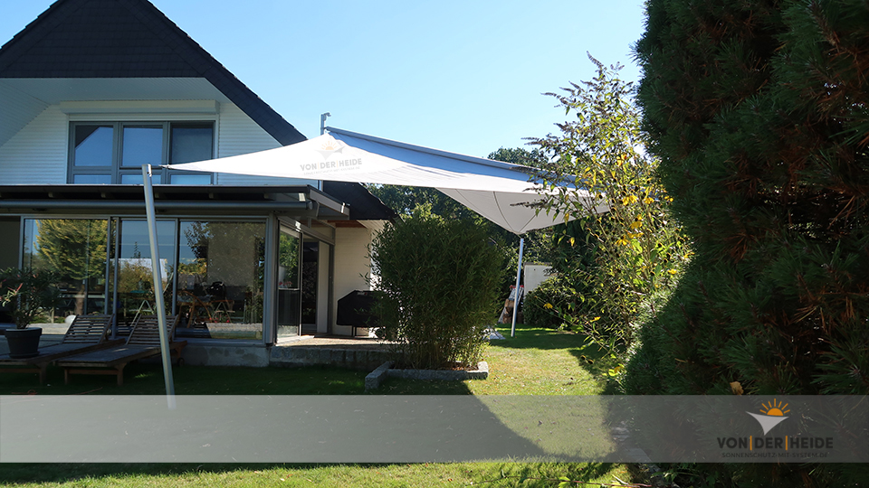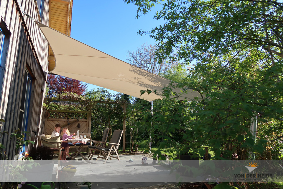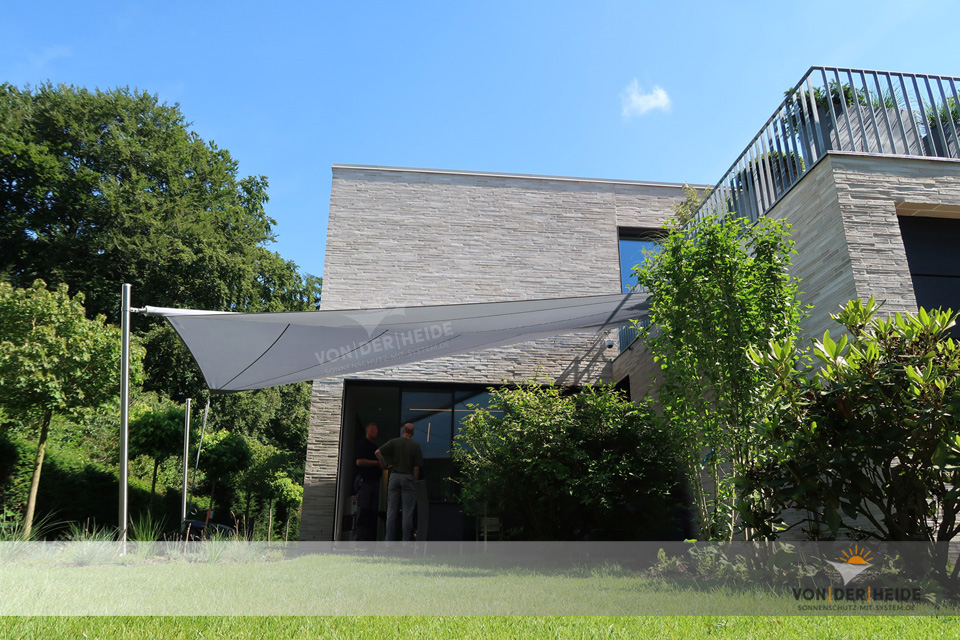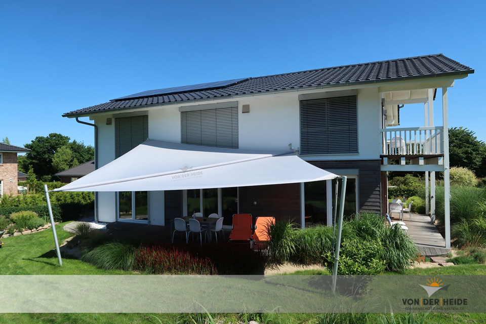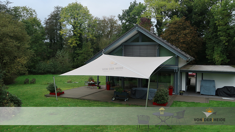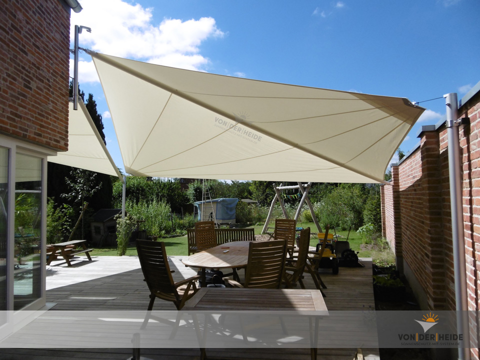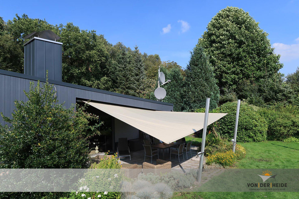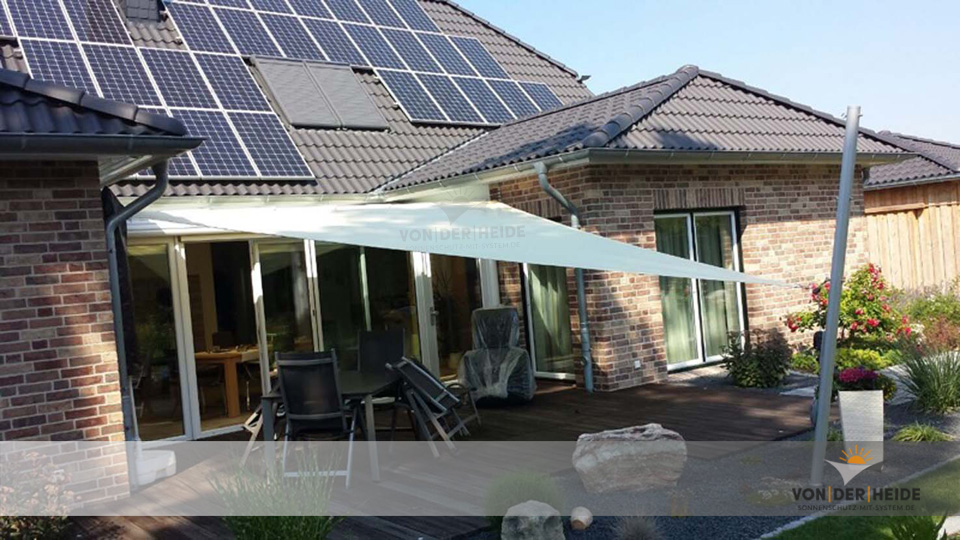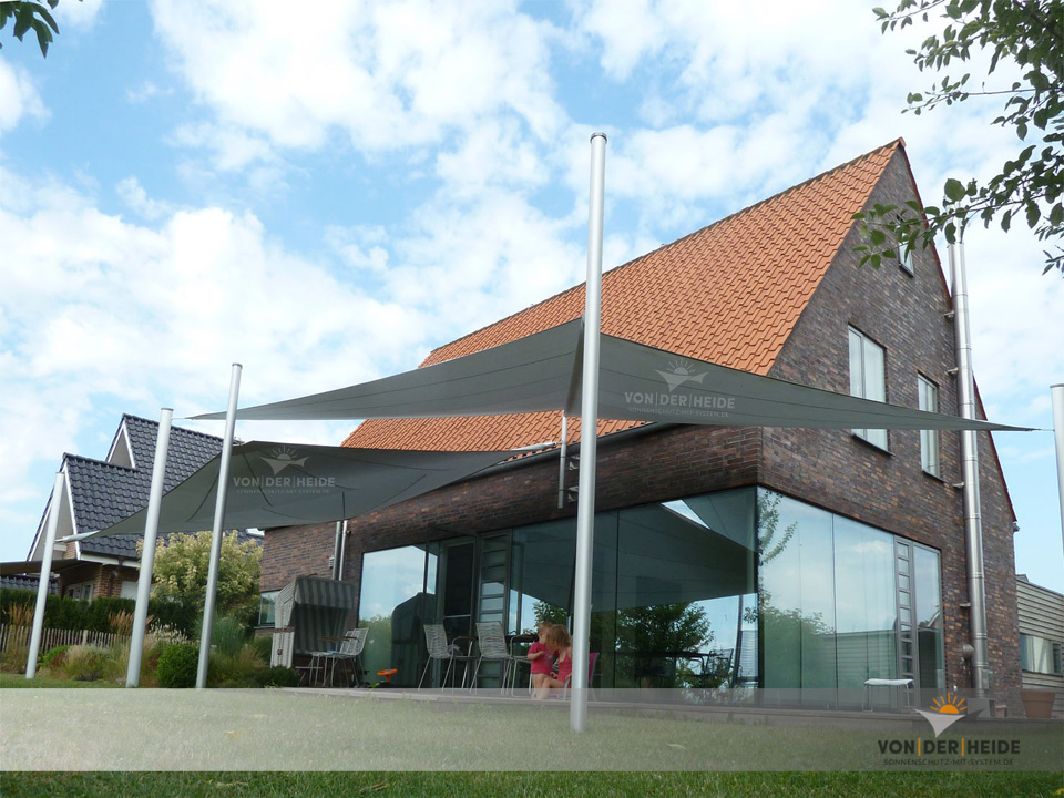 Mit richtig geplant und umgesetzten Sonnenschutzsystemen wie solchen Sonnensegeln genießen Sie Ihr Zuhause in Sonne und im Schatten