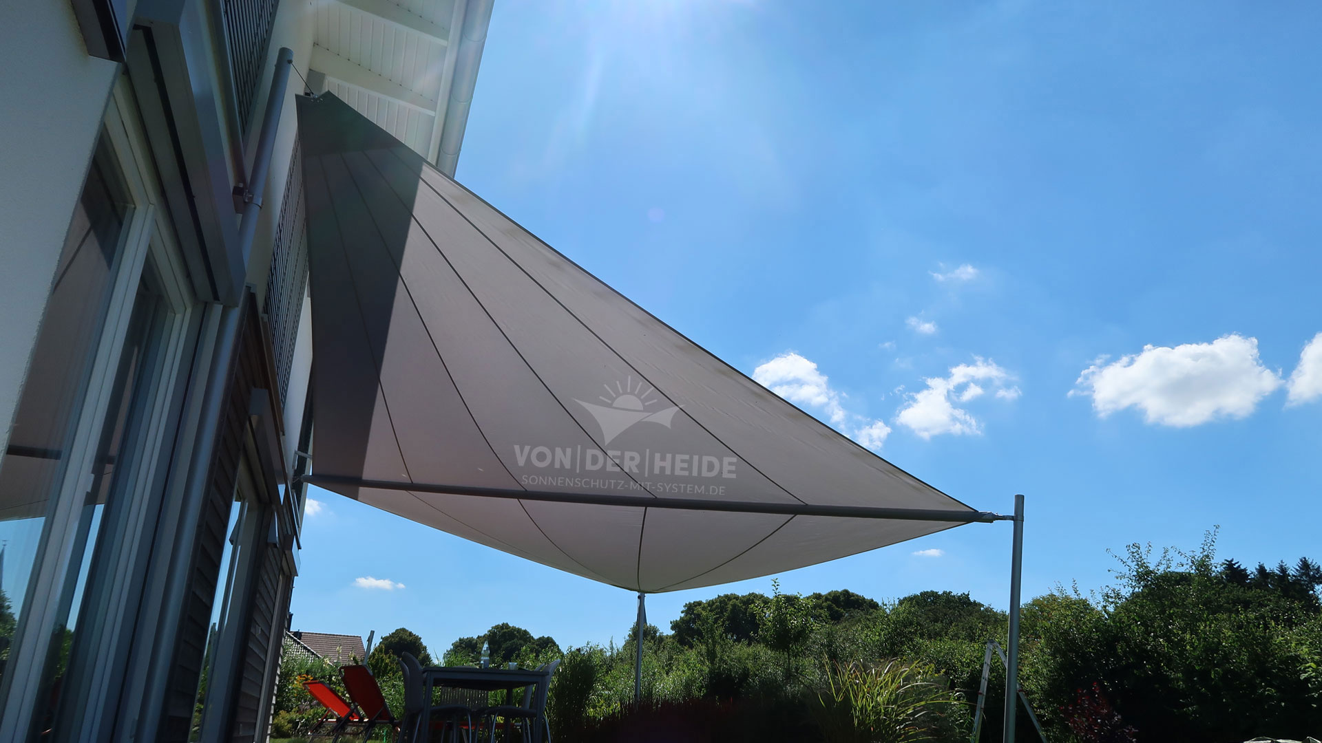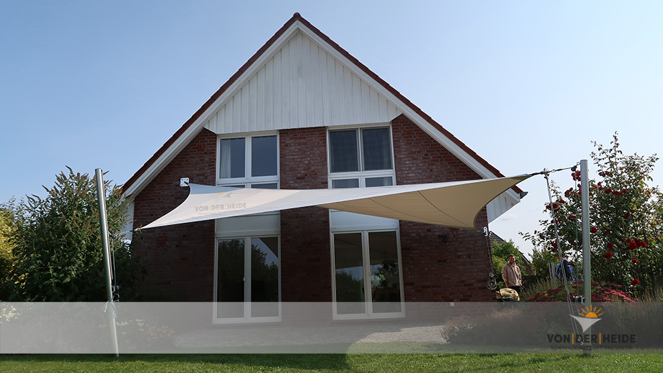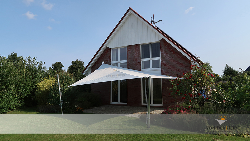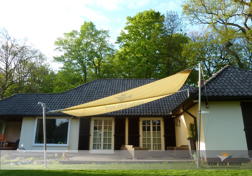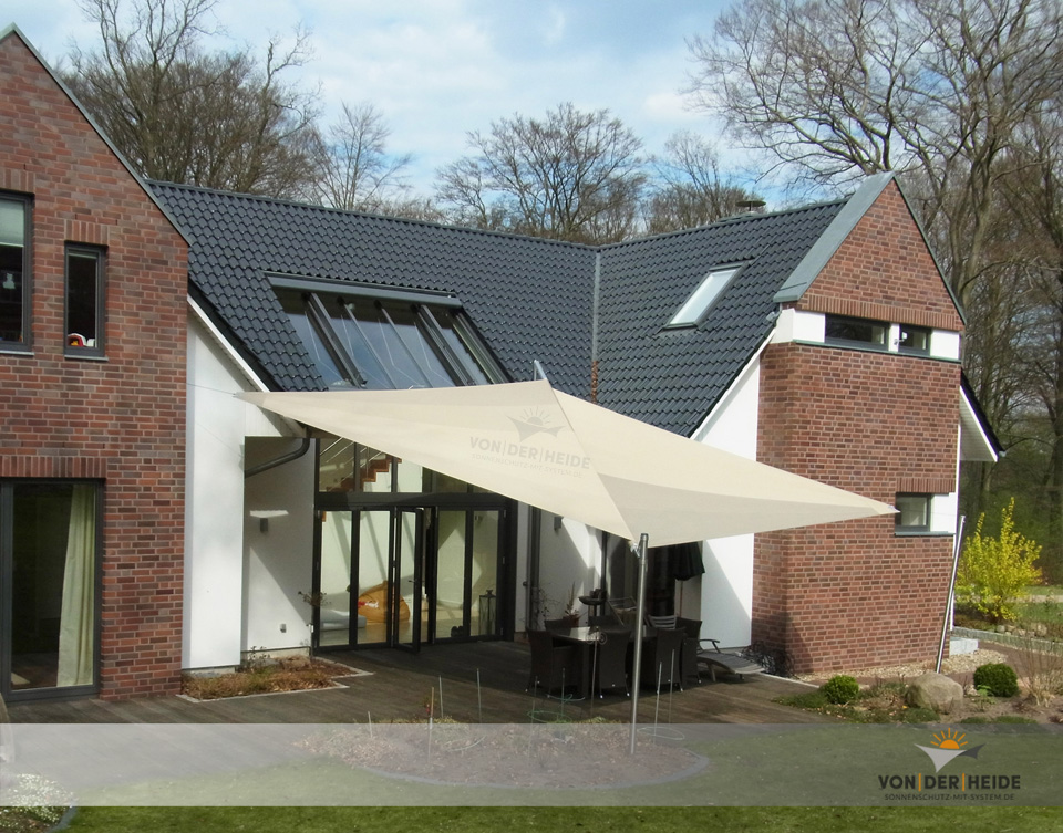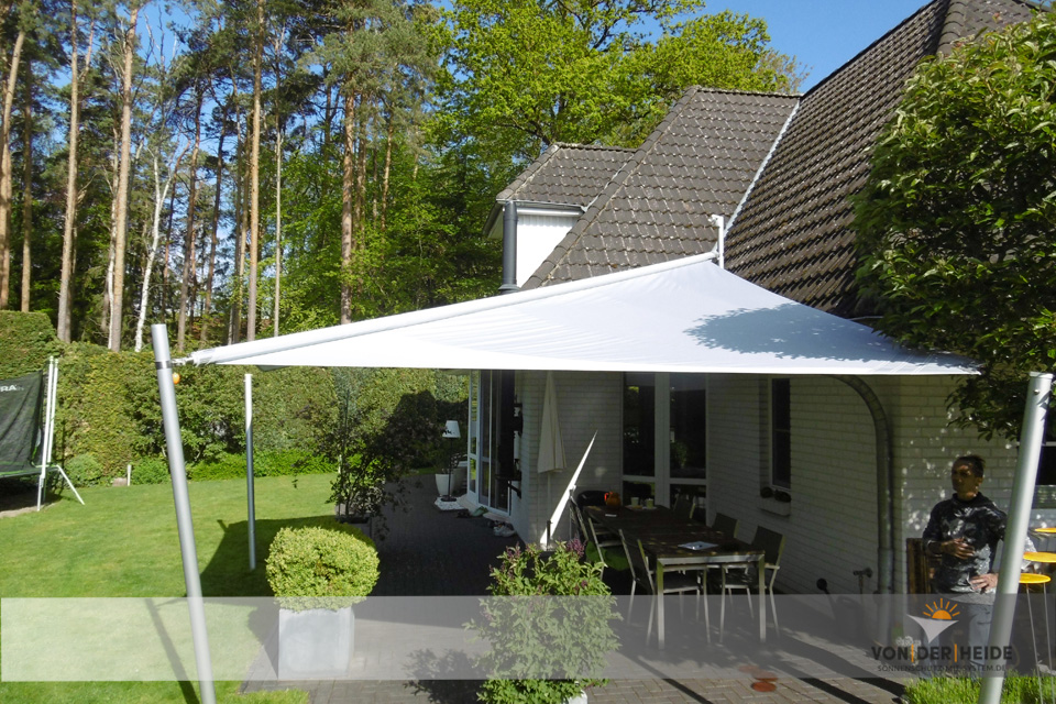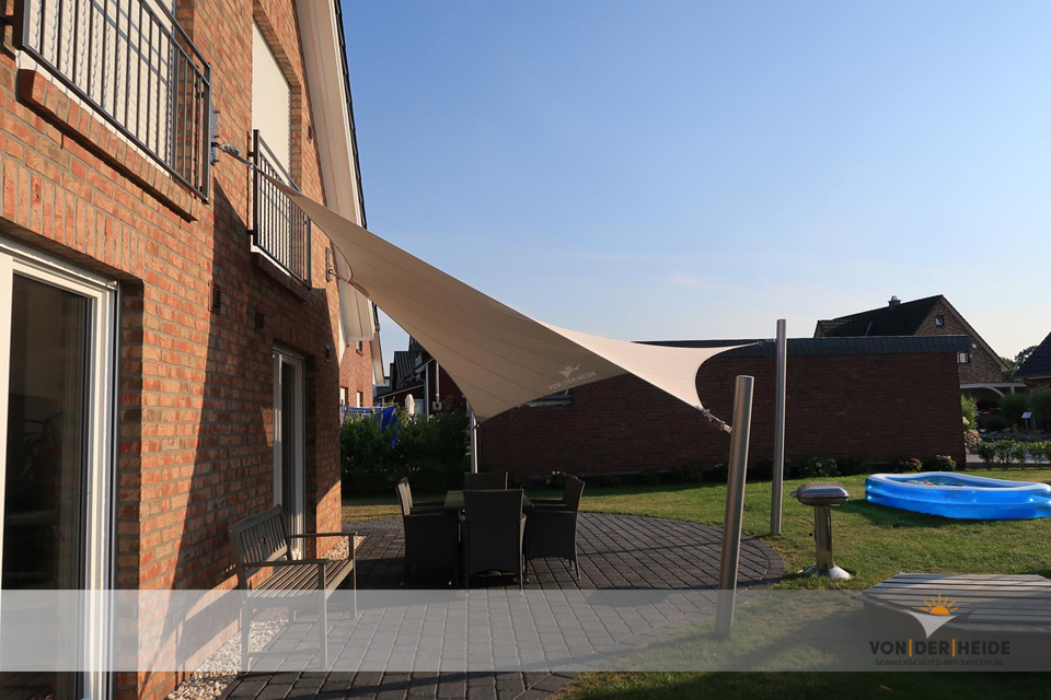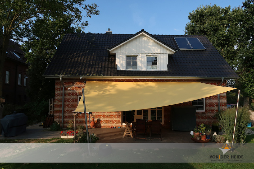 Festes Sonnensegel der Marke Golle für Sommersaison mit 3 Aluminiummasten und 2 Wandkonsolen nähe Lüneburg