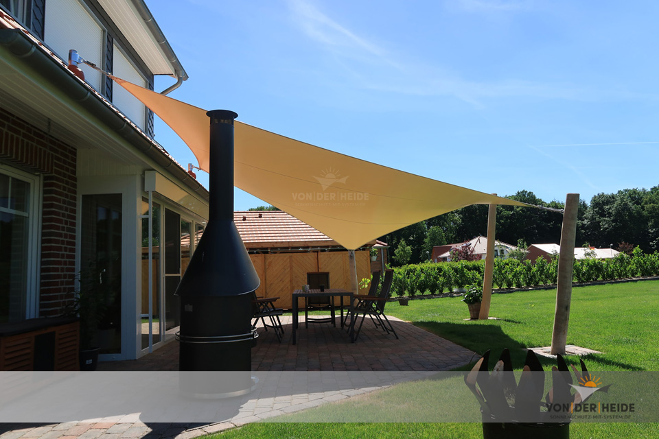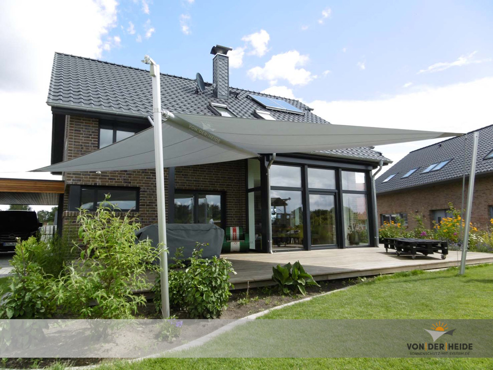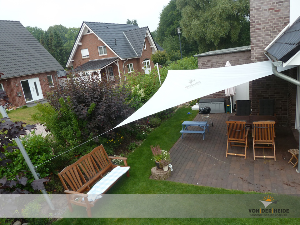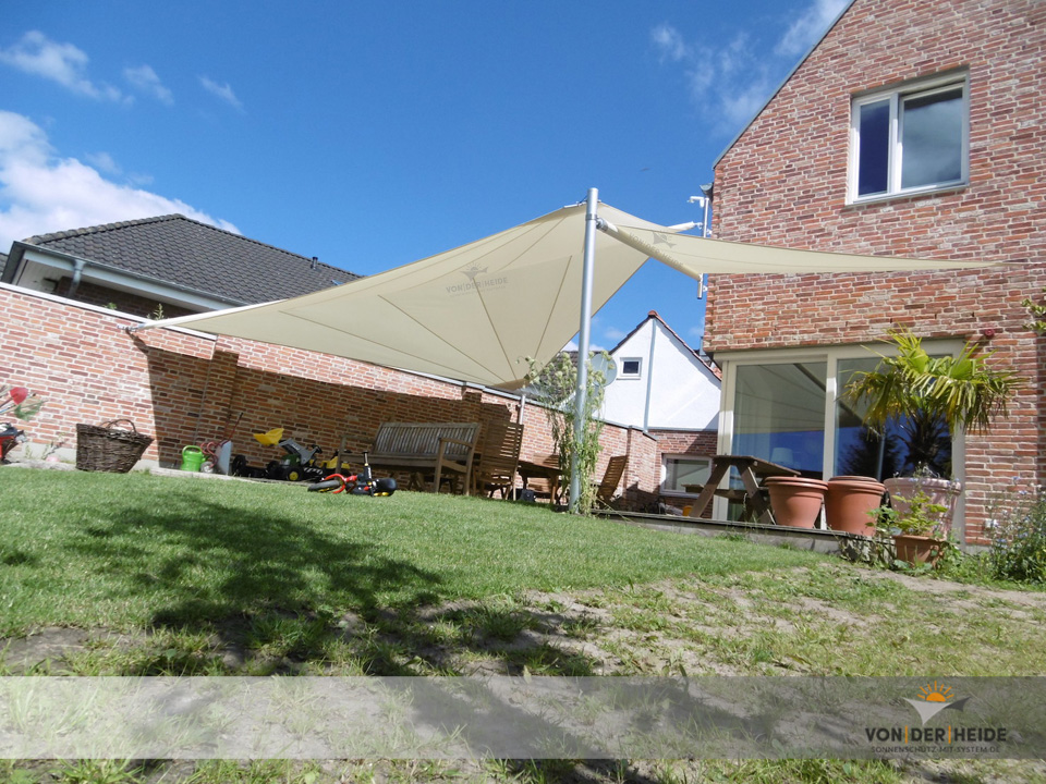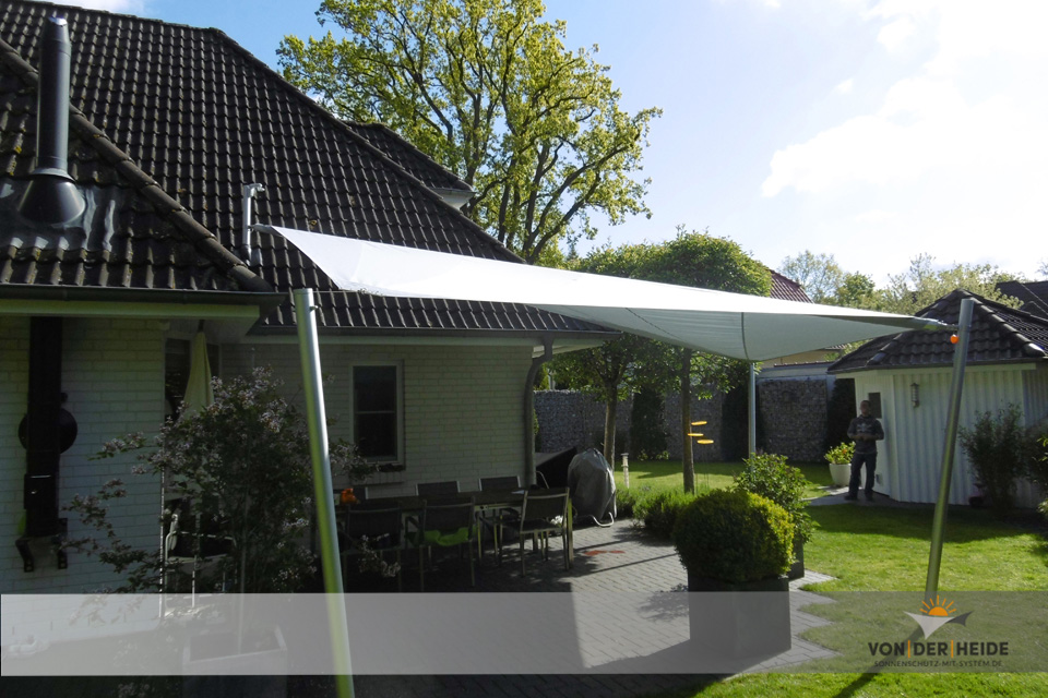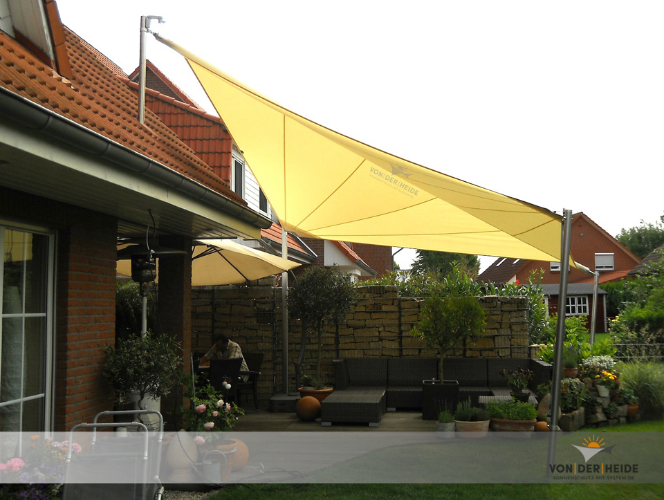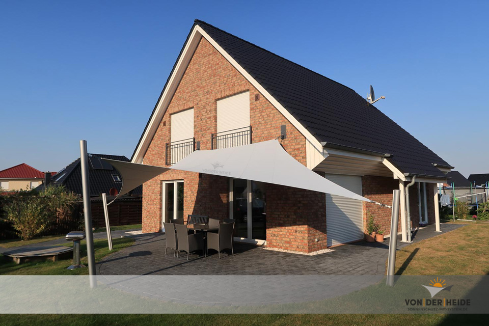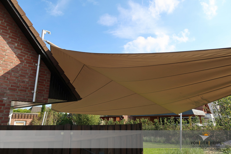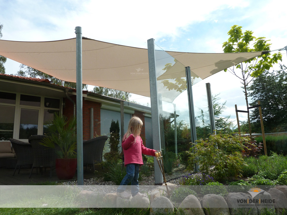 Festes Sonnensegel der Marke Golle für Sommersaison mit 3 Aluminiummasten und 2 Wandkonsolen nähe Lüneburg