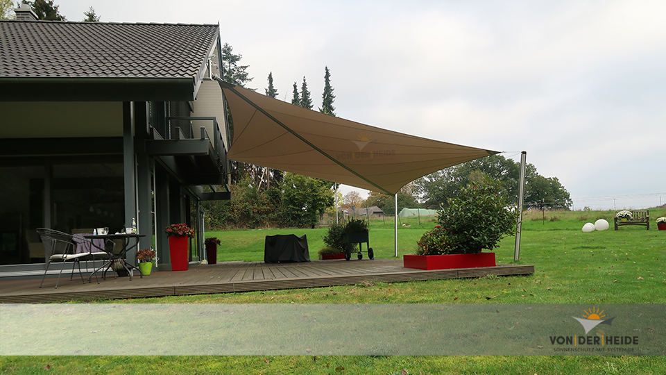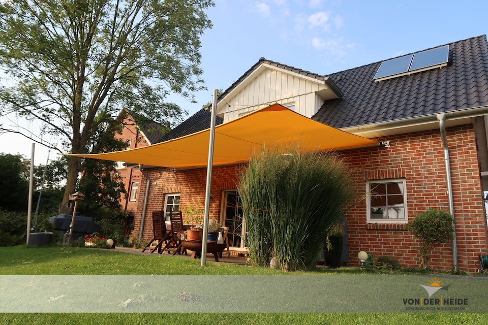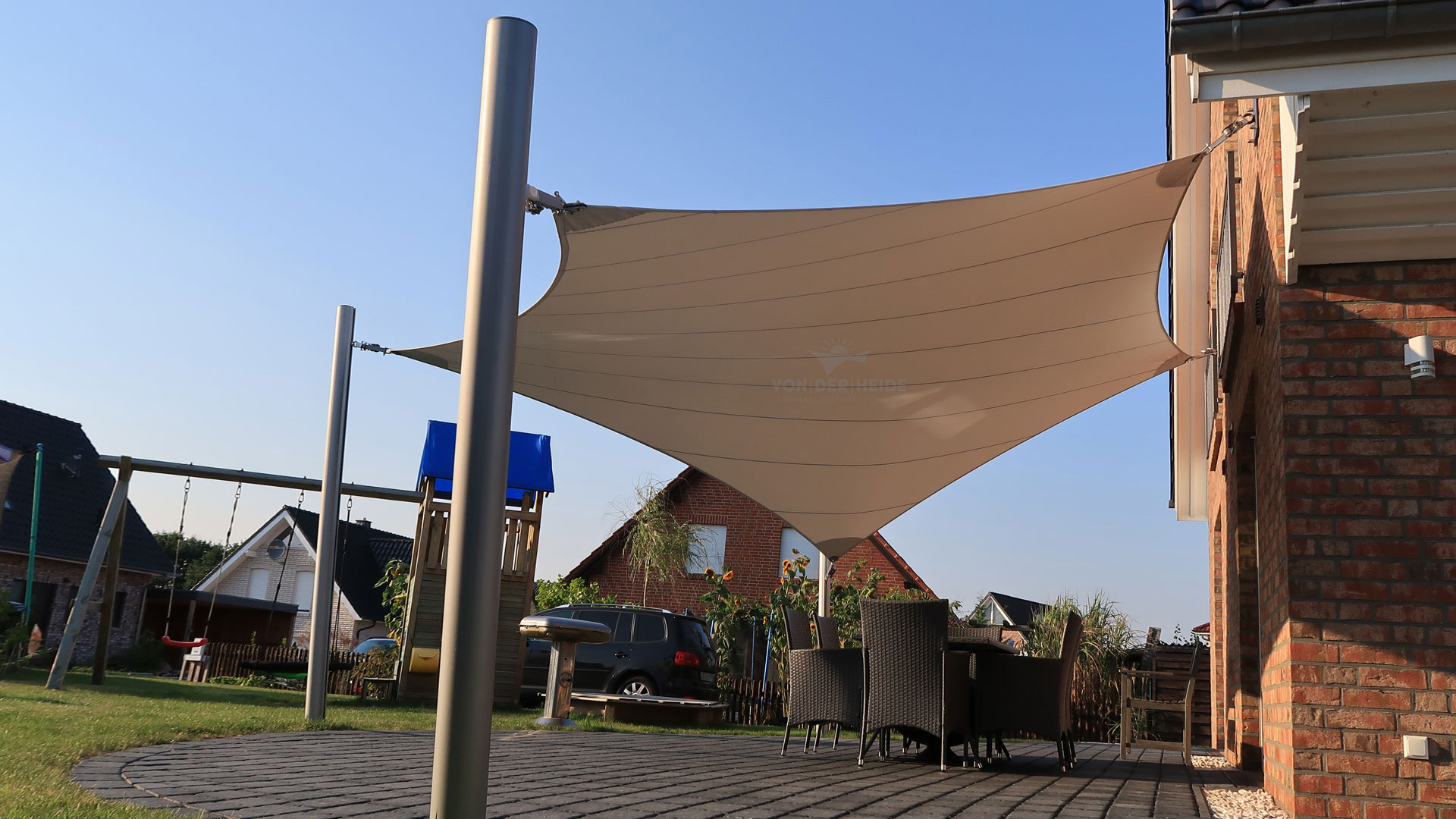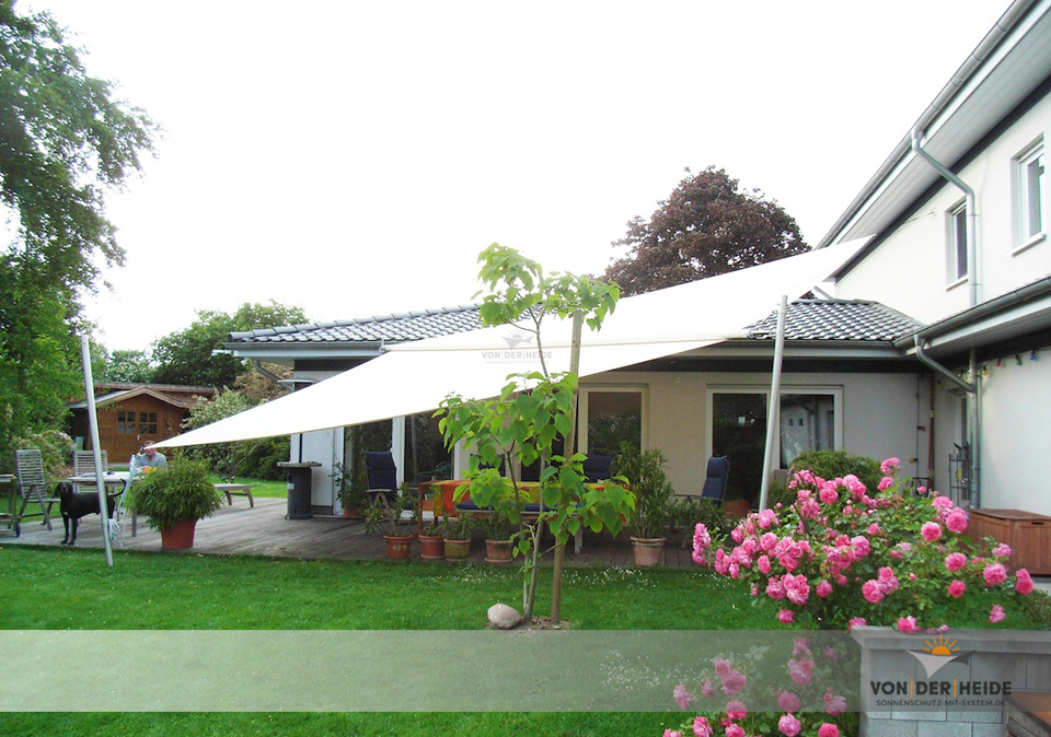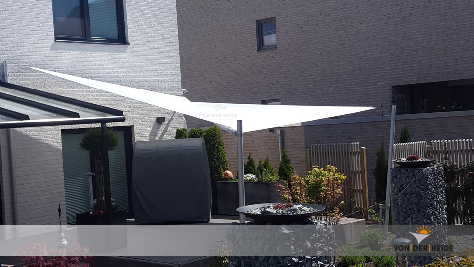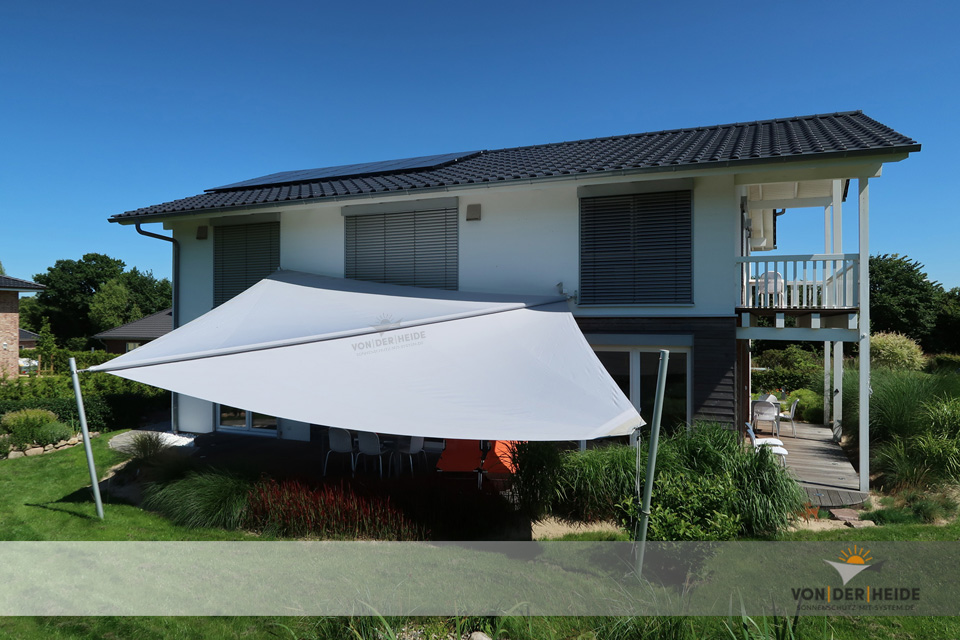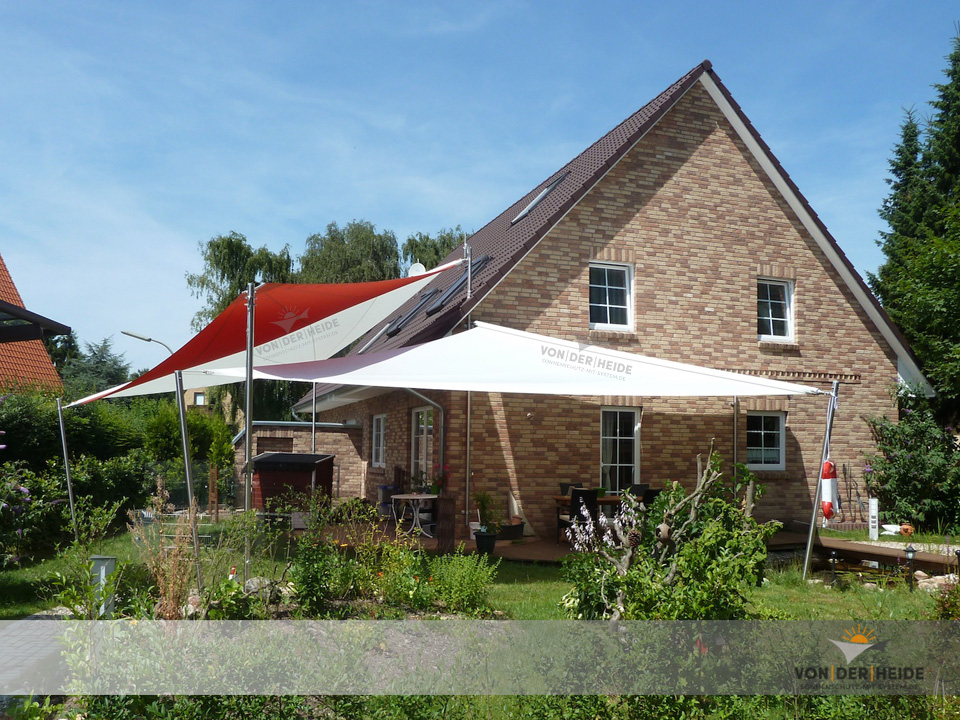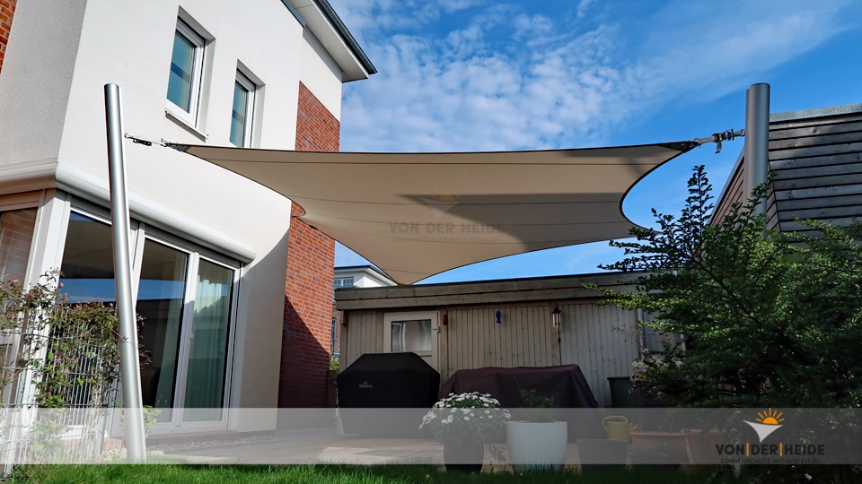 Festes Sonnensegel der Marke Golle für Sommersaison mit 3 Aluminiummasten und 2 Wandkonsolen nähe Lüneburg