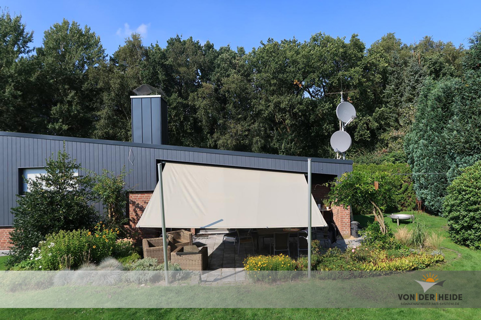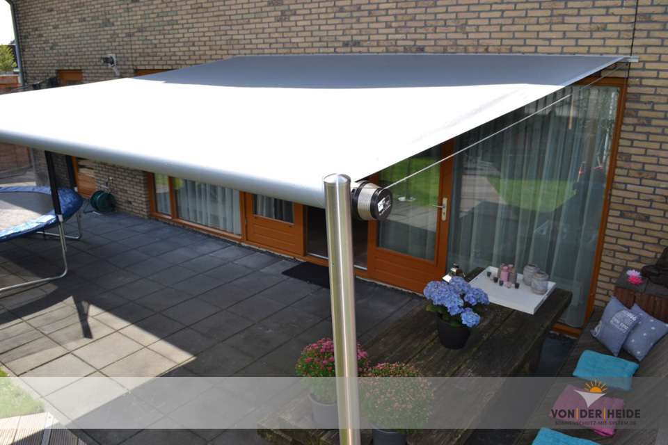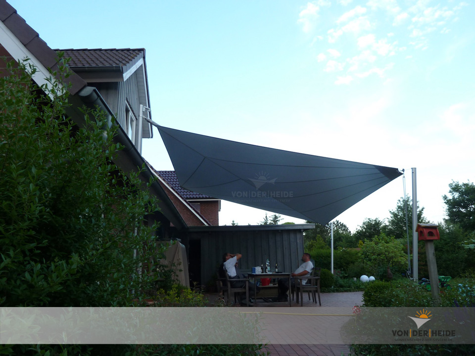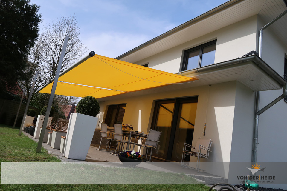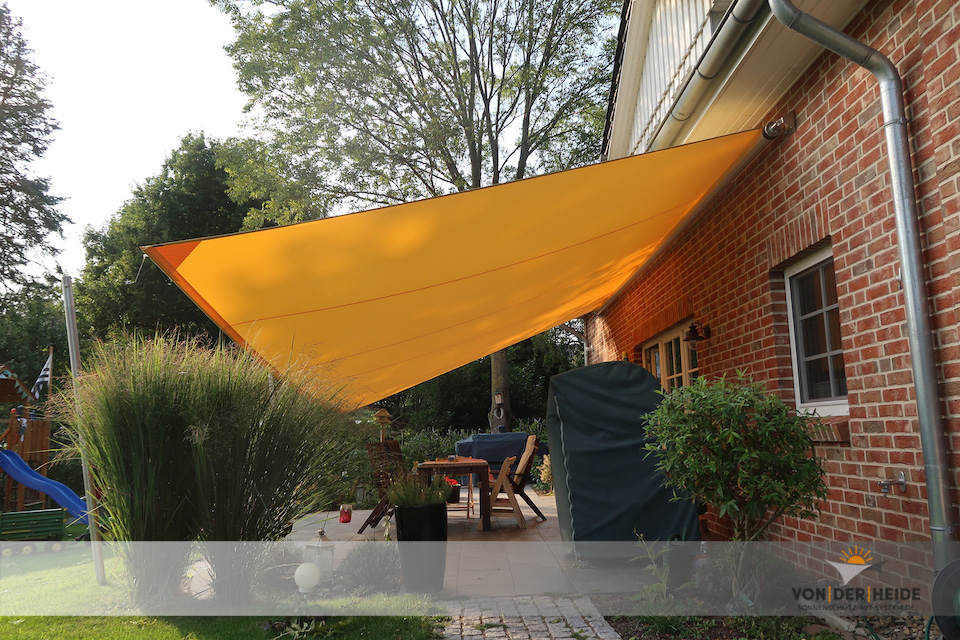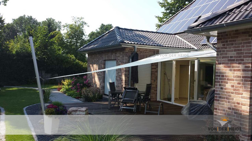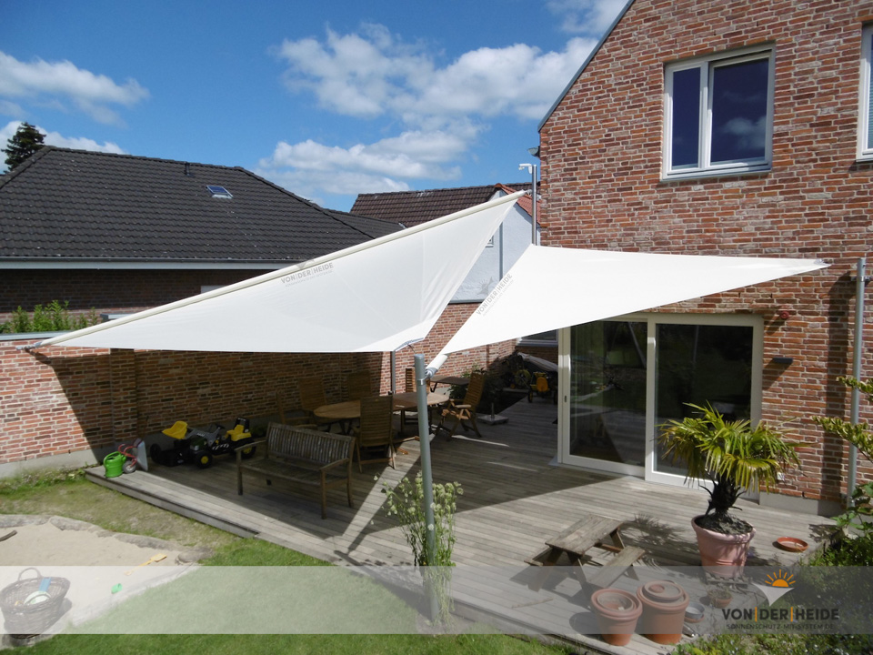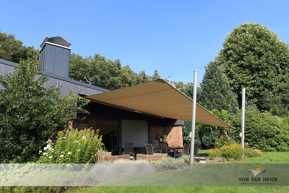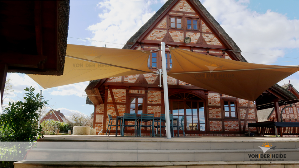 Festes Sonnensegel der Marke Golle für Sommersaison mit 3 Aluminiummasten und 2 Wandkonsolen nähe Lüneburg