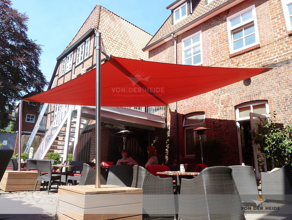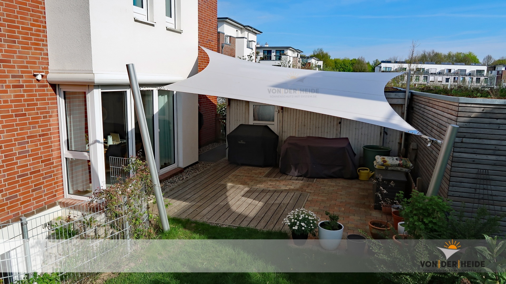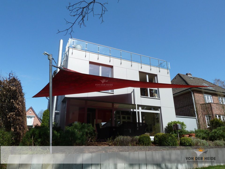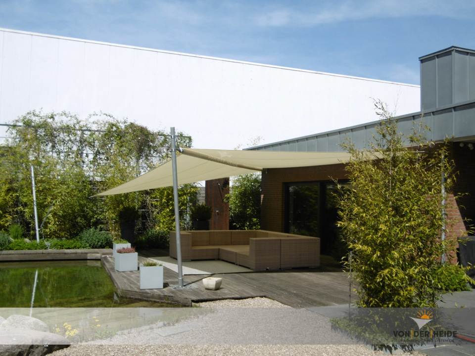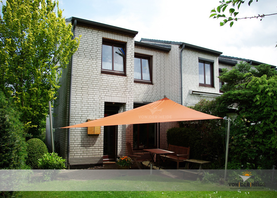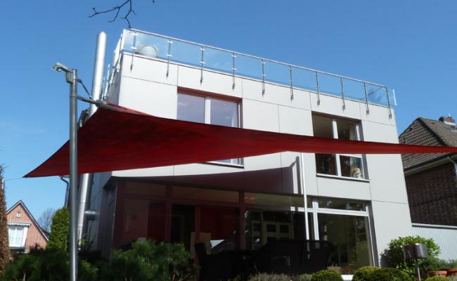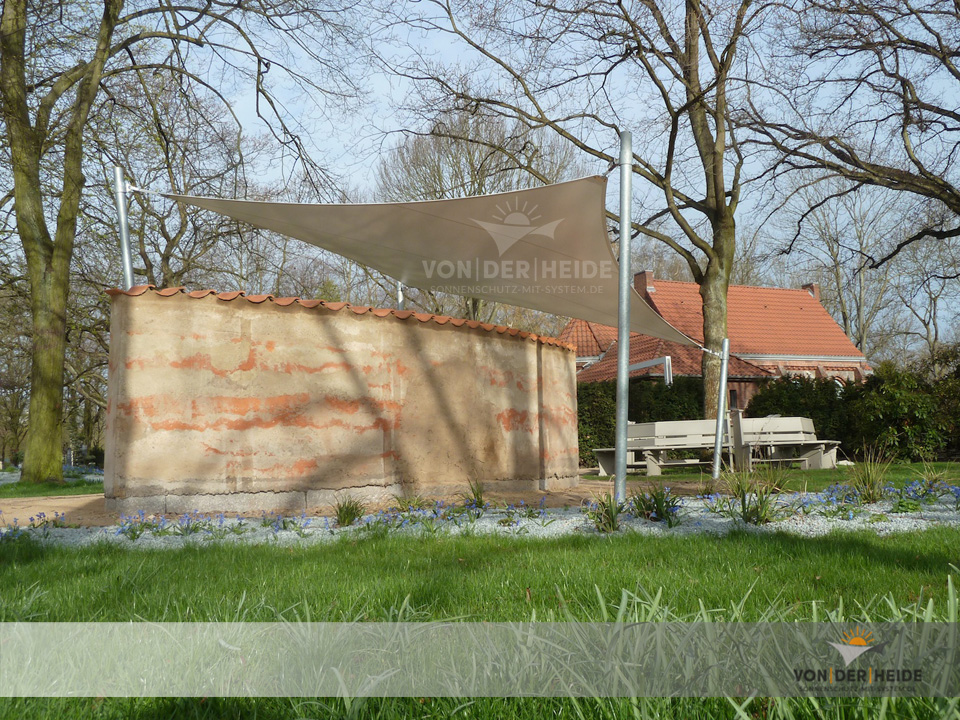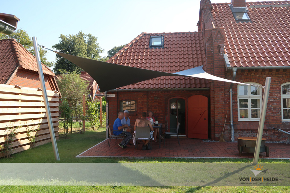 Festes Sonnensegel der Marke Golle für Sommersaison mit 3 Aluminiummasten und 2 Wandkonsolen nähe Lüneburg