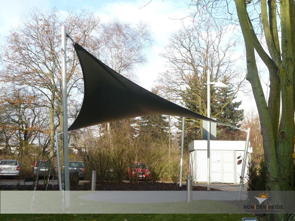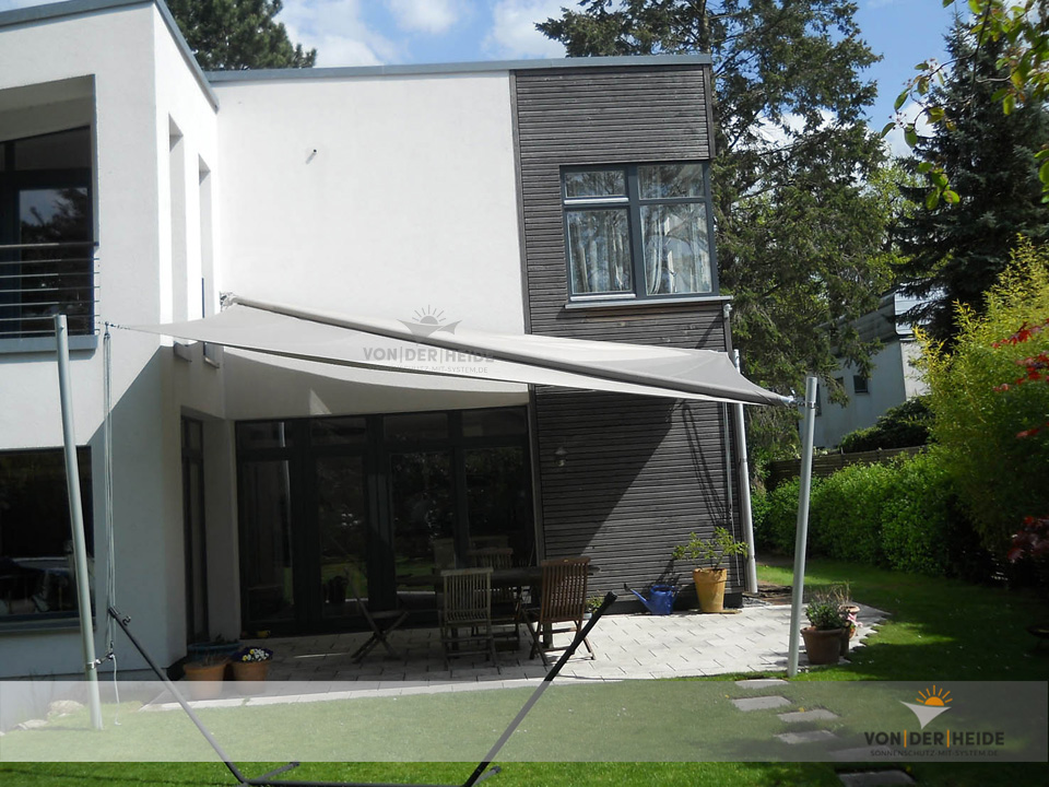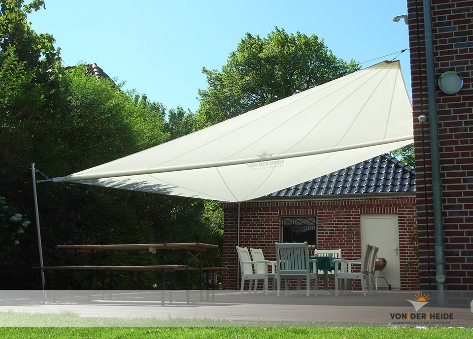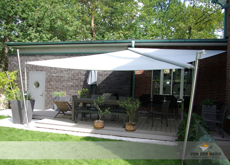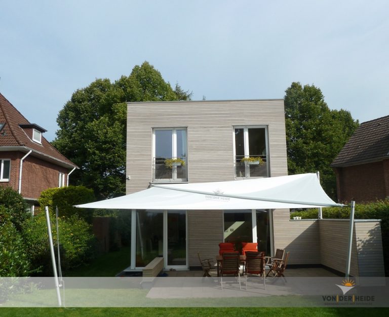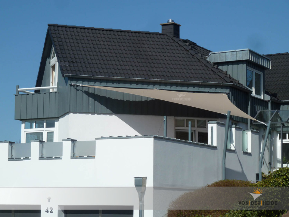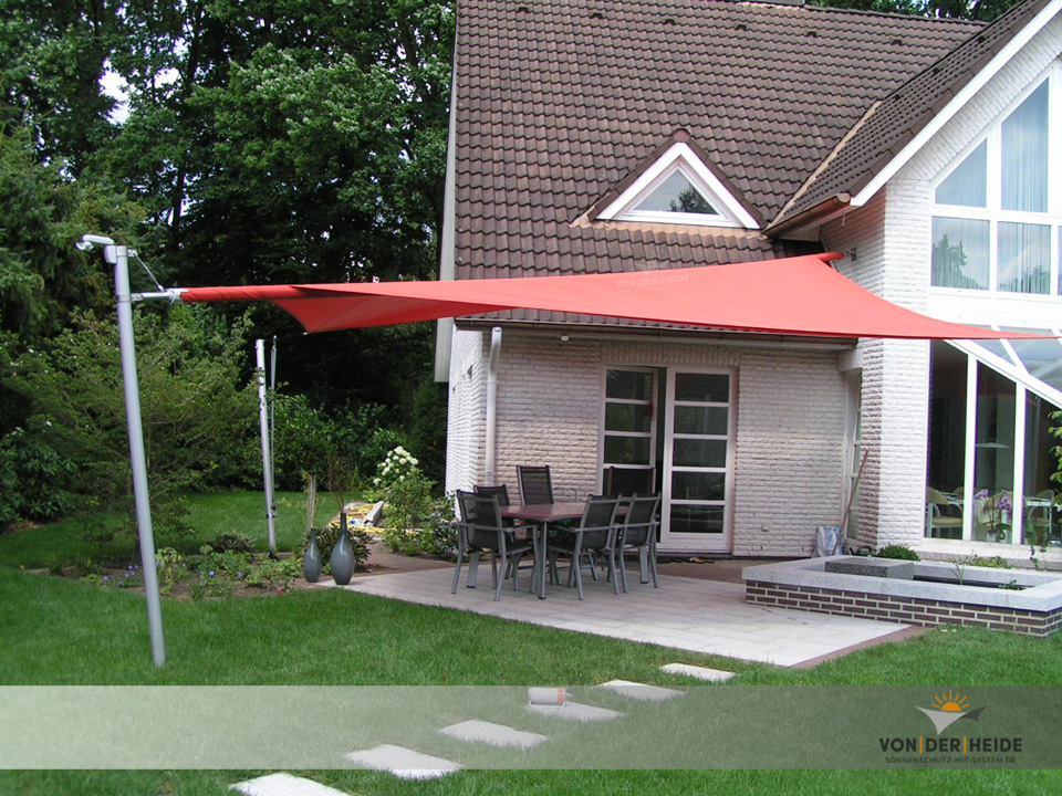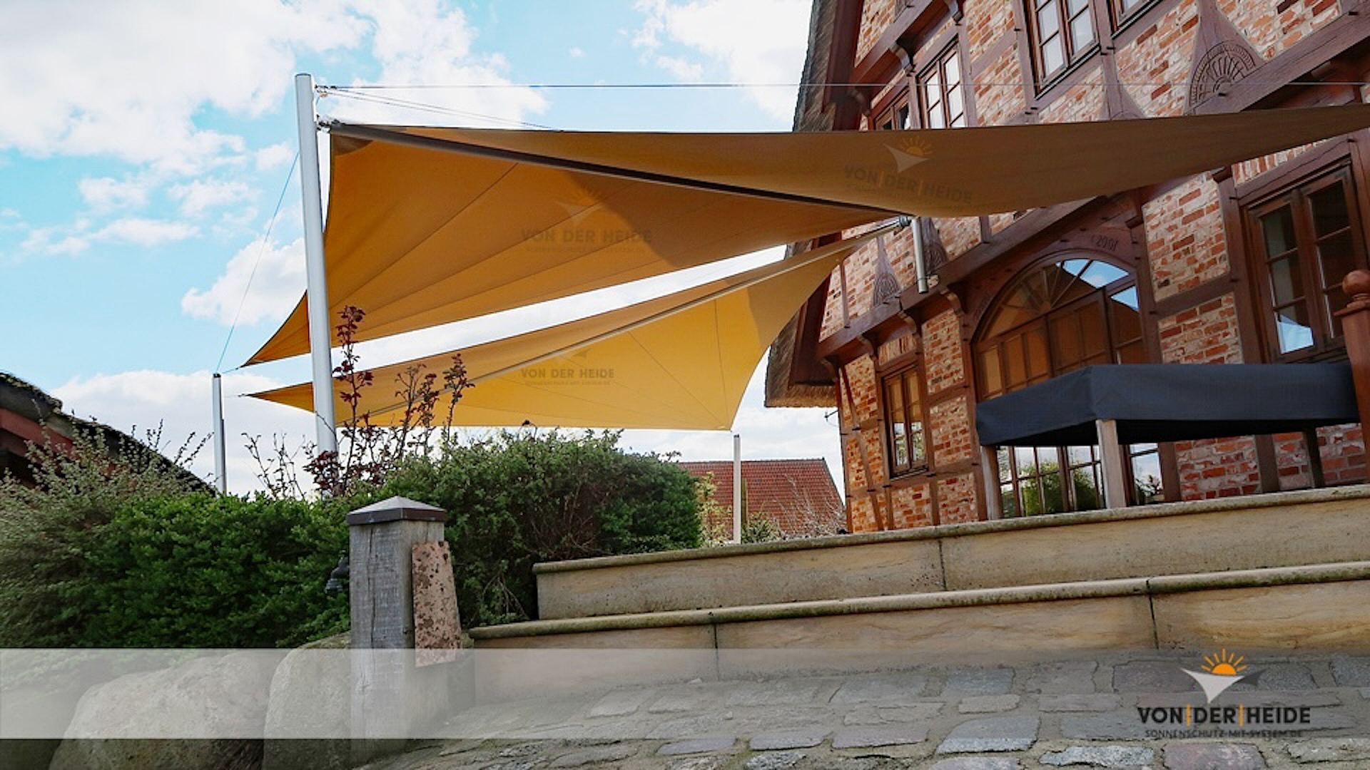 Festes Sonnensegel der Marke Golle für Sommersaison mit 3 Aluminiummasten und 2 Wandkonsolen nähe Lüneburg