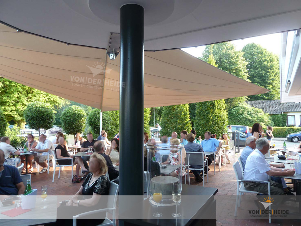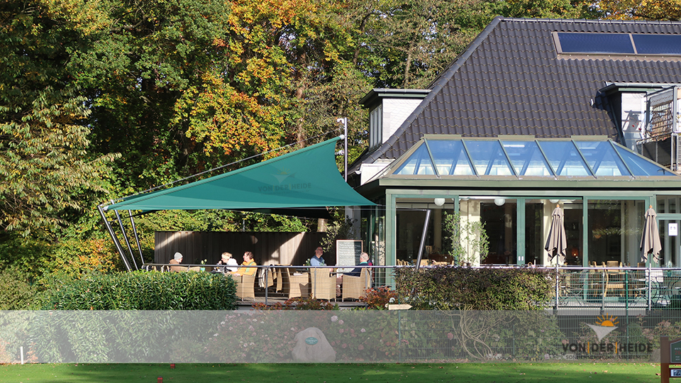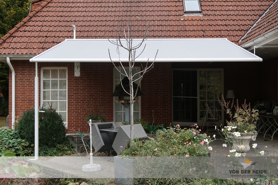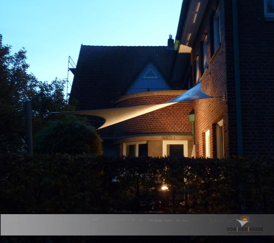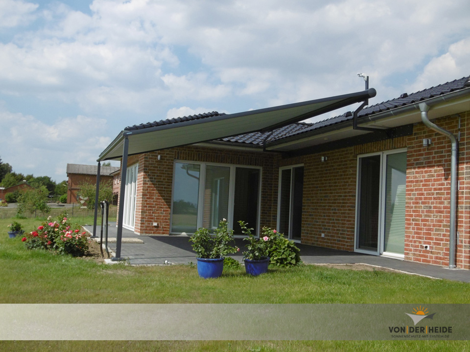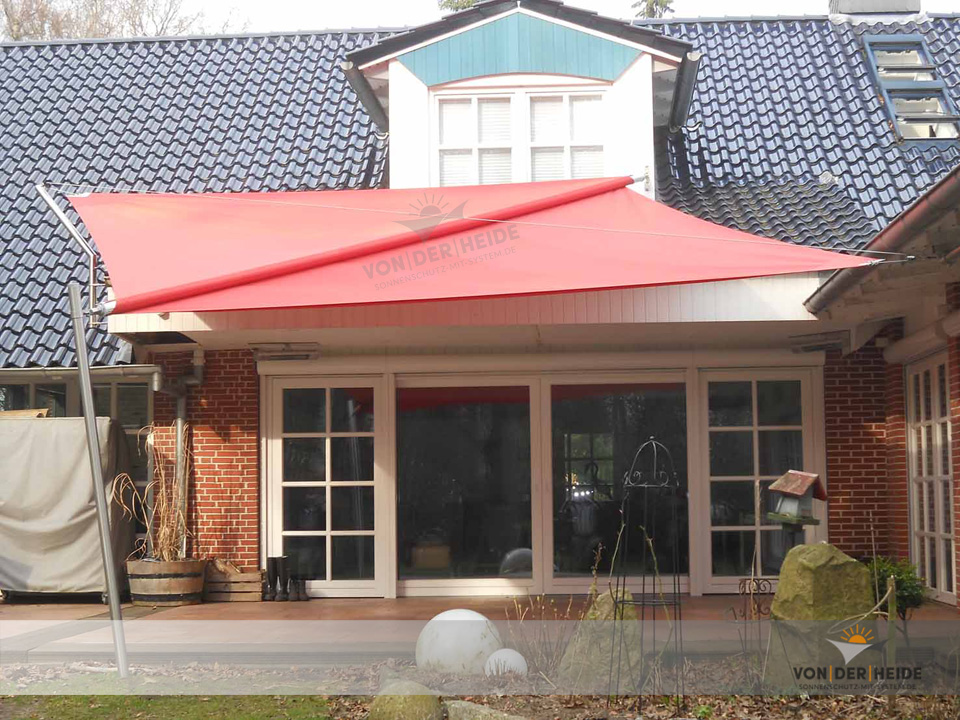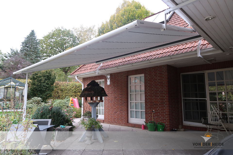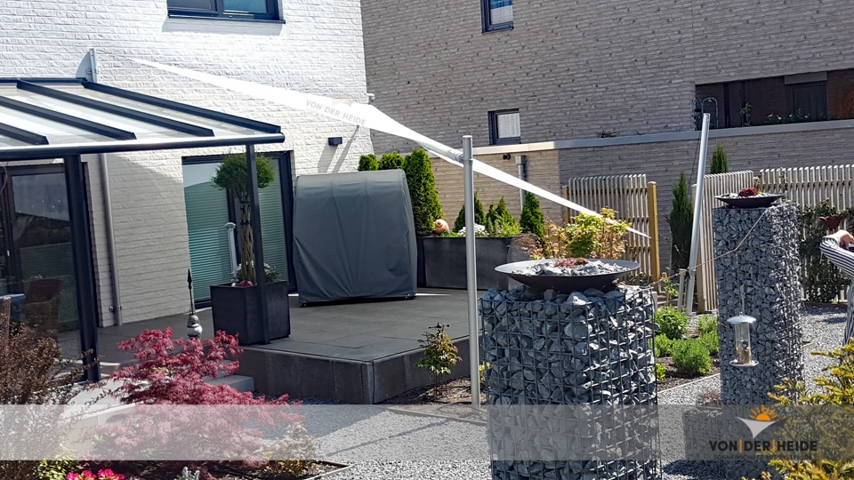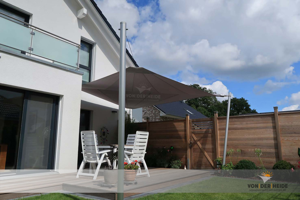 Festes Sonnensegel der Marke Golle für Sommersaison mit 3 Aluminiummasten und 2 Wandkonsolen nähe Lüneburg