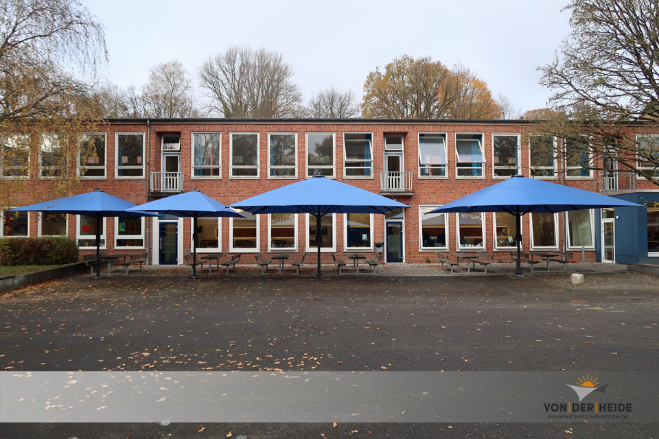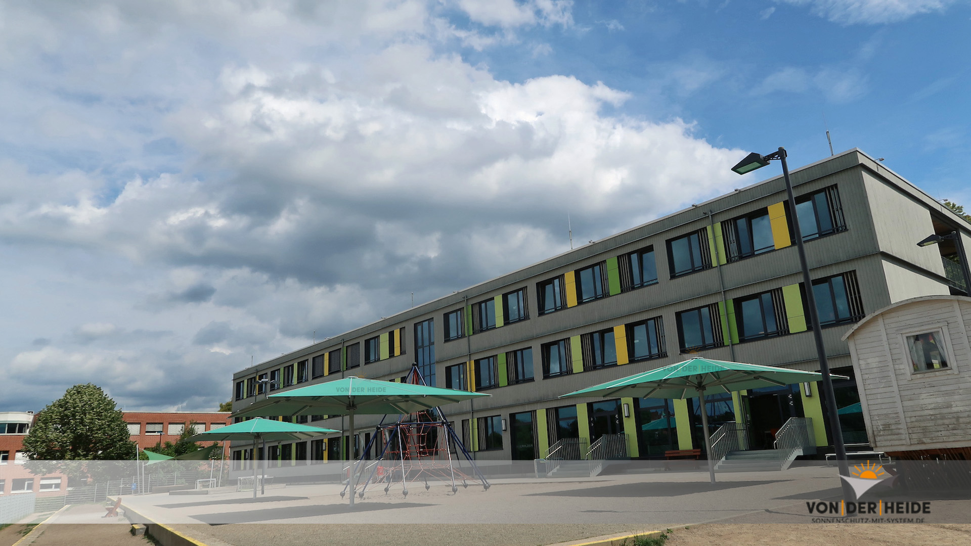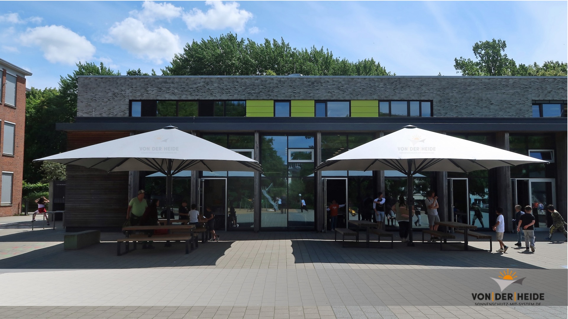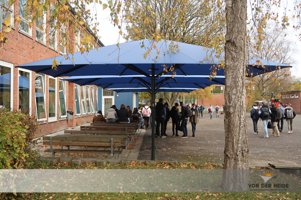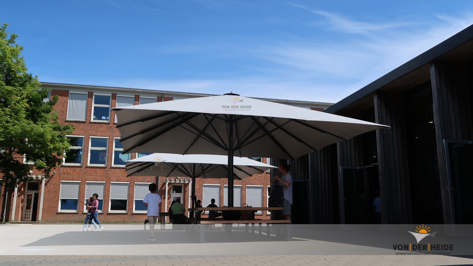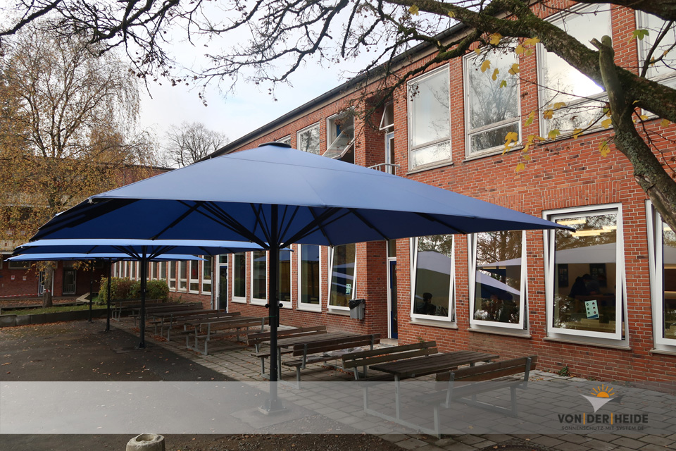 Vier Profi-Großschirme bieten UV-Schutz auf dem Schulhof dieser Schule in Kiel