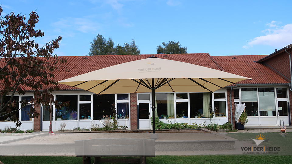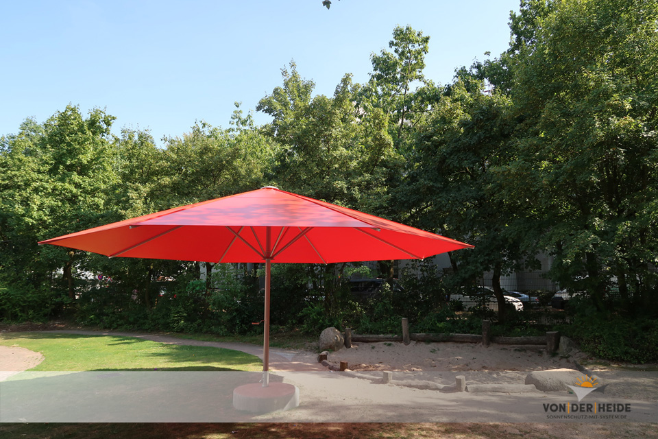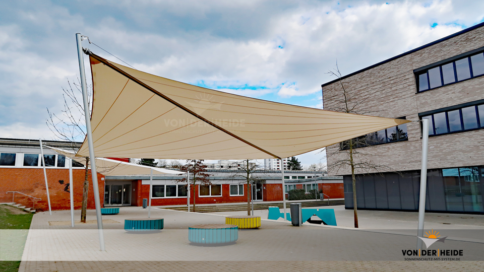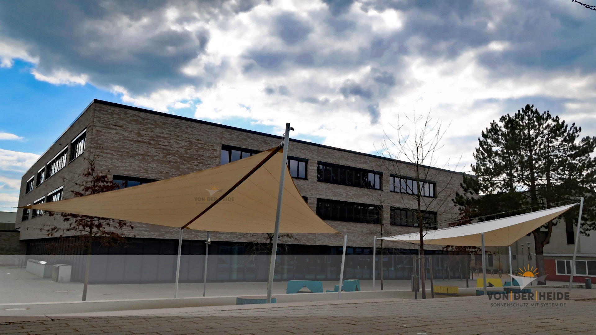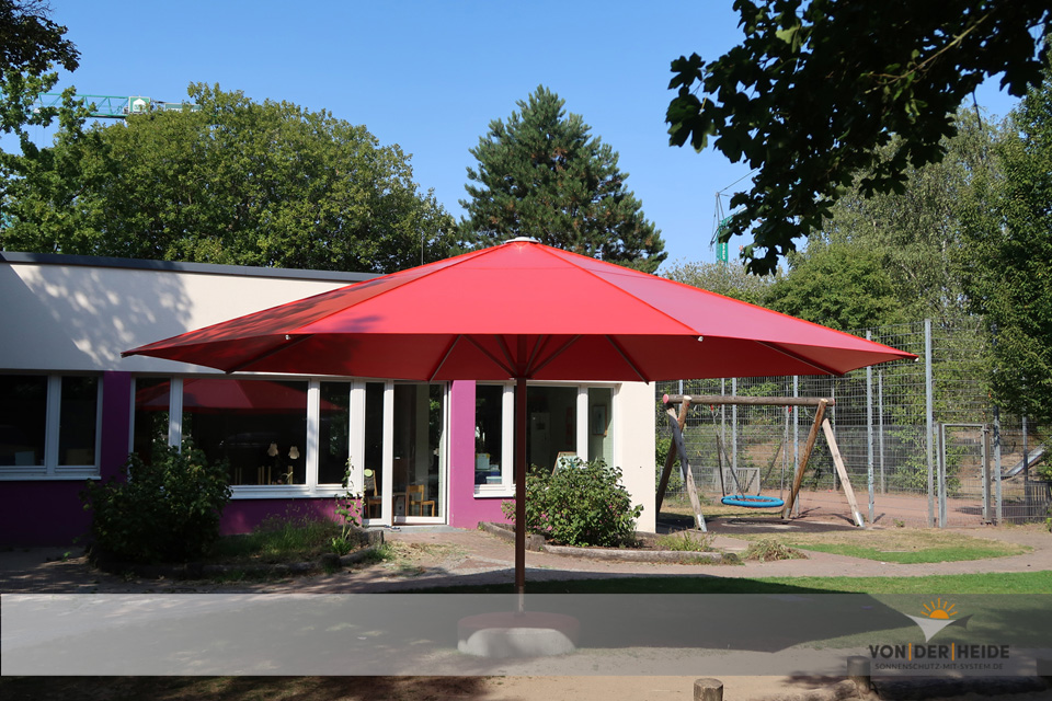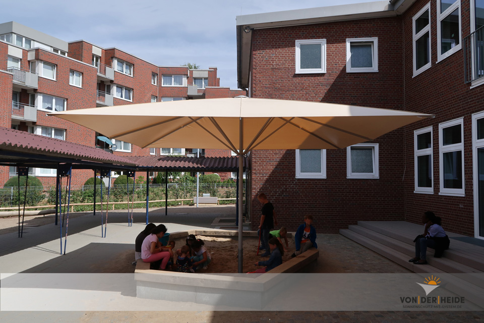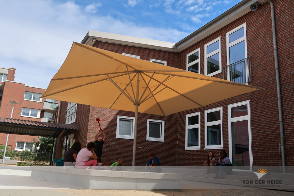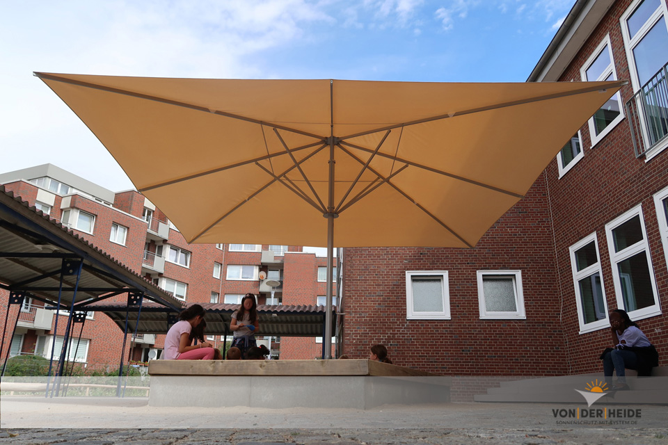 Vier Profi-Großschirme bieten UV-Schutz auf dem Schulhof dieser Schule in Kiel