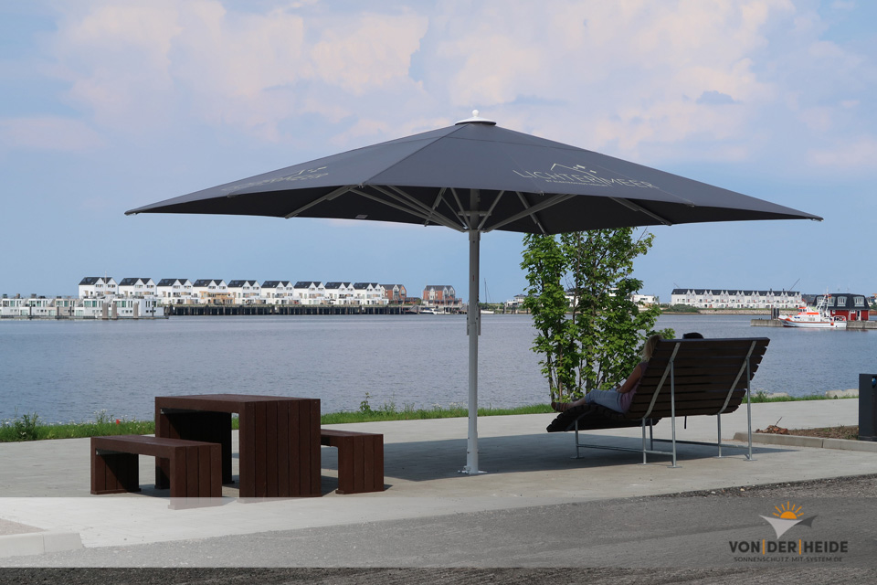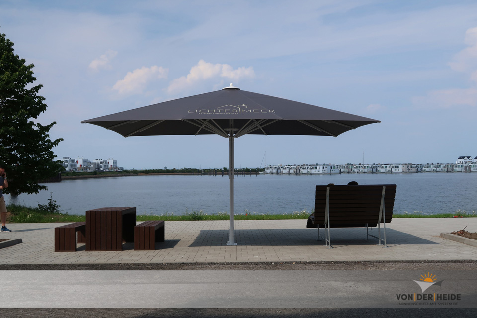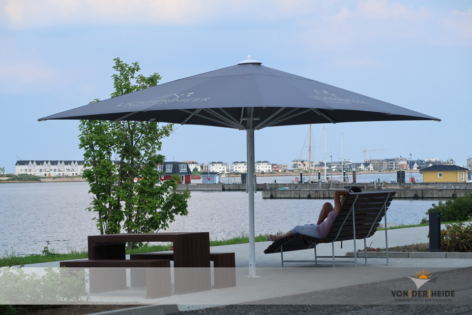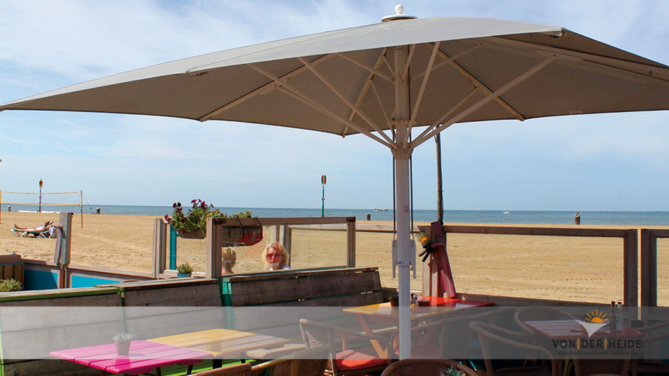 Windstabiler Sonnenschirm quadratisch. Bahama-Jumbrella XL Großschirm am Meer, Farbe beige mit Heizungen und Regenrinne