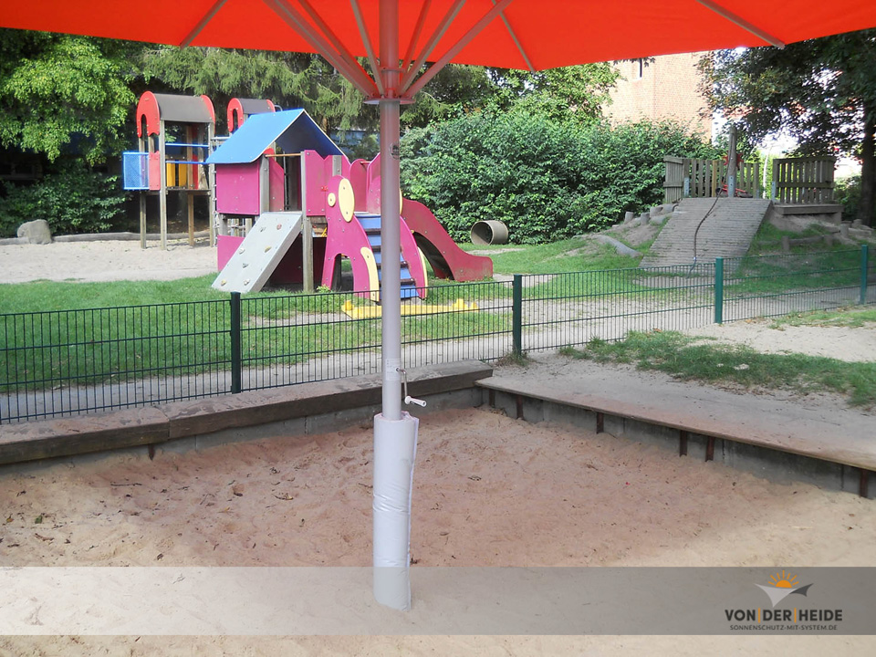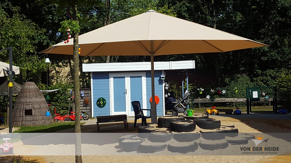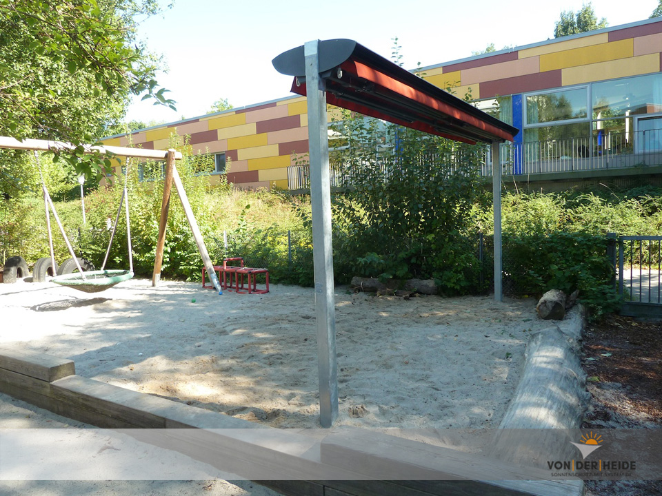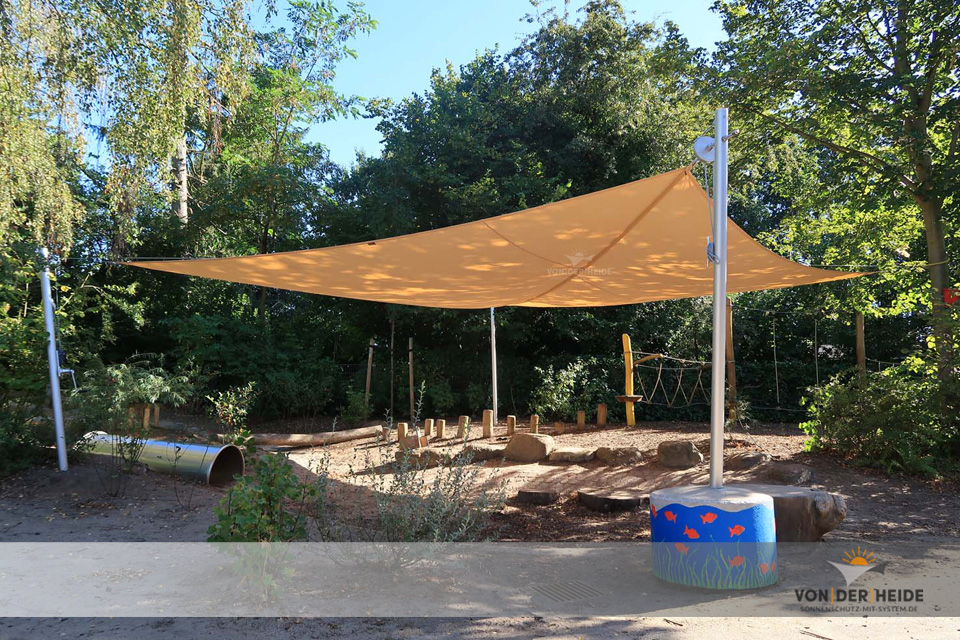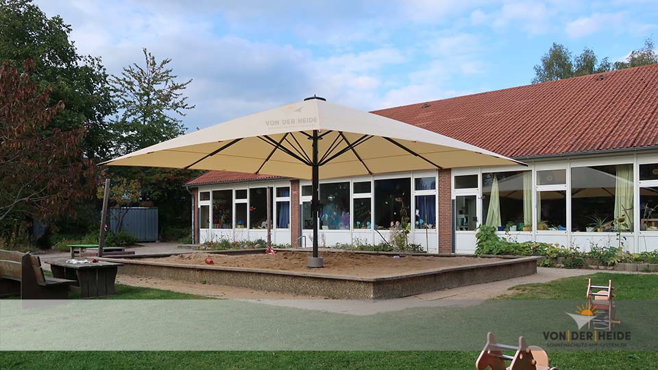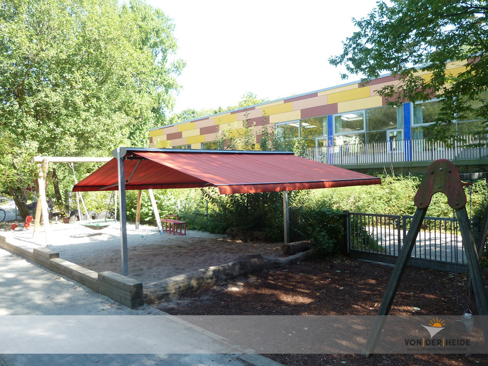 Ob über Sandkisten, Spielgeräten oder Sitzplätzen. Wir sorgen für Sonnenschutz Ihrer Kinder. Hier manuell aufrollbares Sonnensegel