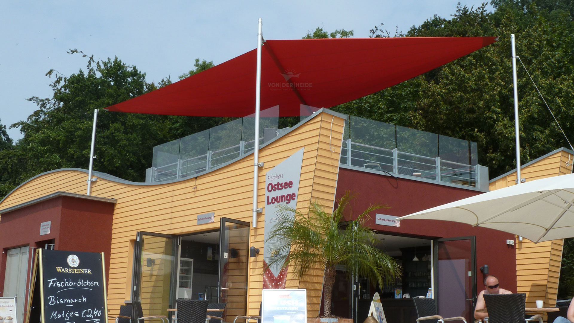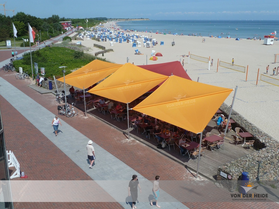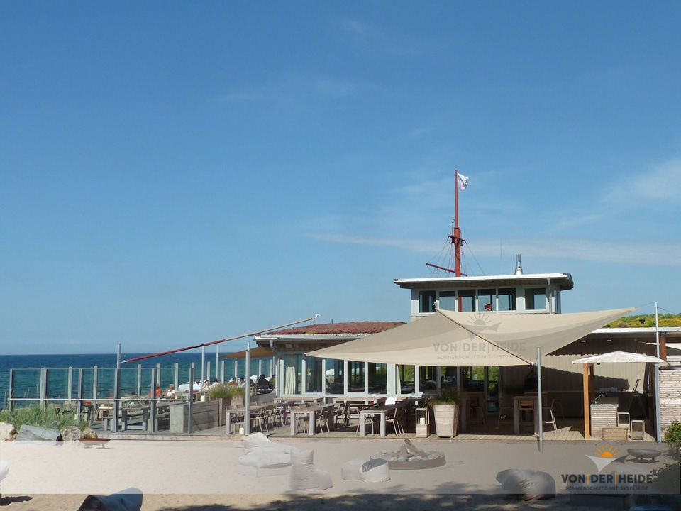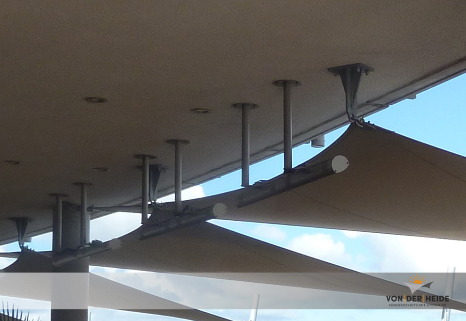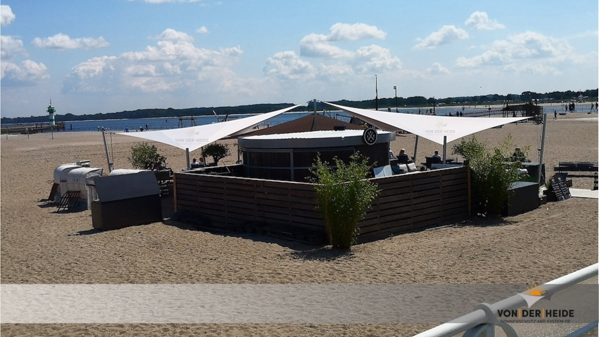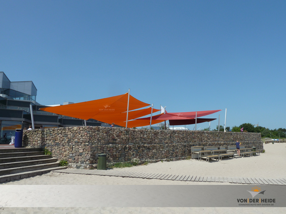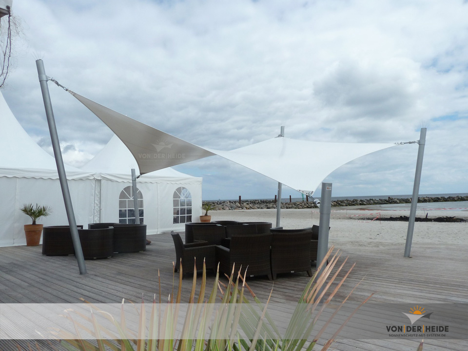 Sonnensegel mit individuell angefertigten Deckenkonsolen befestigt. AHOI Scharbeutz