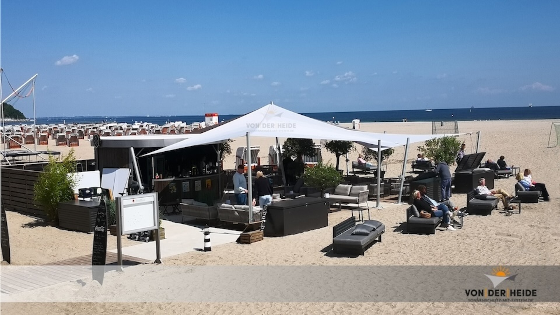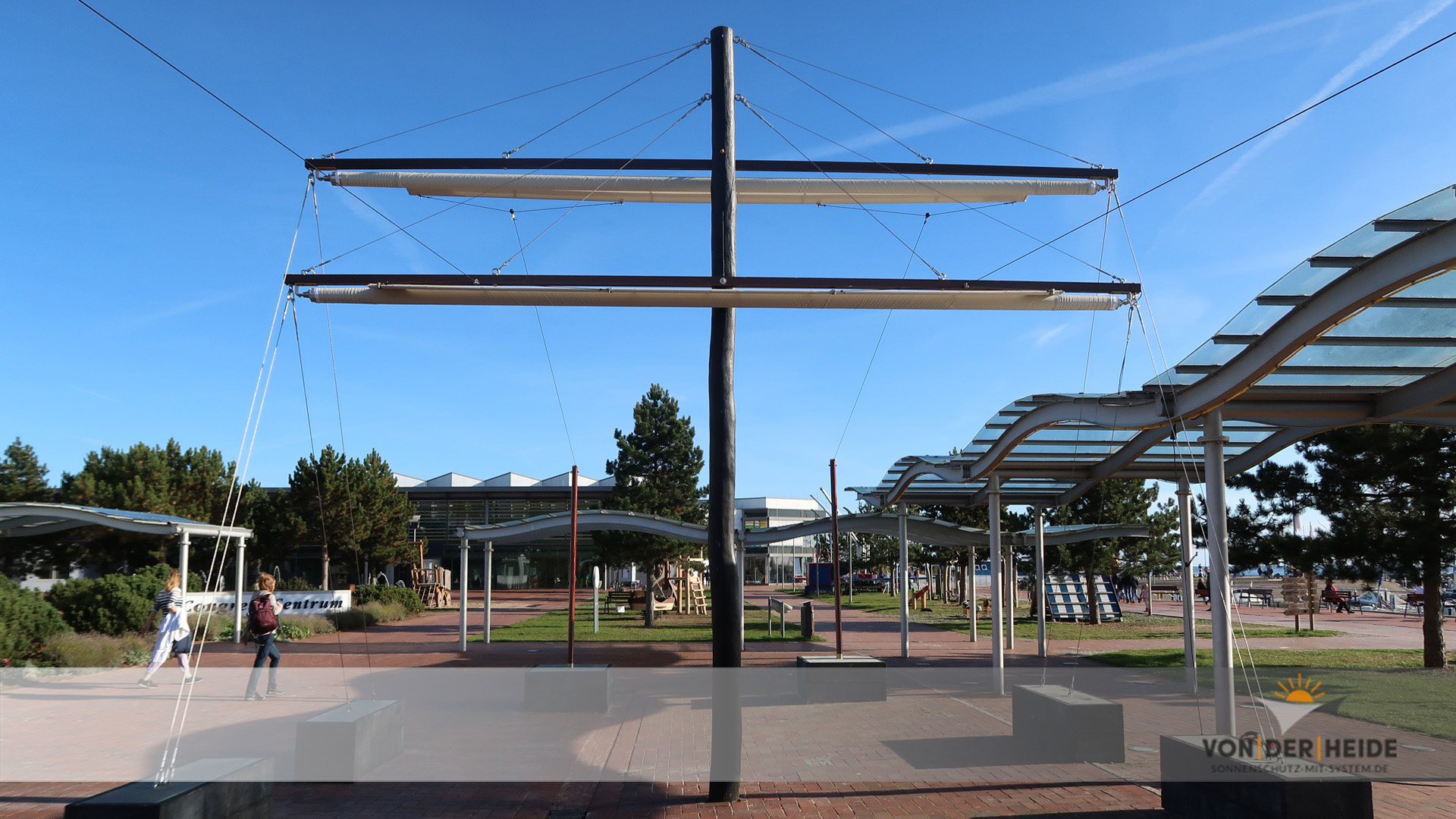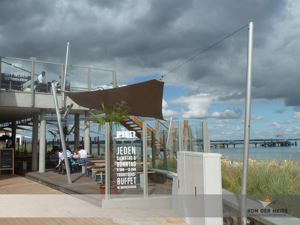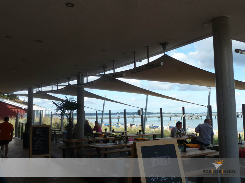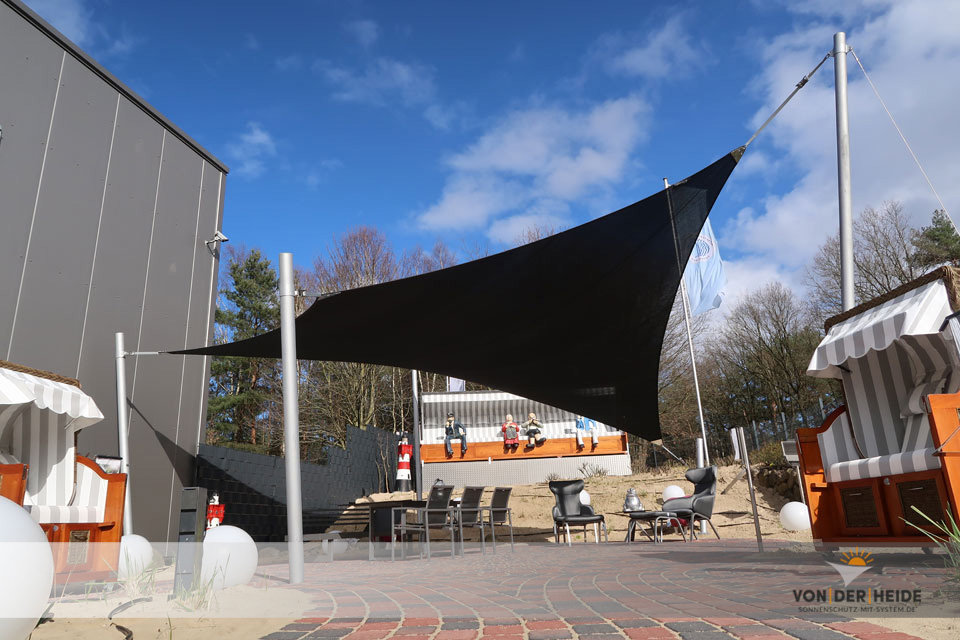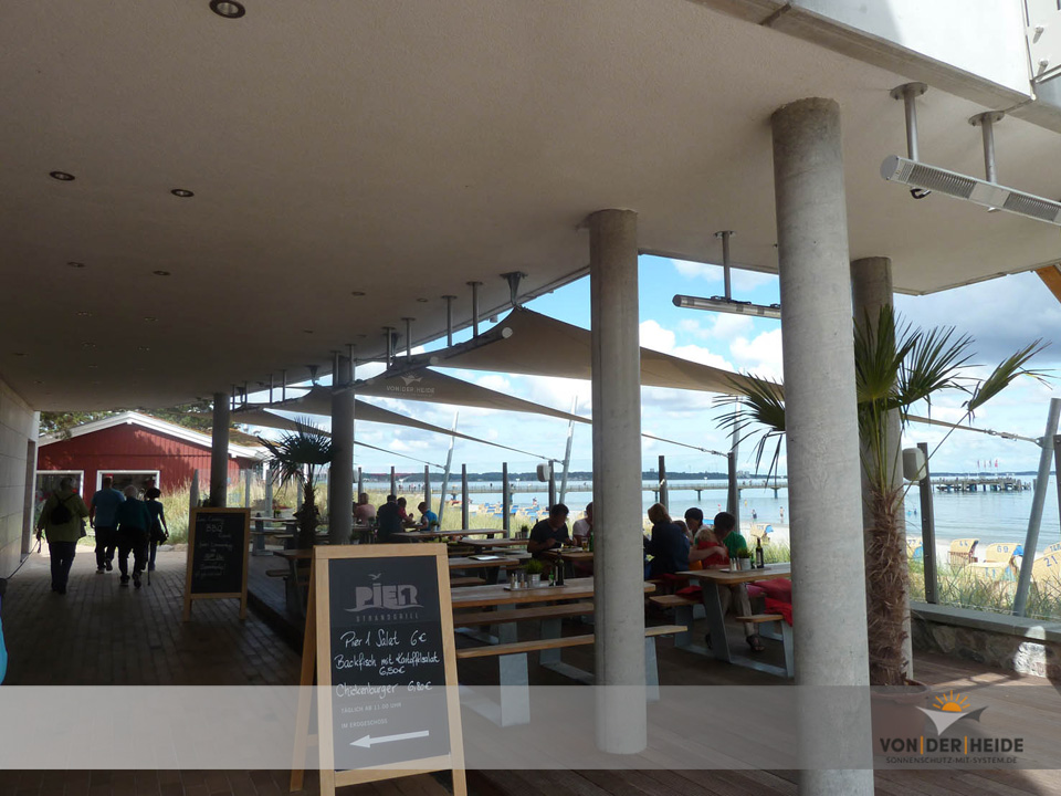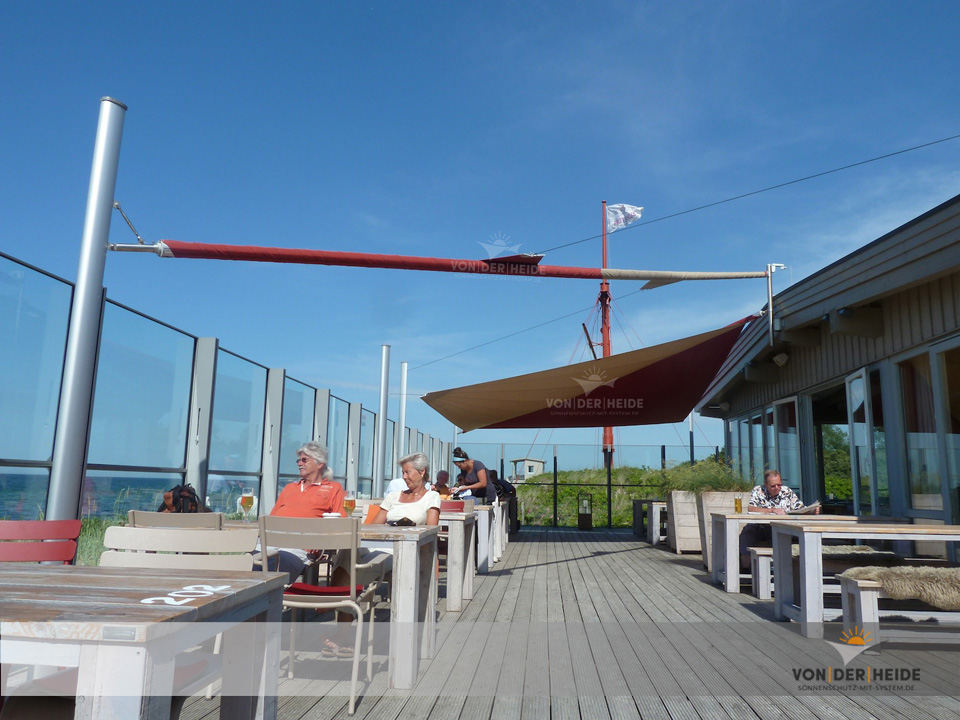 Sonnensegel mit individuell angefertigten Deckenkonsolen befestigt. AHOI Scharbeutz