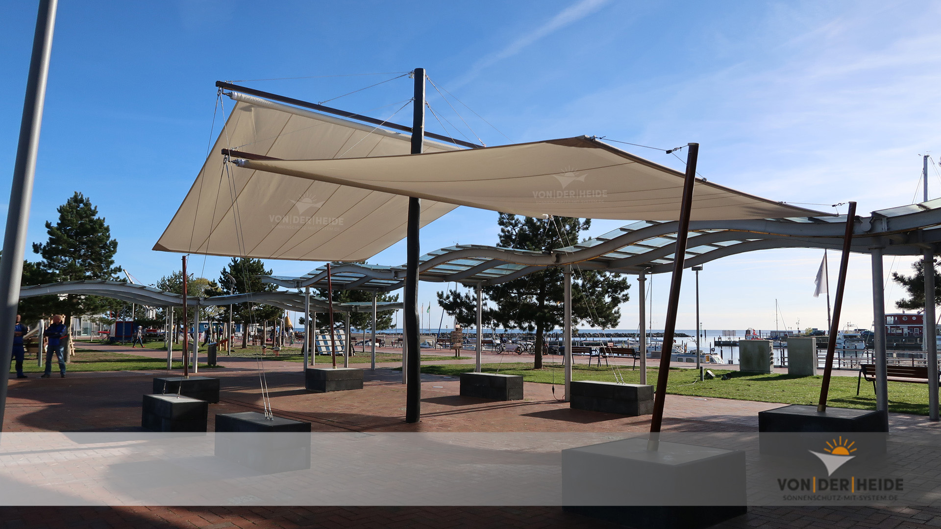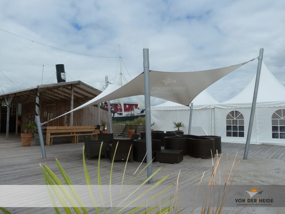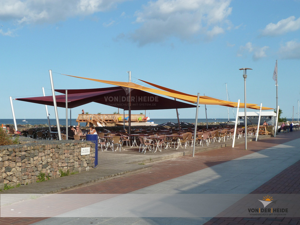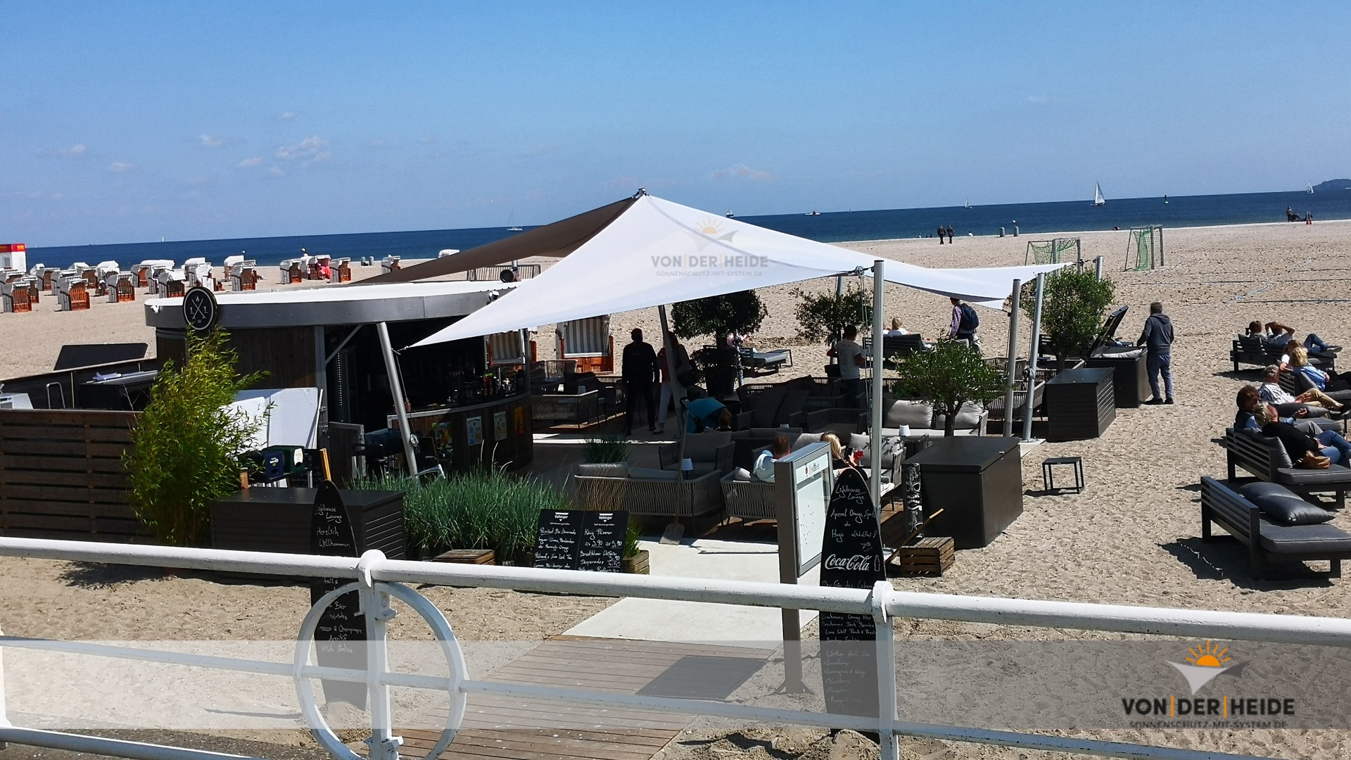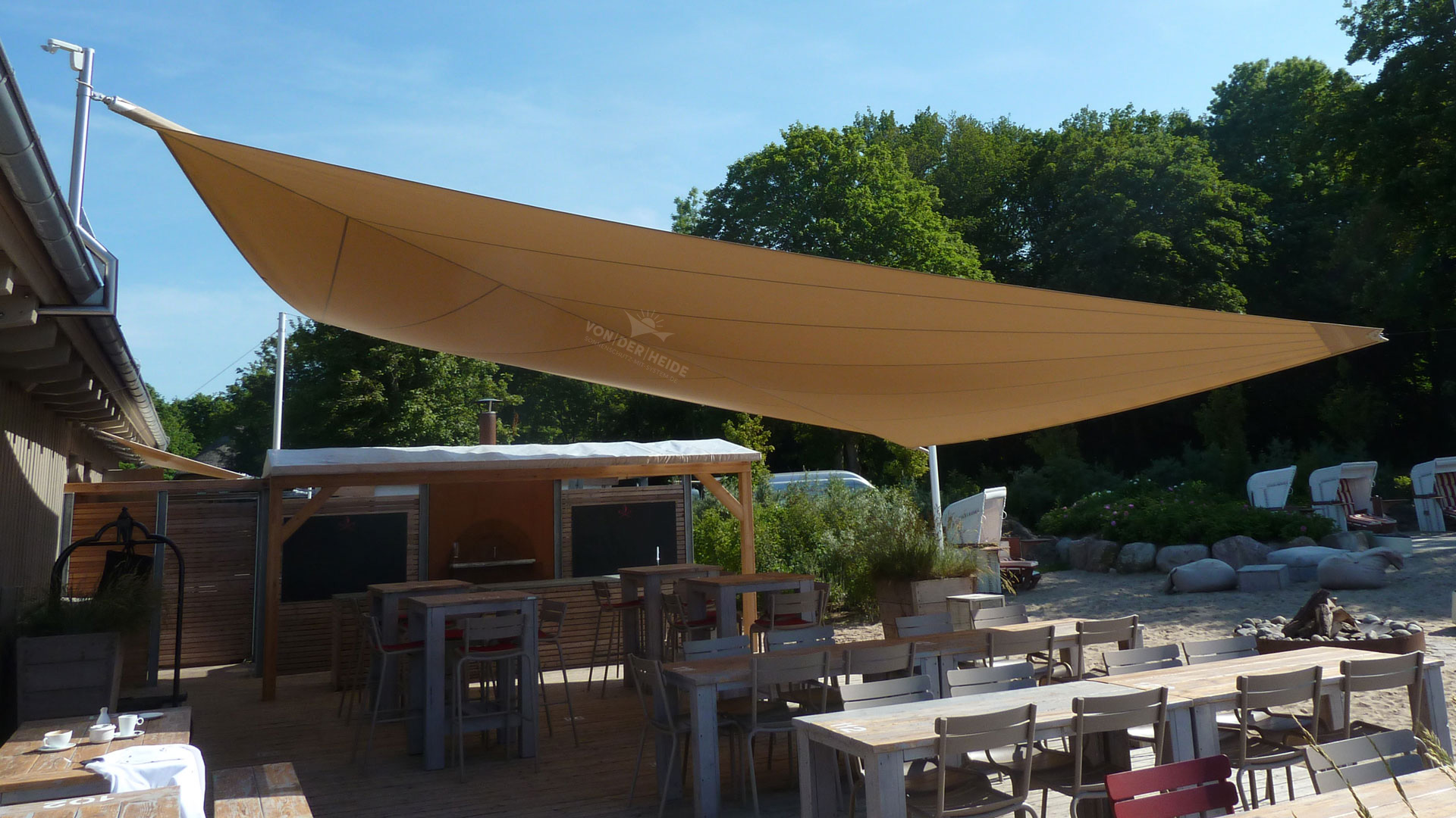 Sonnensegel mit individuell angefertigten Deckenkonsolen befestigt. AHOI Scharbeutz