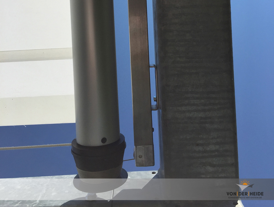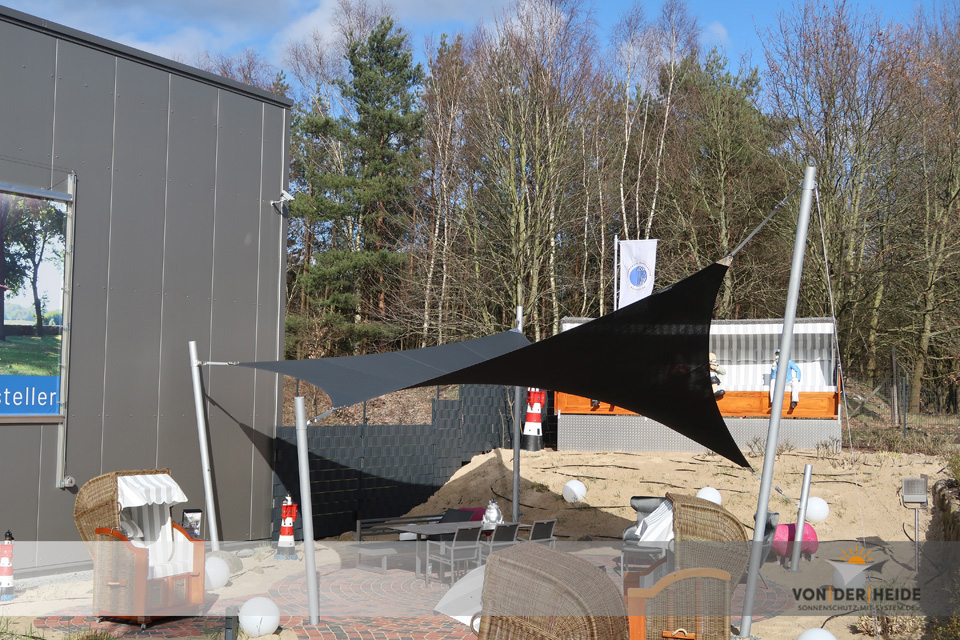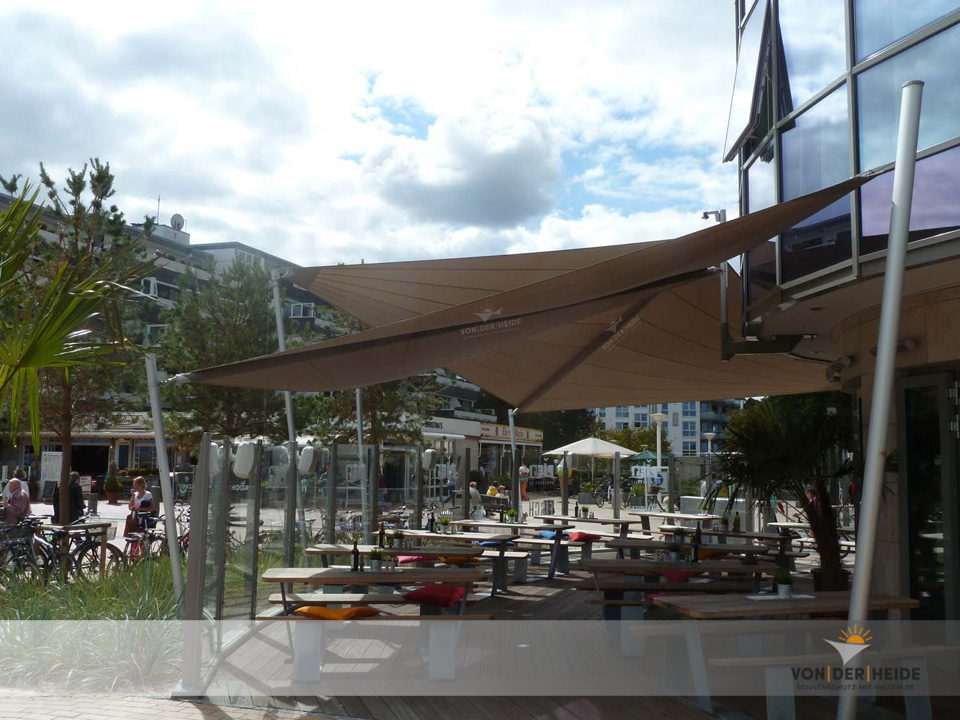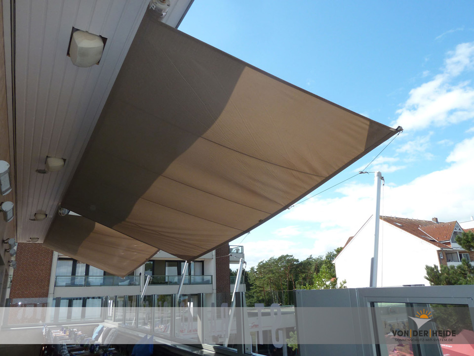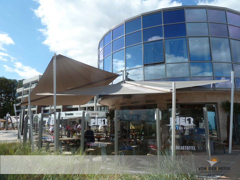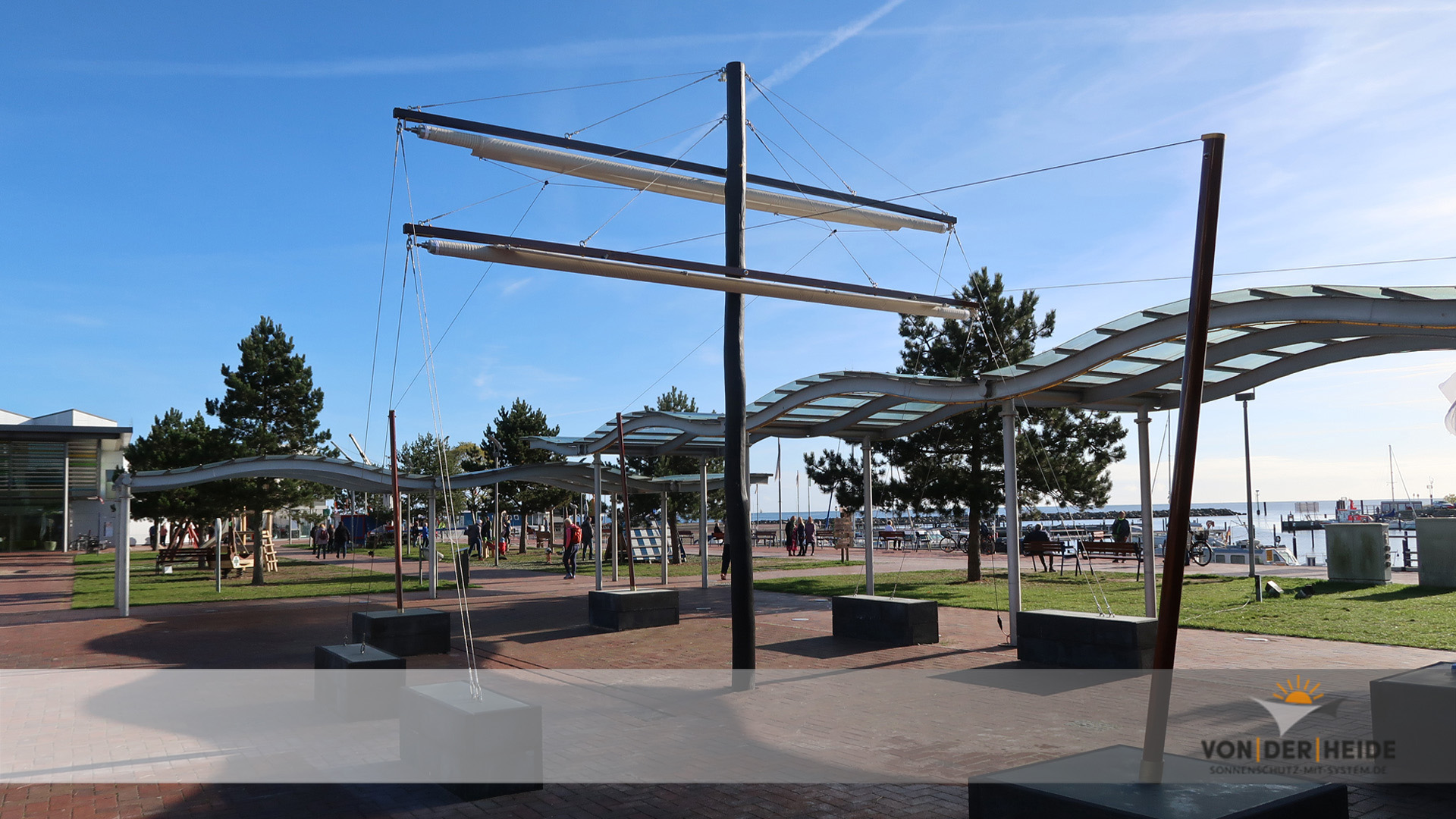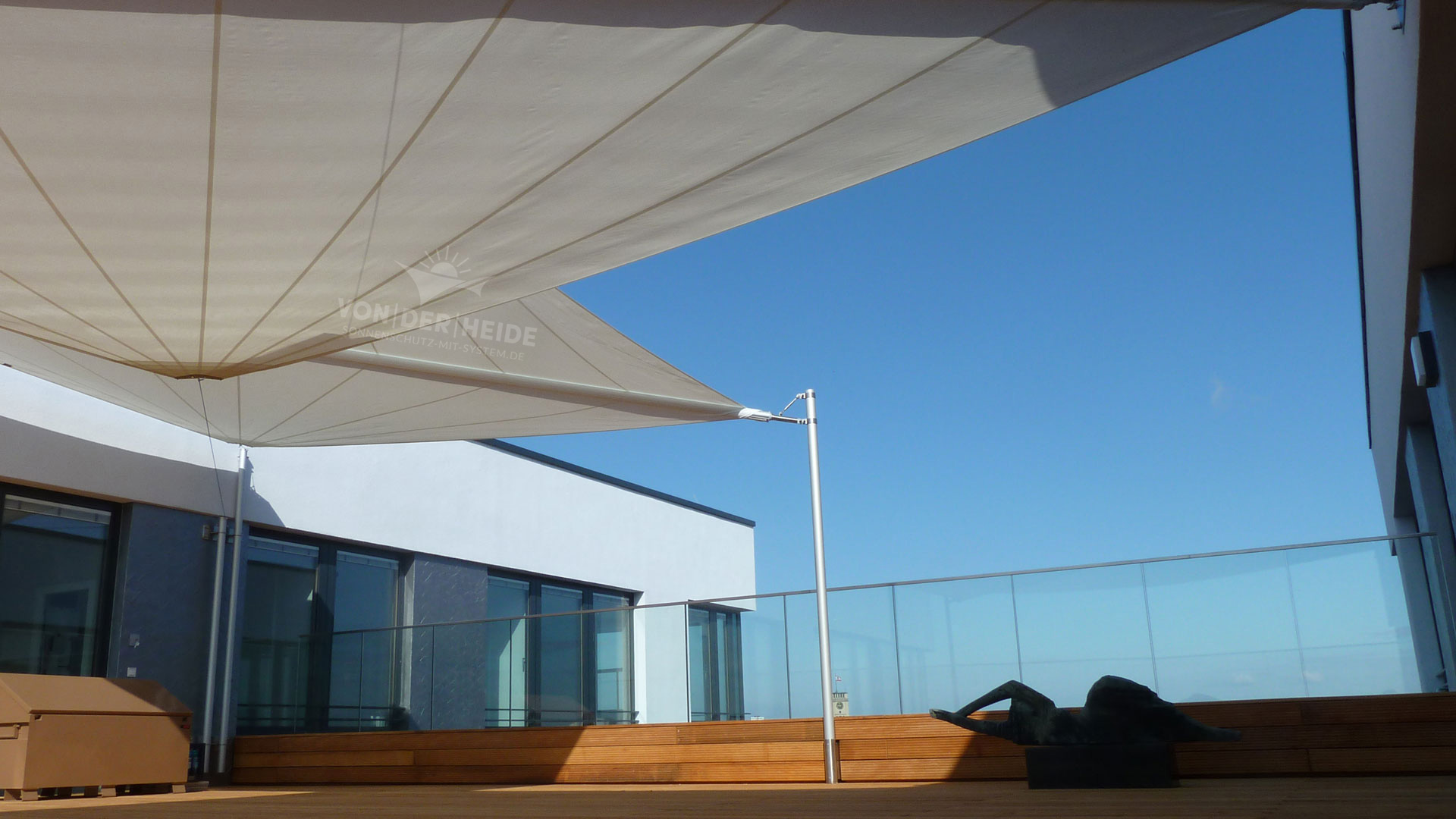 Sonnensegel mit individuell angefertigten Deckenkonsolen befestigt. AHOI Scharbeutz