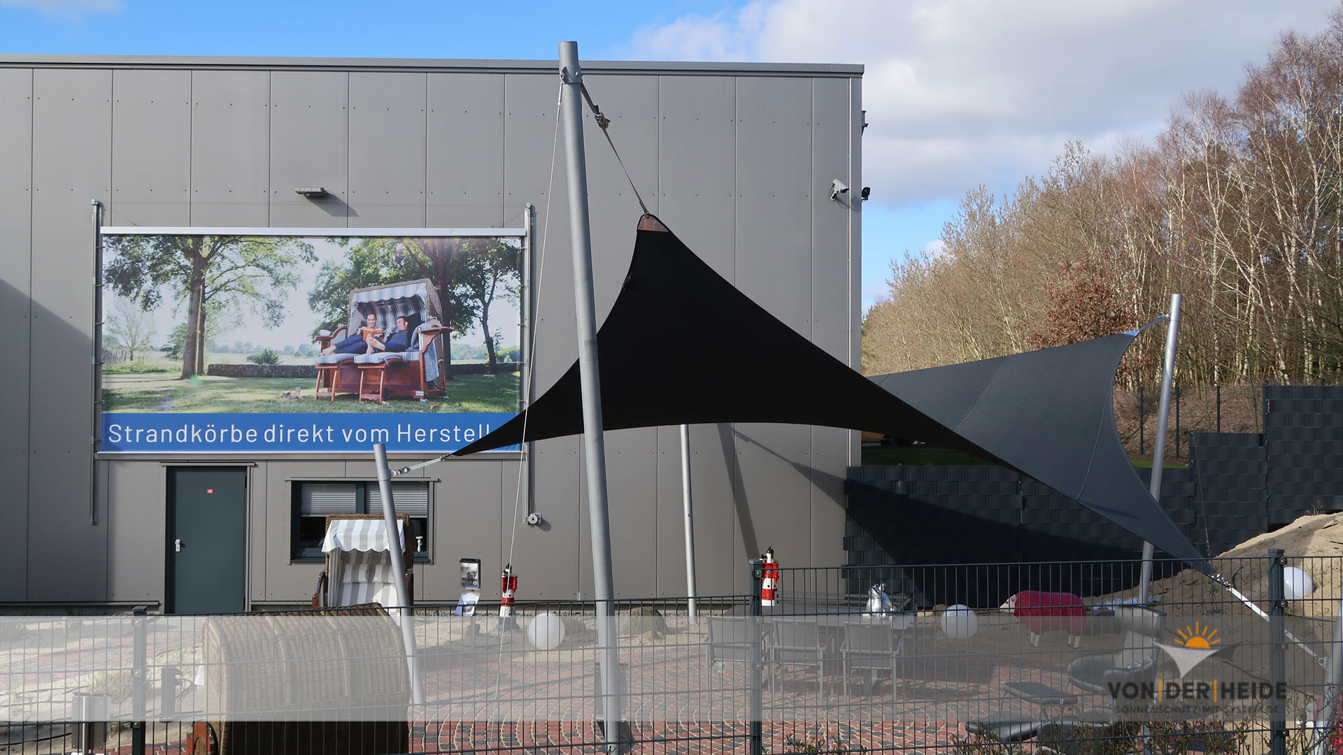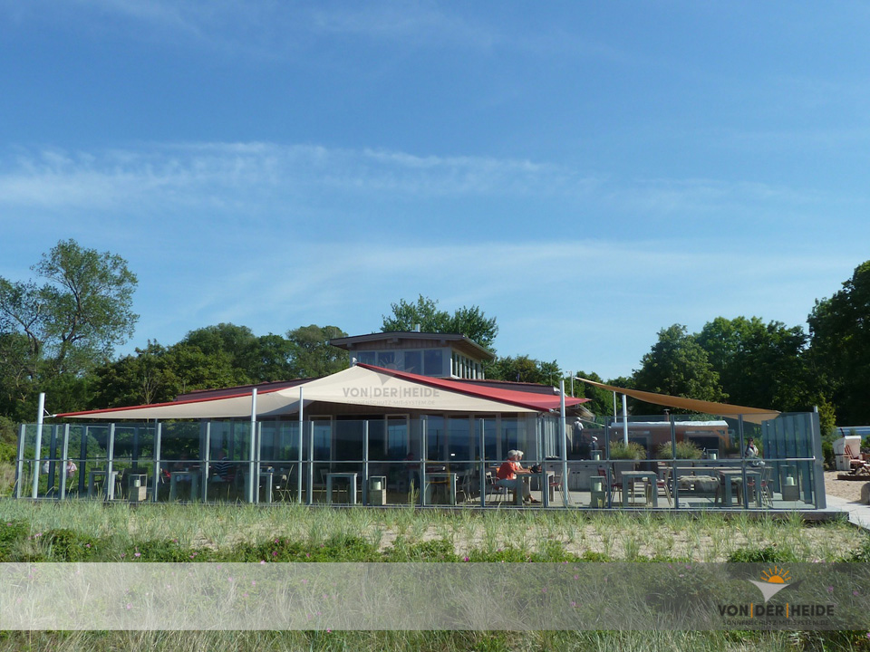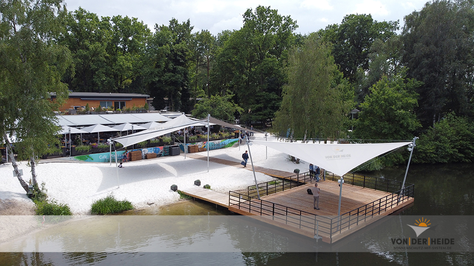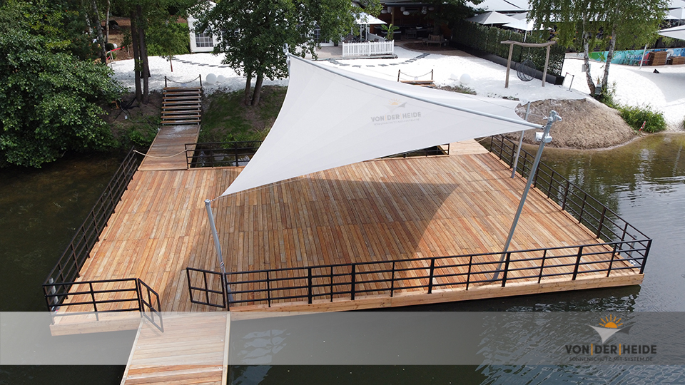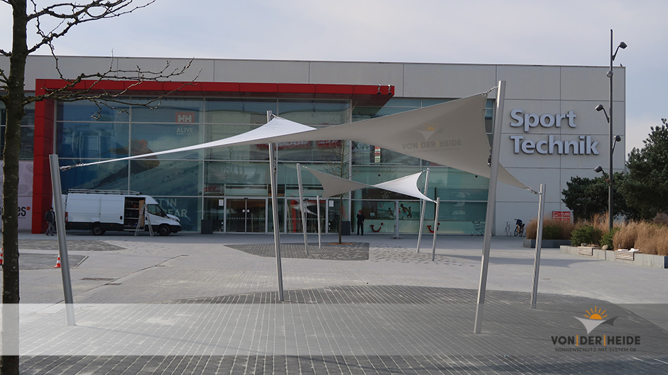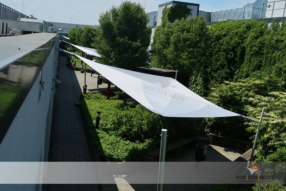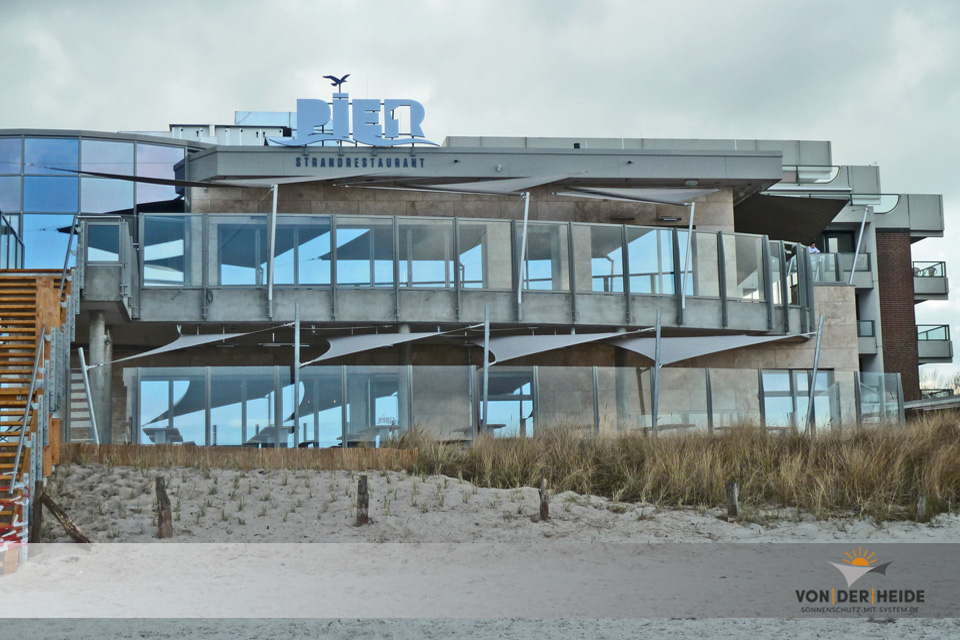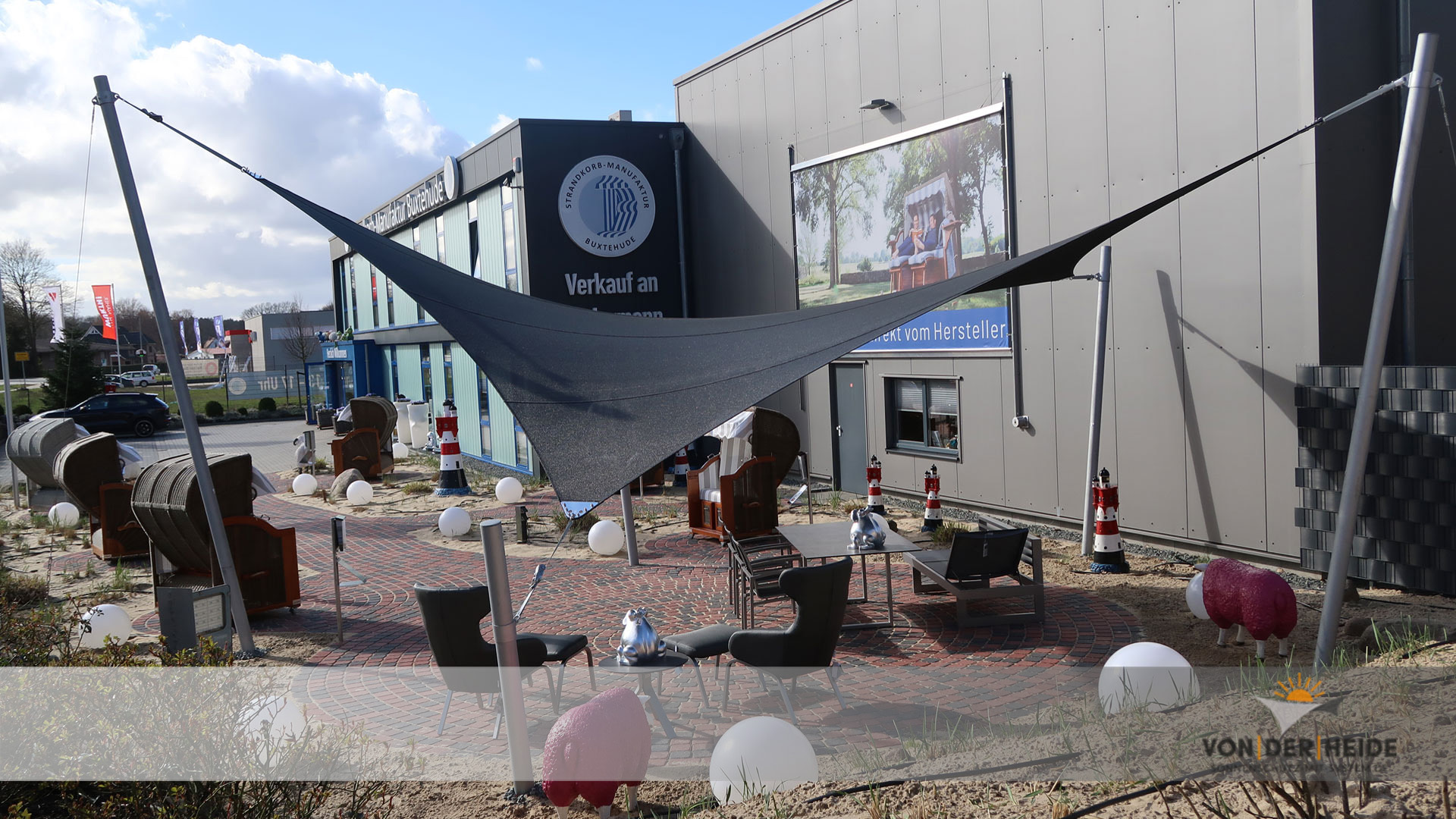 Sonnensegel mit individuell angefertigten Deckenkonsolen befestigt. AHOI Scharbeutz