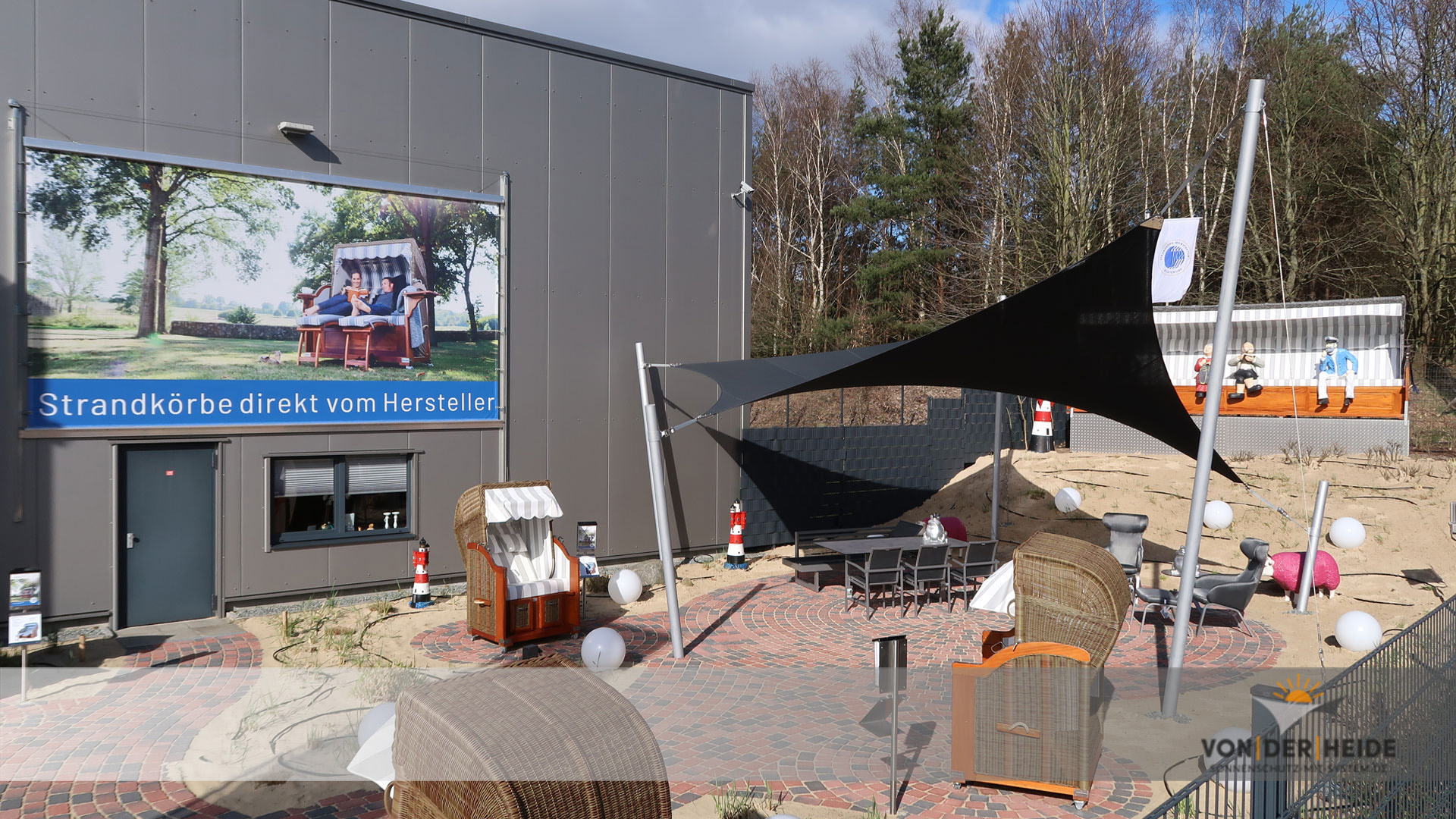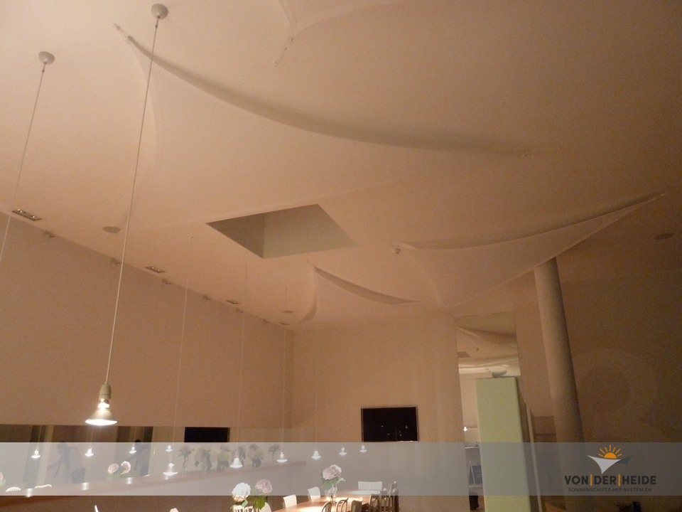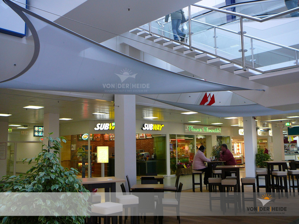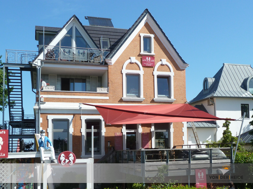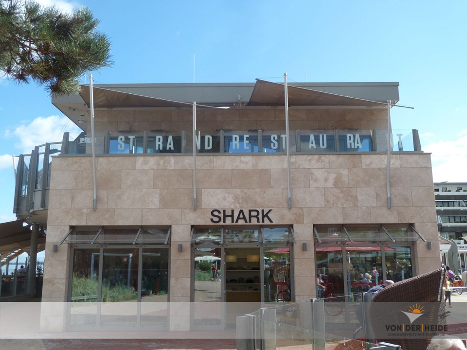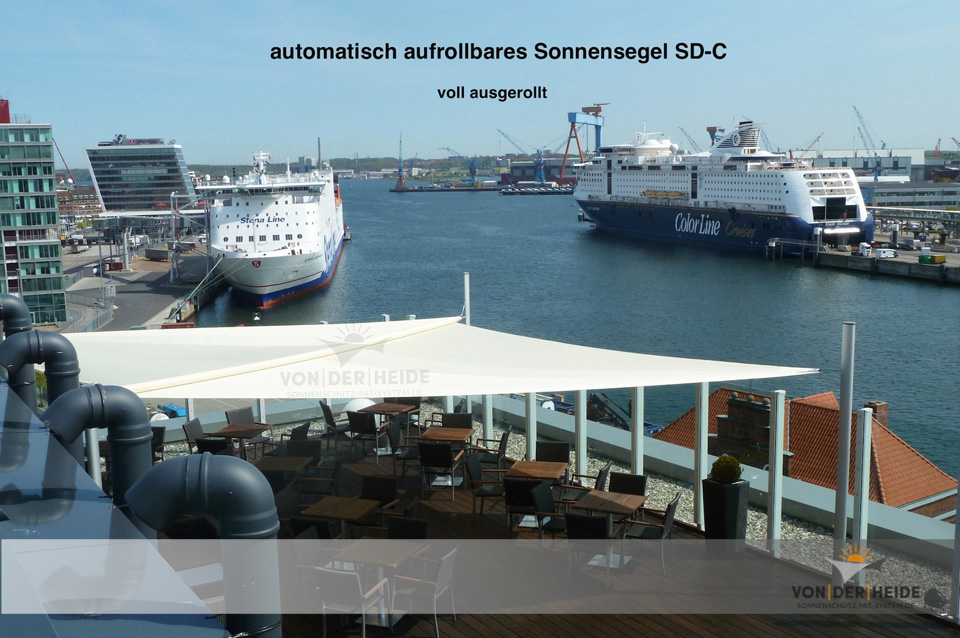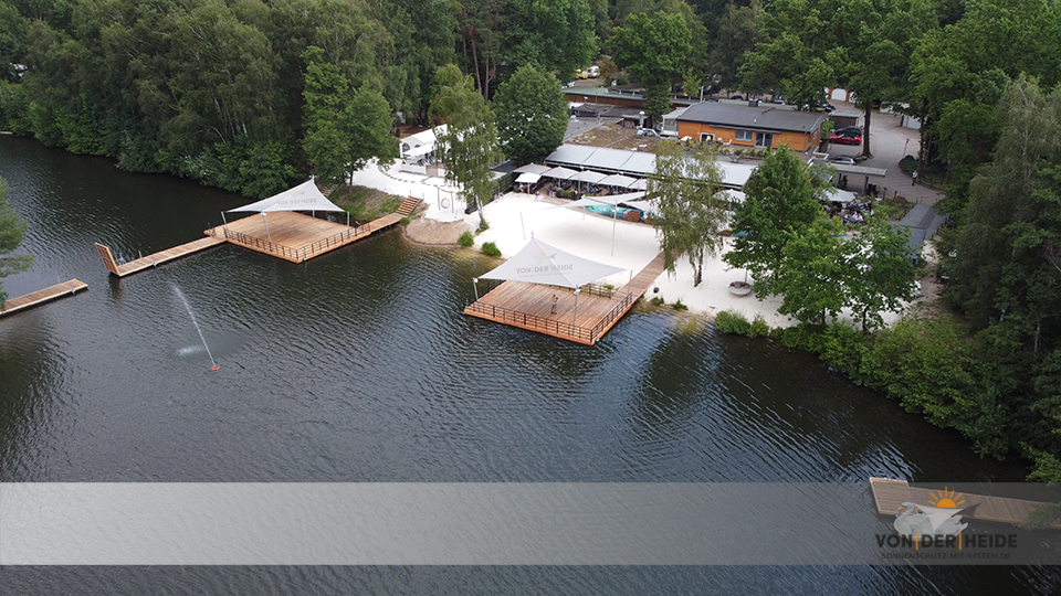 Sonnensegel mit individuell angefertigten Deckenkonsolen befestigt. AHOI Scharbeutz