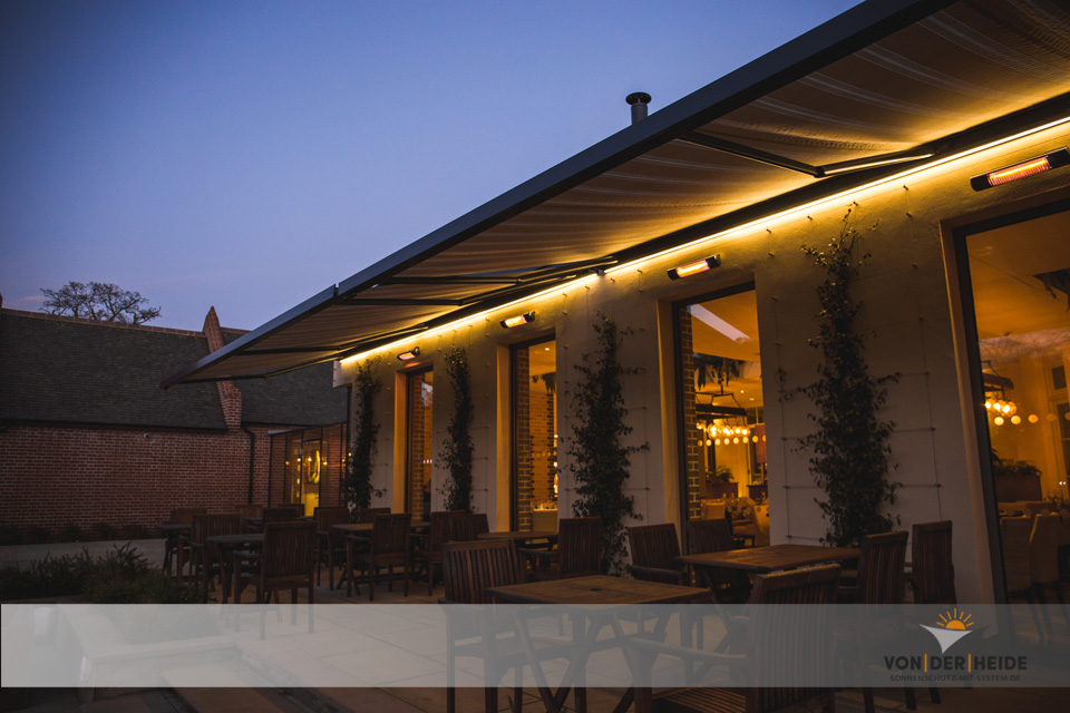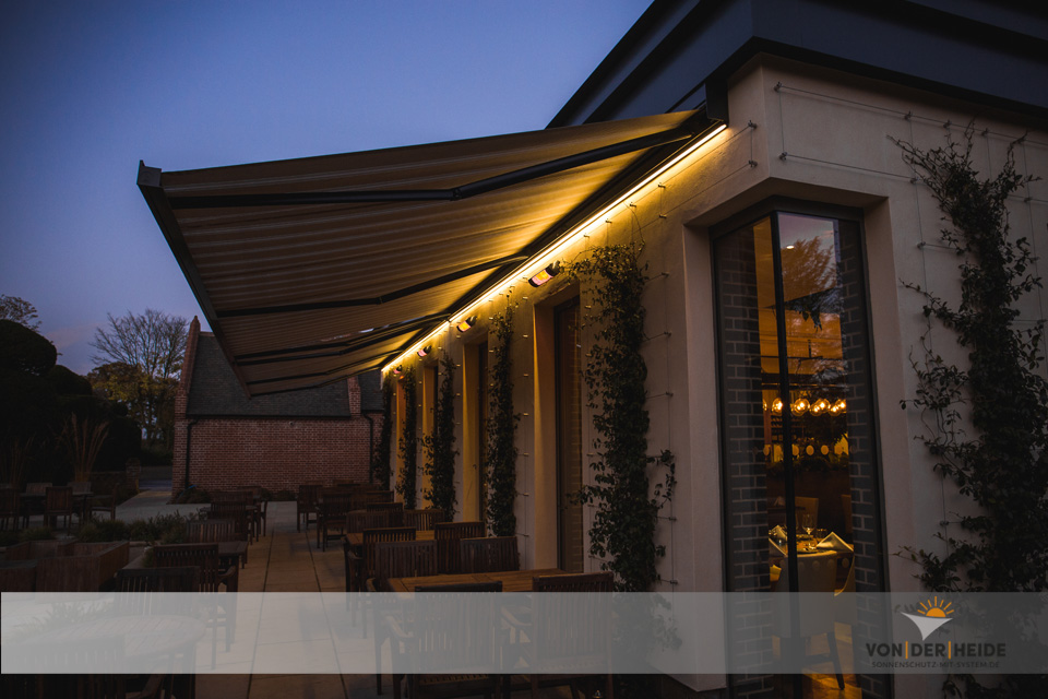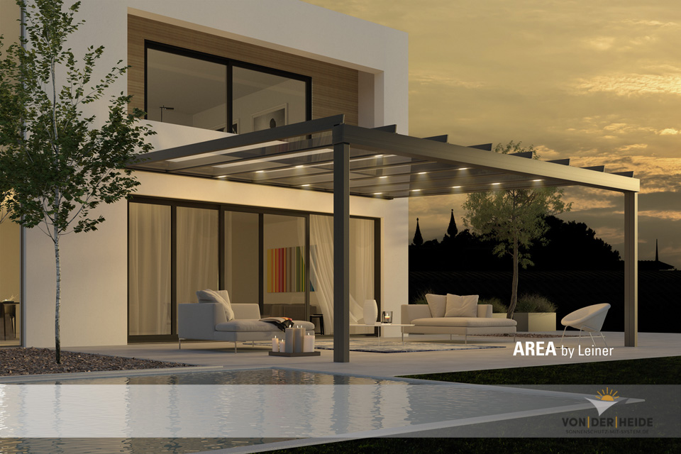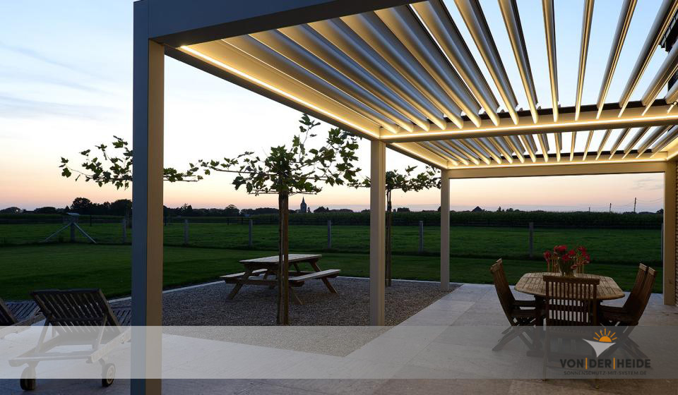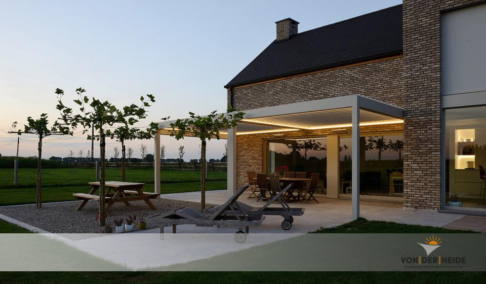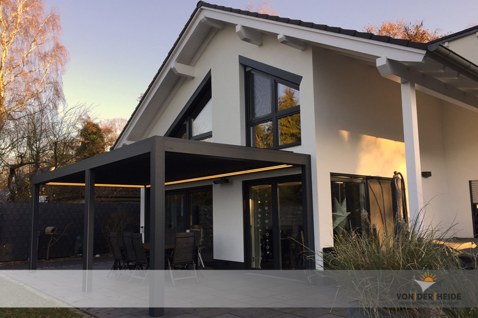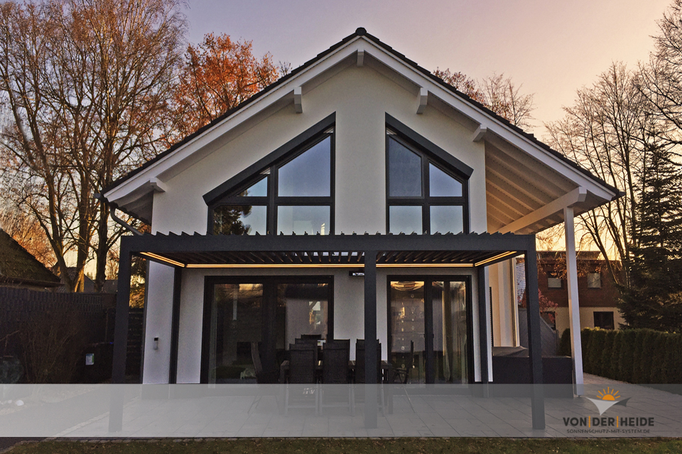 Dieses doppelte Lamellendach wurde an einem Haus mit WDVS-Fassade montiert. Stimmungsvolle Beleuchtung mittels LED.