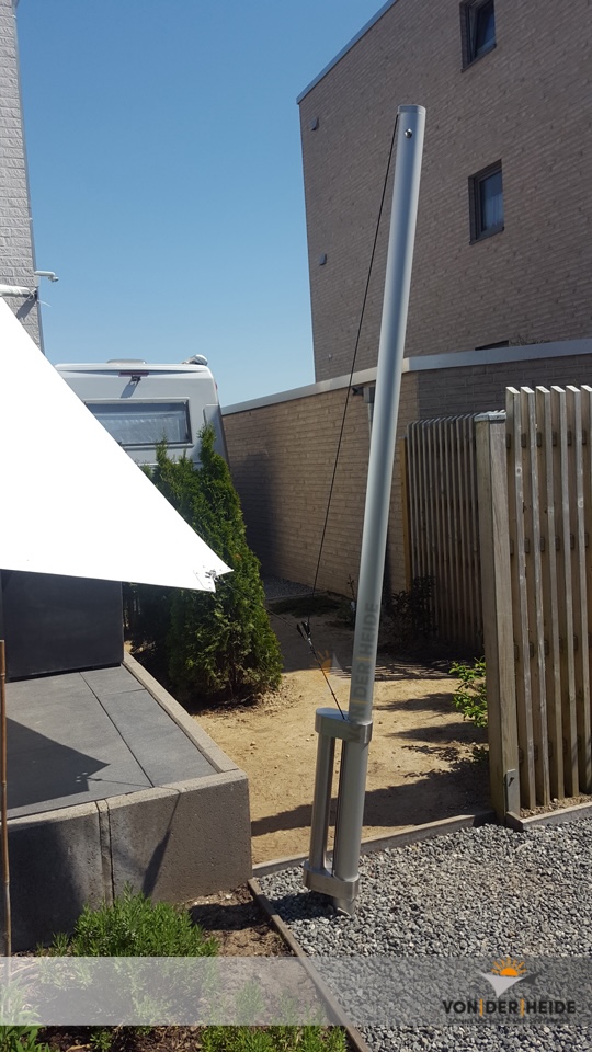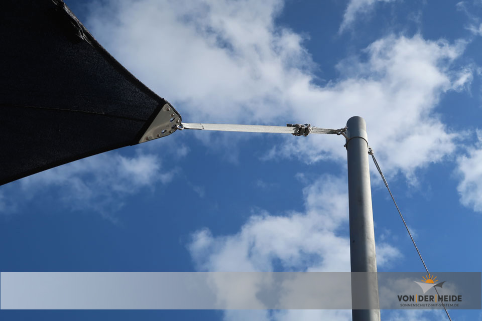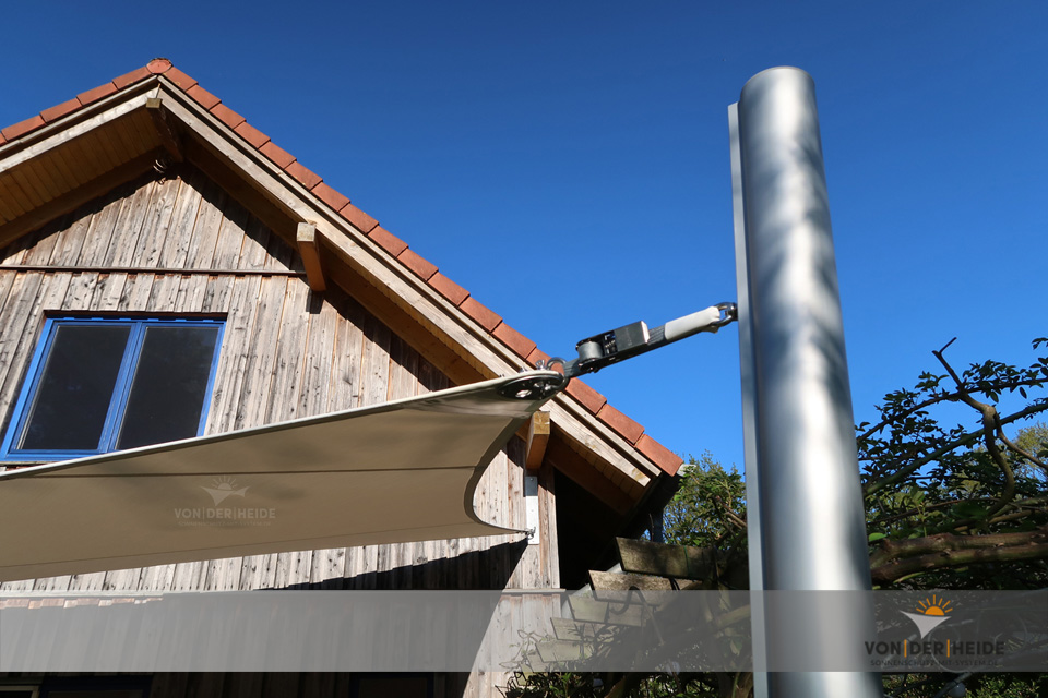 Ein Mast wurde durch eine Öffnung über das Dach geführt und an der Giebelwand montiert. Der Klempner oder Dachdecker dichtet den Mast-Dachanschluss ab. Individuelle Lösung mit Sonnensegel.