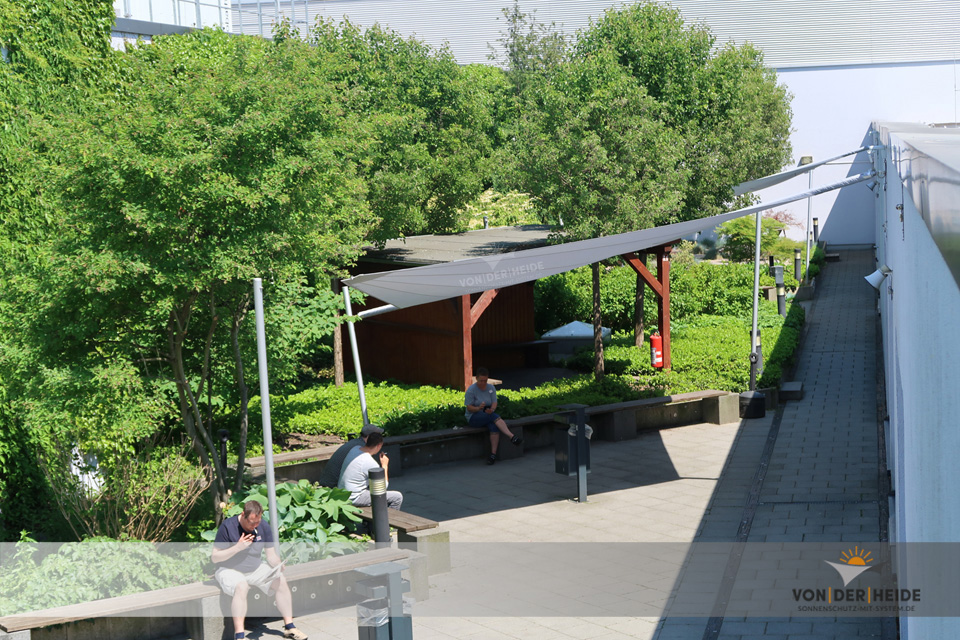 Raff-Sonnensegel von Soliday in Klinik. Auch für Sonnenschutz in Seniorenanlagen geeignet.