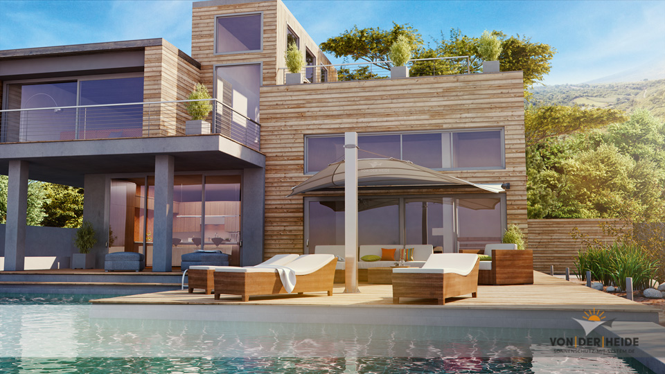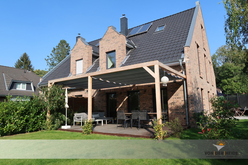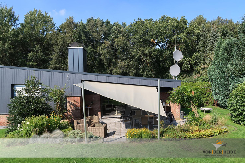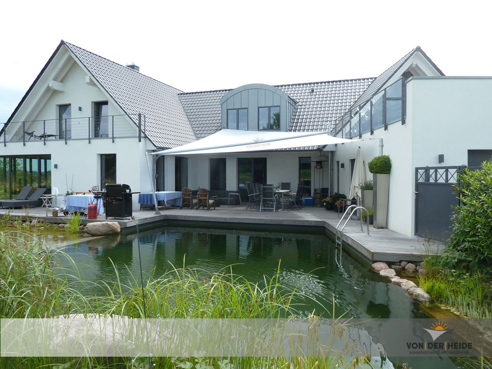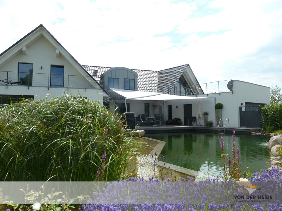 Aufrollbares Sonnensegel auf der Terrasse eines Wohnhauses mit Schwimmteich in Buxtehude