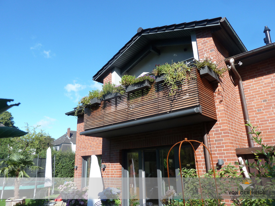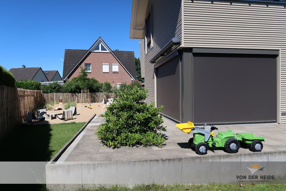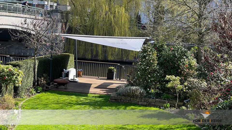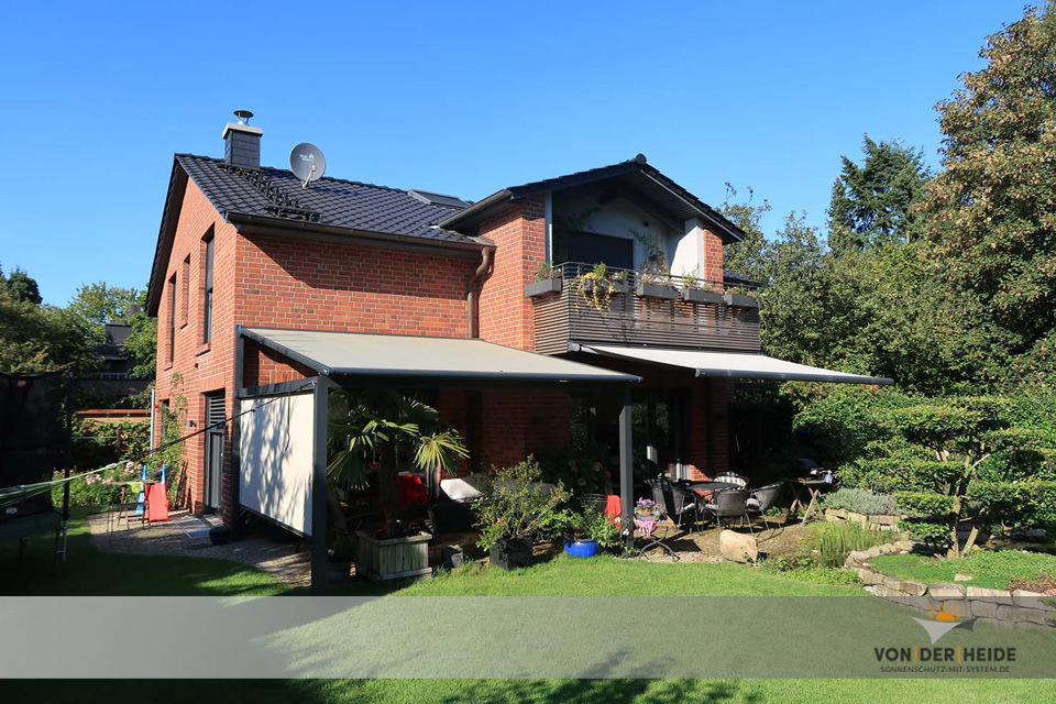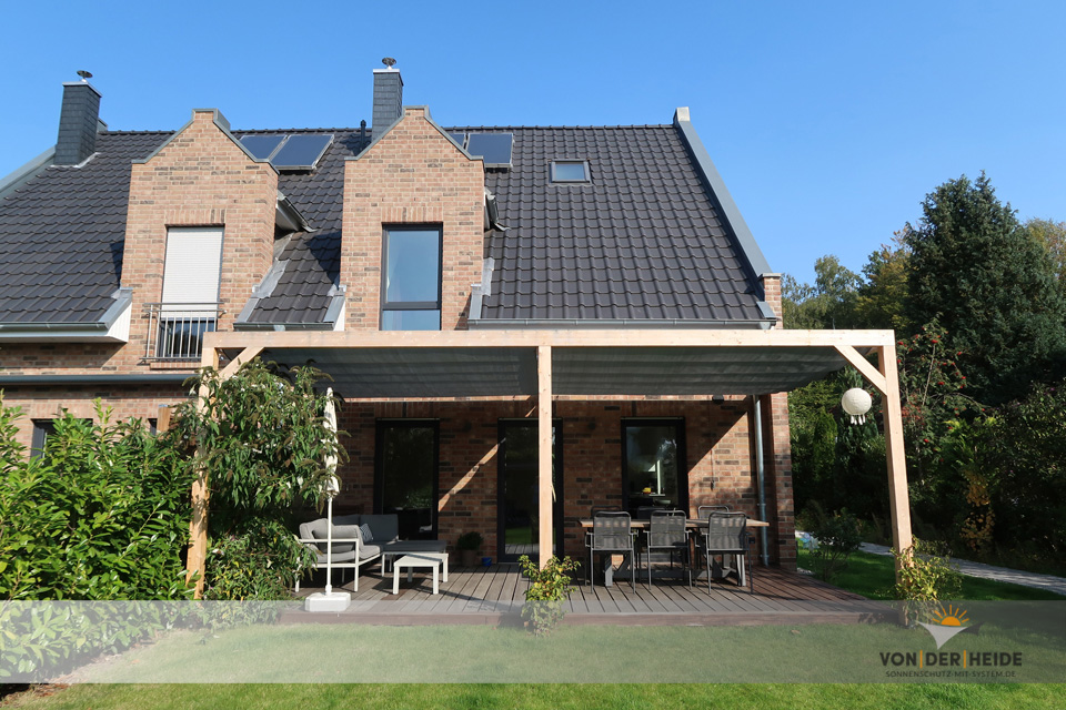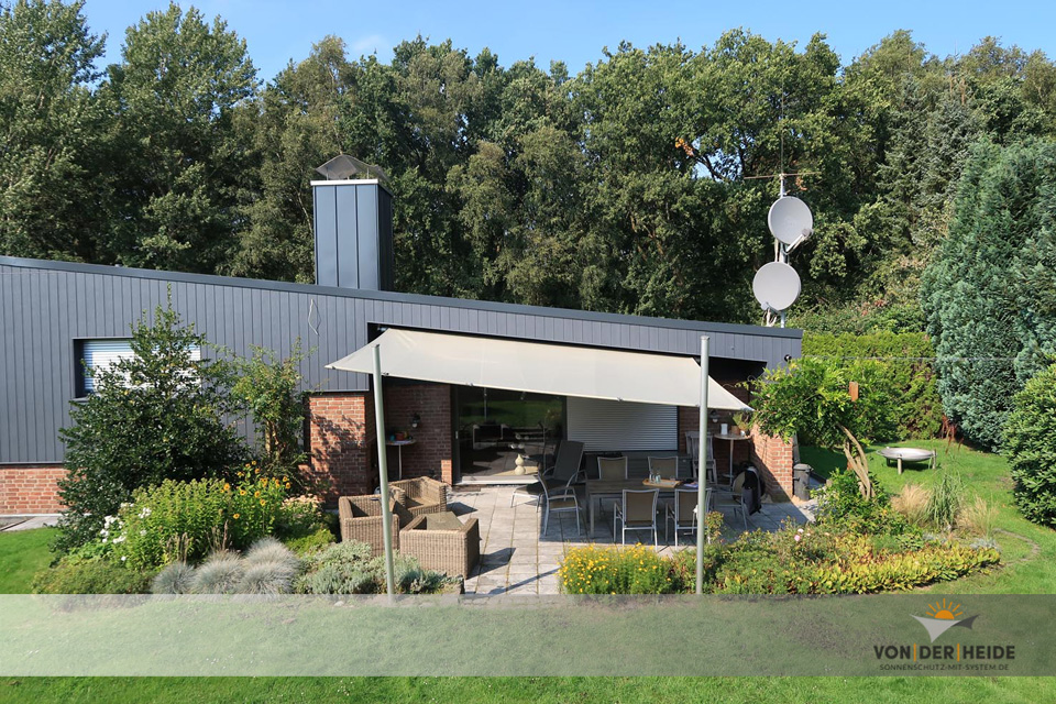 Aufrollbares Sonnensegel auf der Terrasse eines Wohnhauses mit Schwimmteich in Buxtehude