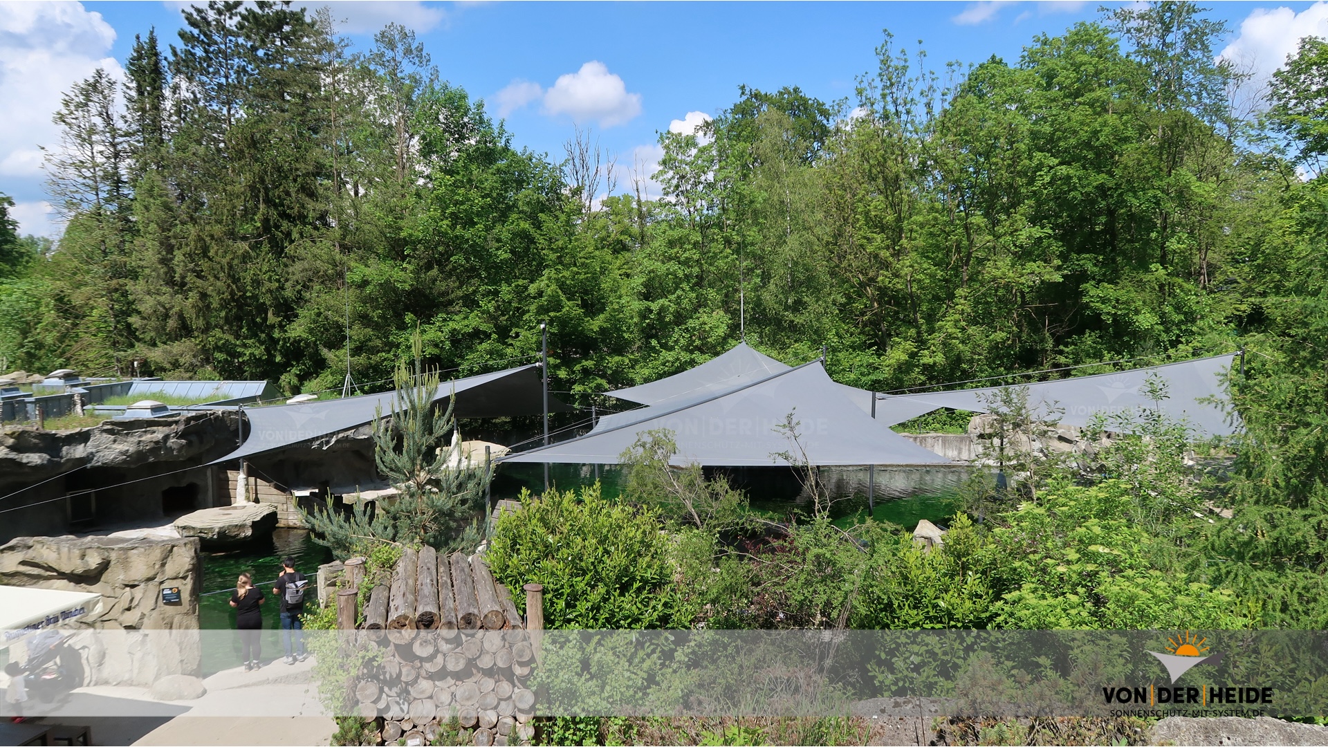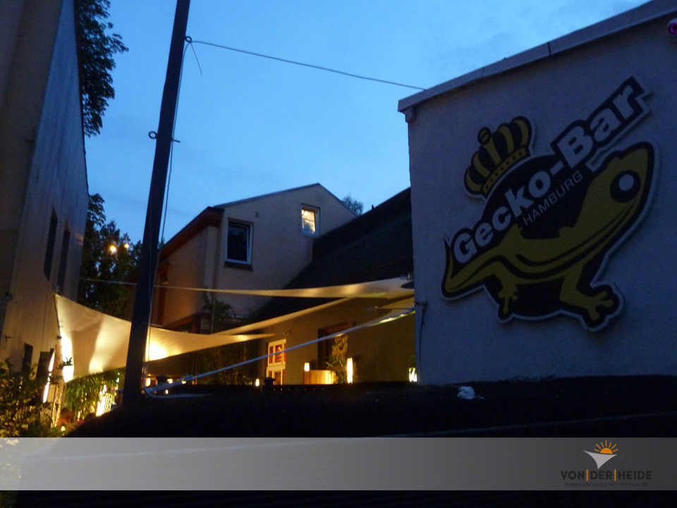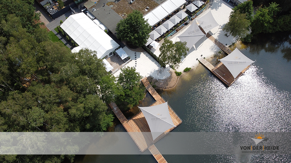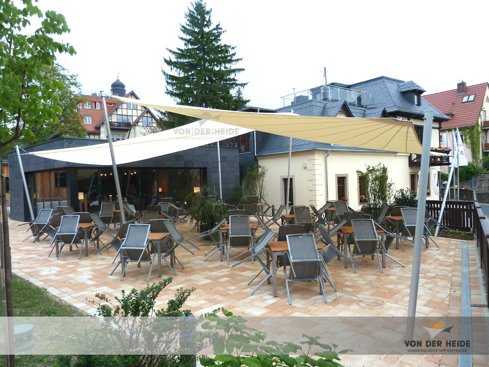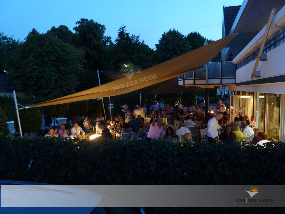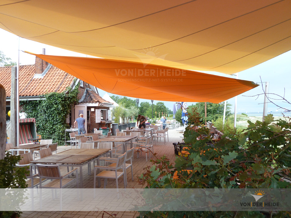 Diverse individuell eingepasste Sonnensegel Schützen die Gäste auf dem verschiedenen Terrassen der Gastronomie.