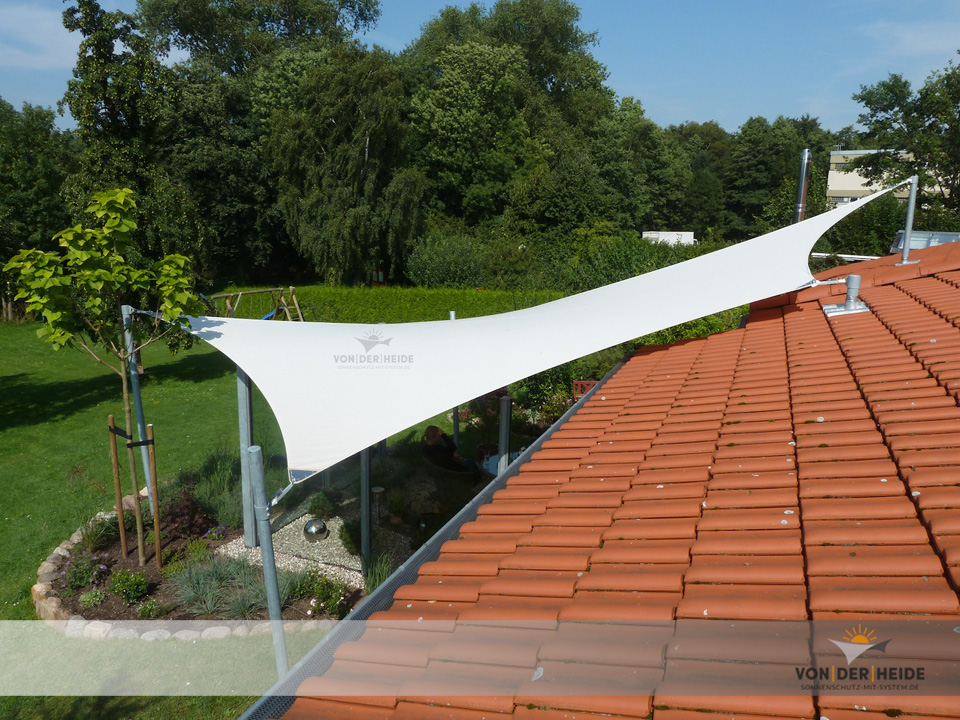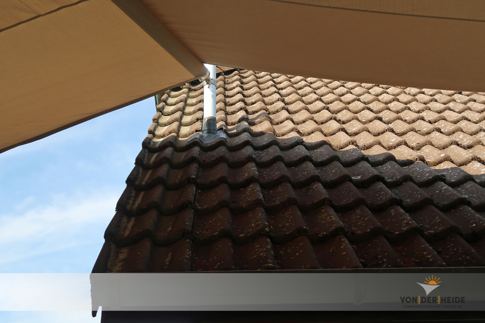 Wenn Ihre Wünsche definiert sind, erarbeiten wir gemeinsam die beste Lösung. Hier die Sonnensegel-Montage oberhalb des Dachüberstandes.
