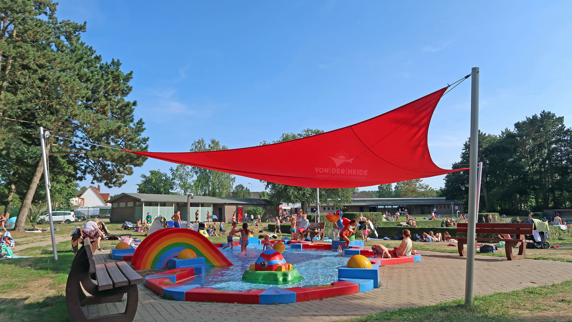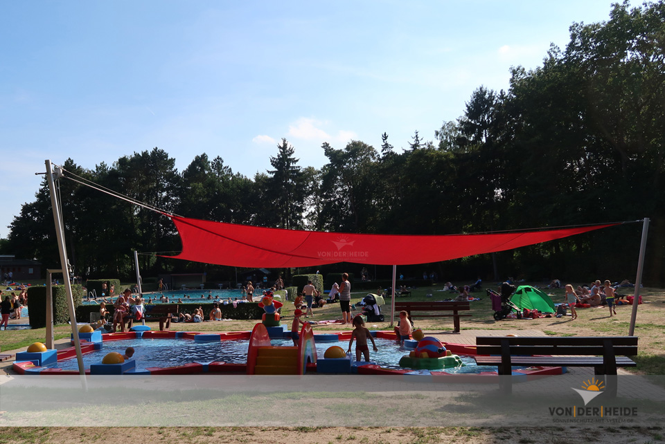 Rotes aufrollbares Sonnensegel über Planschbecken im Freizeitbad Schlutup in Lübeck