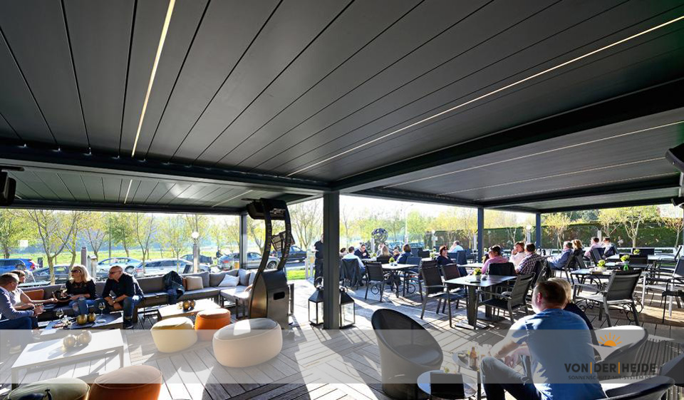 Pergola-Markise Markilux für Außensitzplatz einer Firma – Seitenansicht