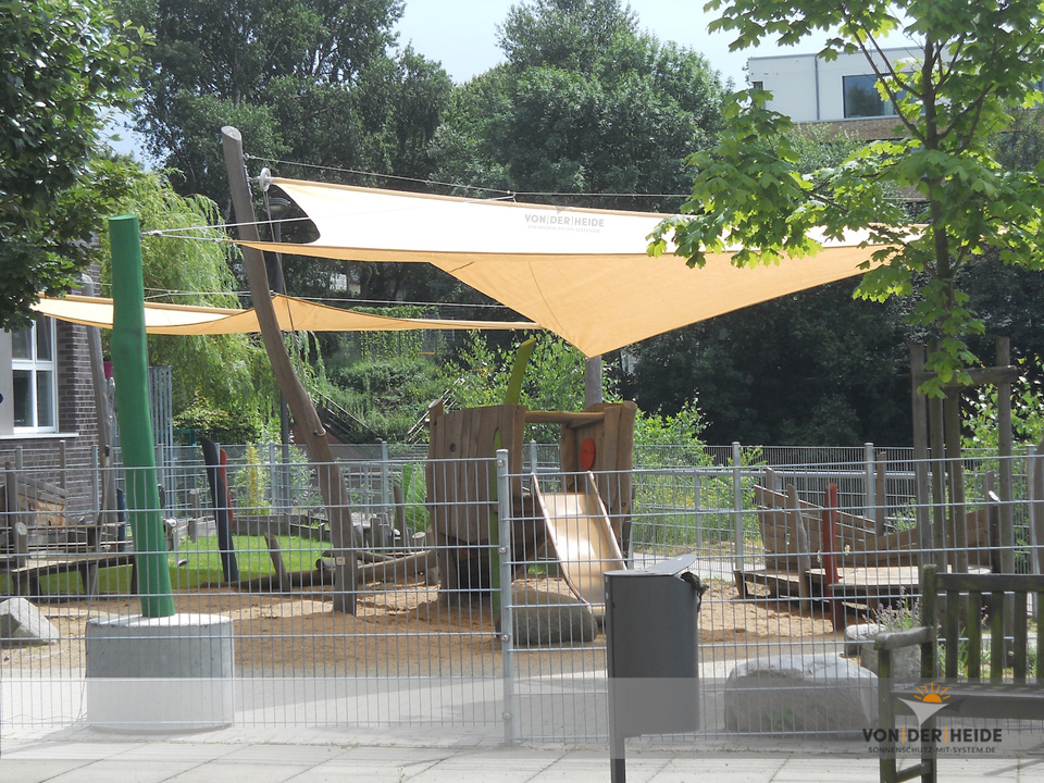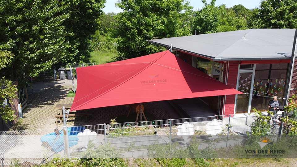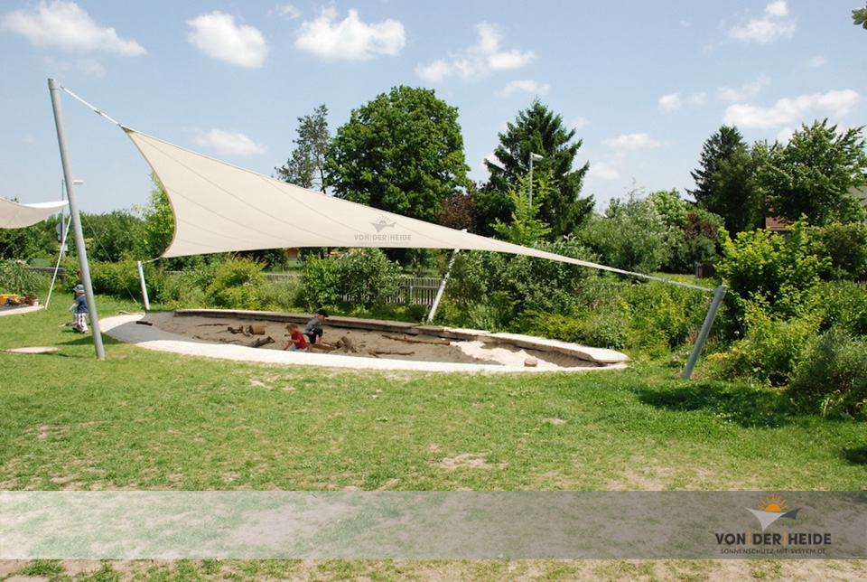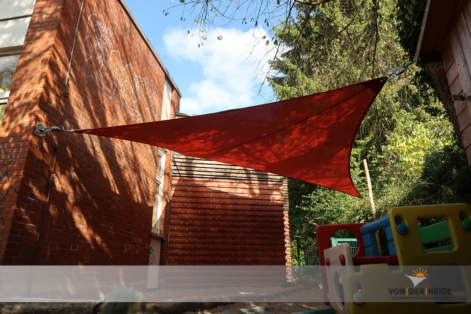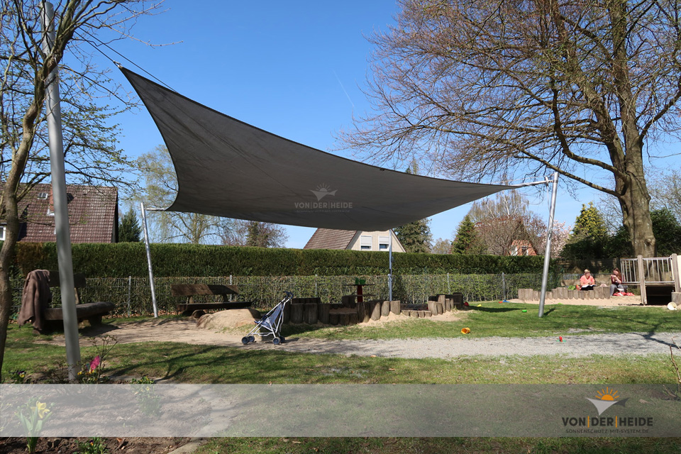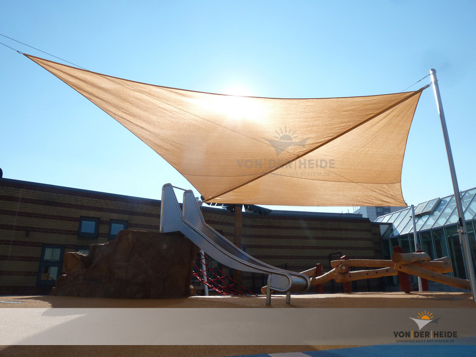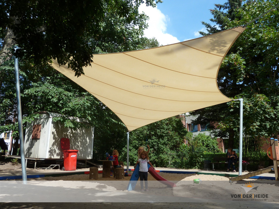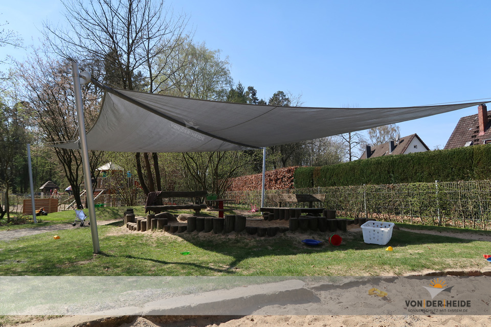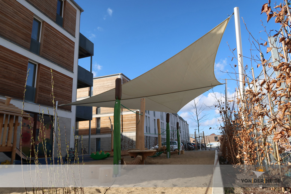 Leichte Fixsegel in Kita über Rutsche und Sandkiste mit VDH-Vario-Design-Masten und VDH-Quick-Spannsystem