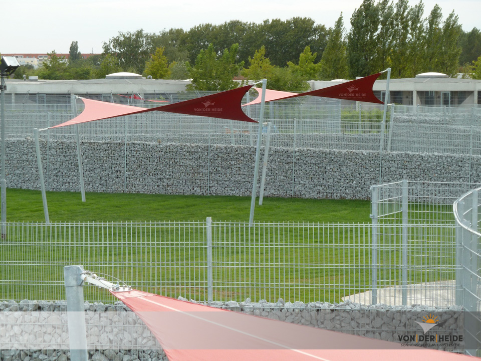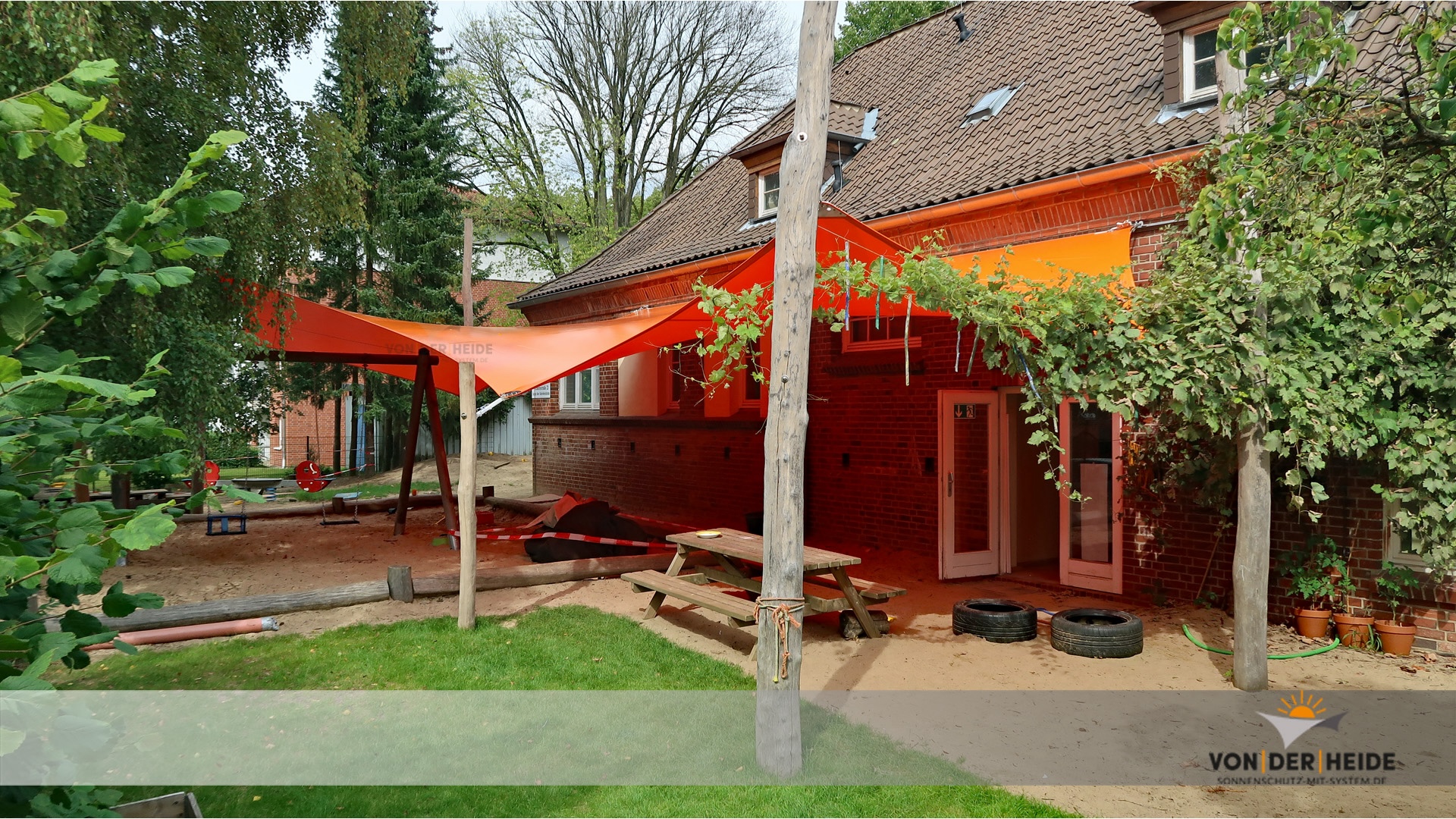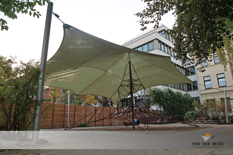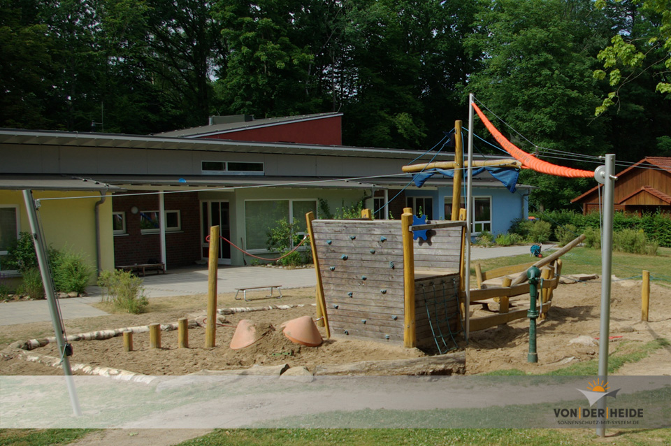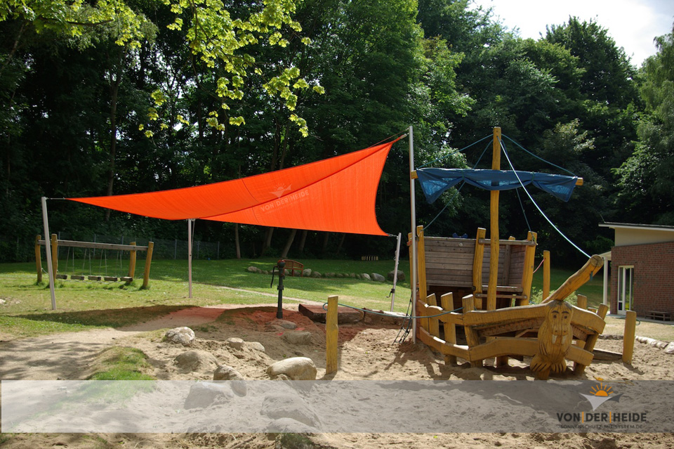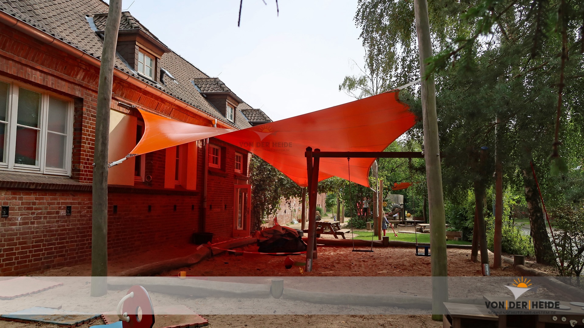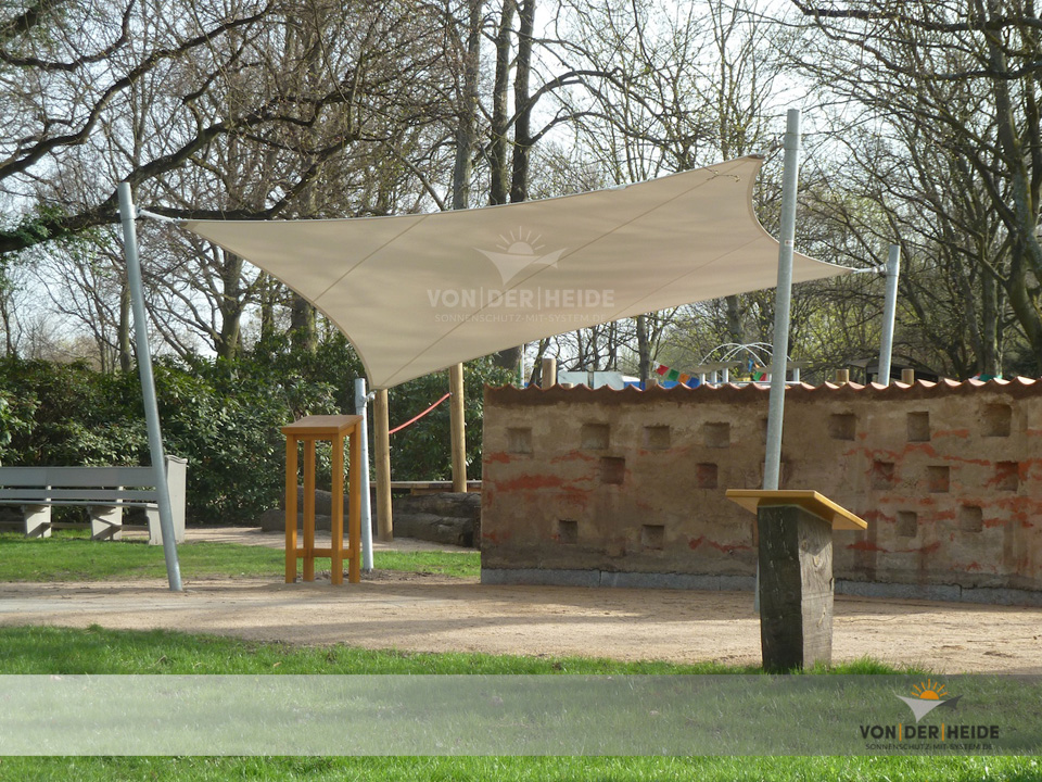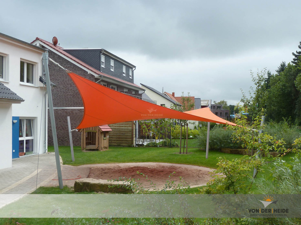 Leichte Fixsegel in Kita über Rutsche und Sandkiste mit VDH-Vario-Design-Masten und VDH-Quick-Spannsystem
