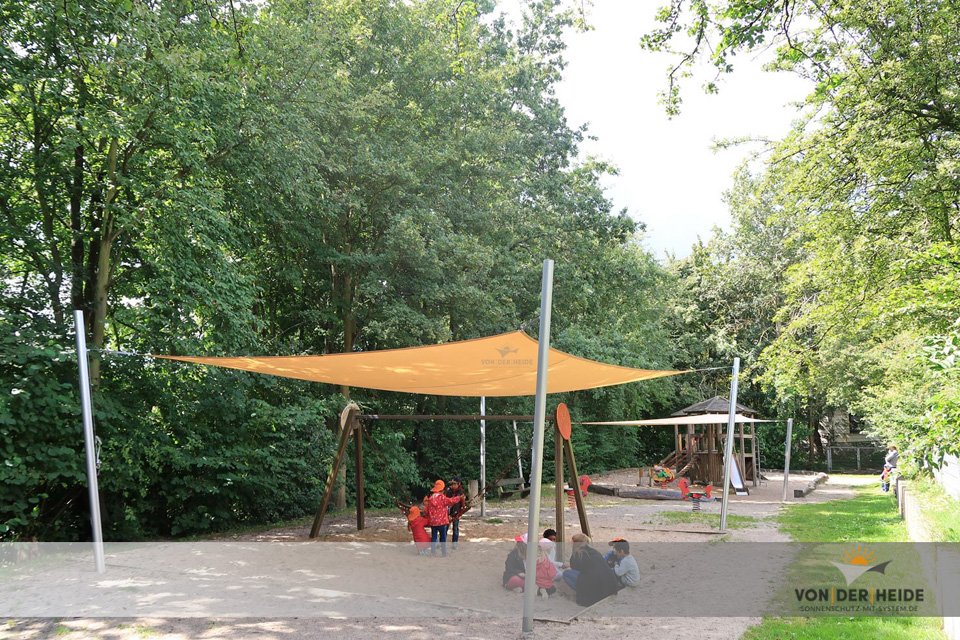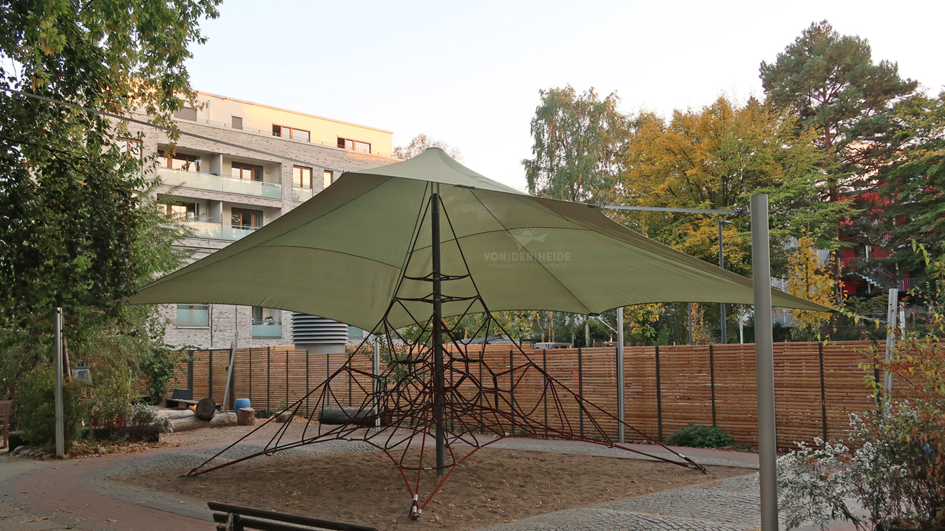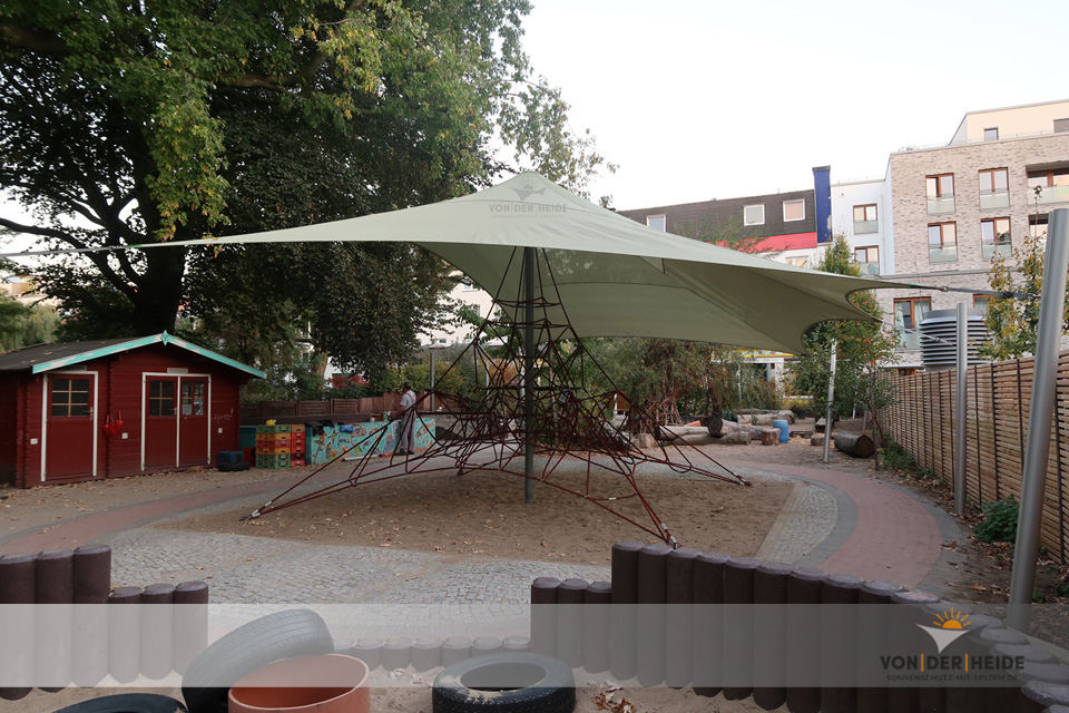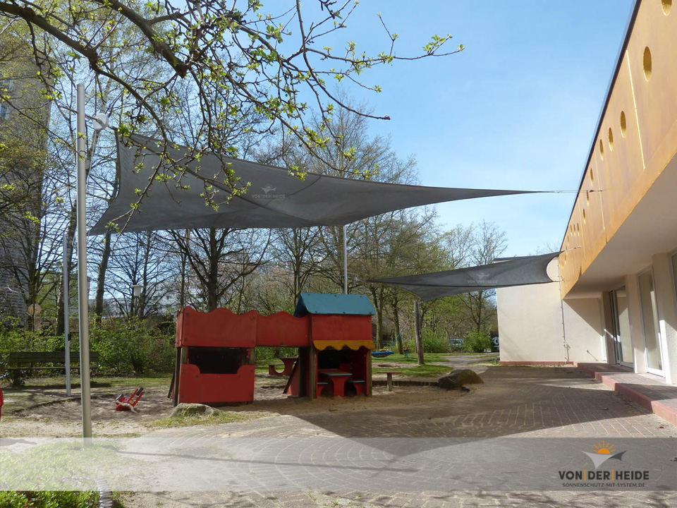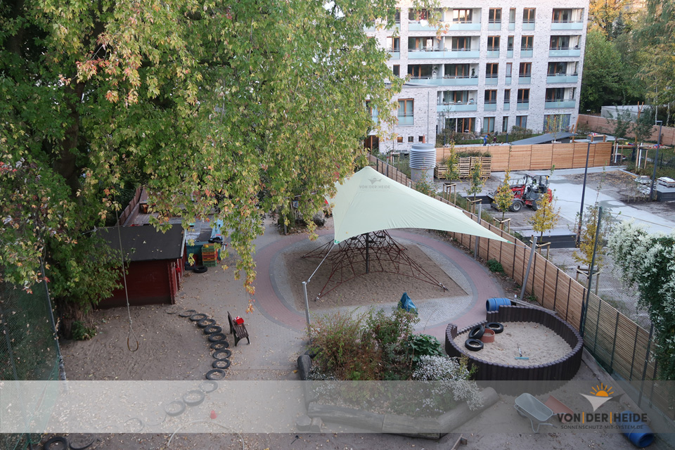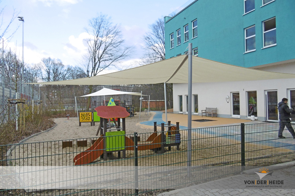 Sonnensegel über Spielgeräten und Sandkisten in einer Kita in Hamburg-Barmbek