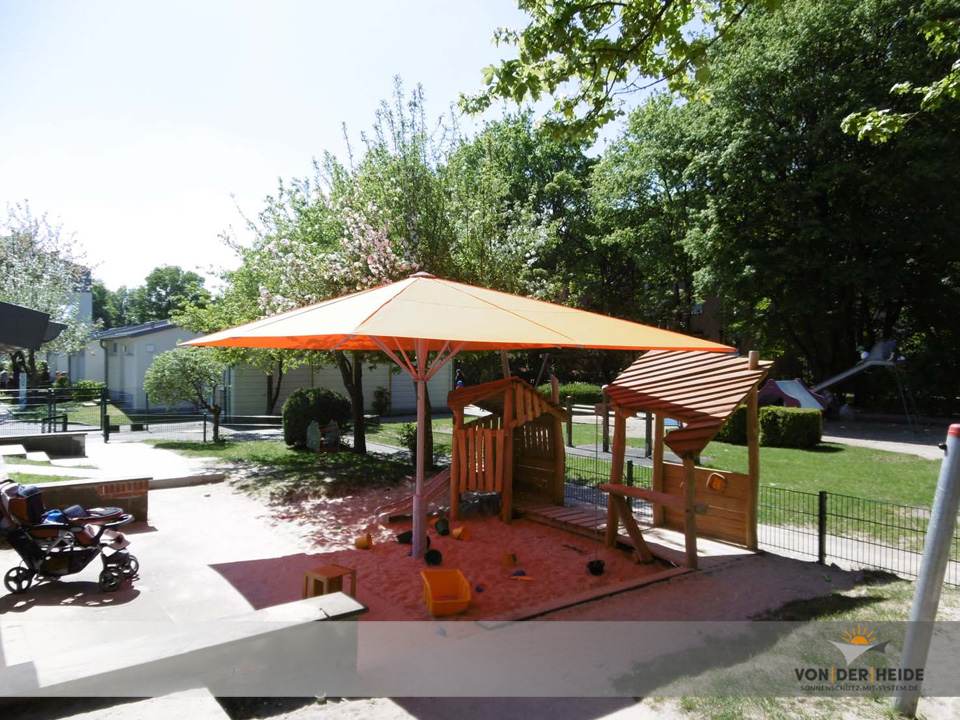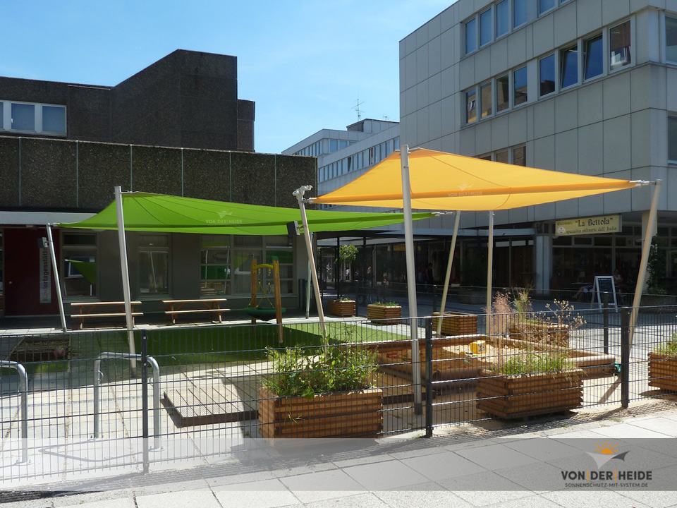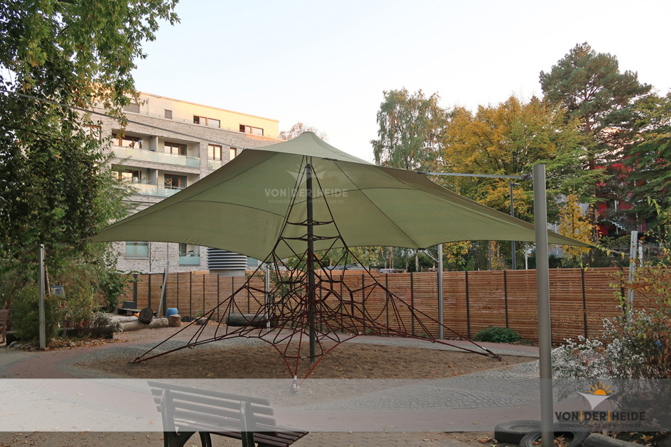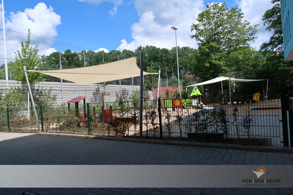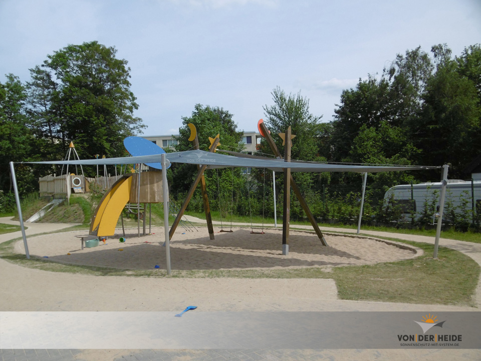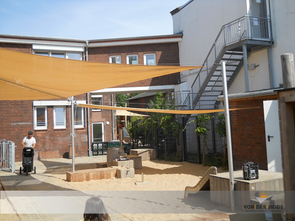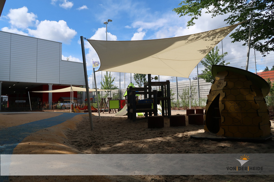 Sonnensegel über Spielgeräten und Sandkisten in einer Kita in Hamburg-Barmbek