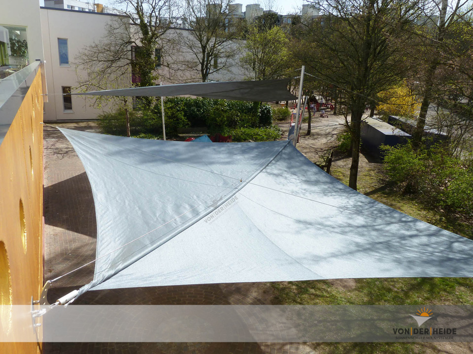 Sonnensegel in einer Kita mit Dachterrasse – Ansicht von unten