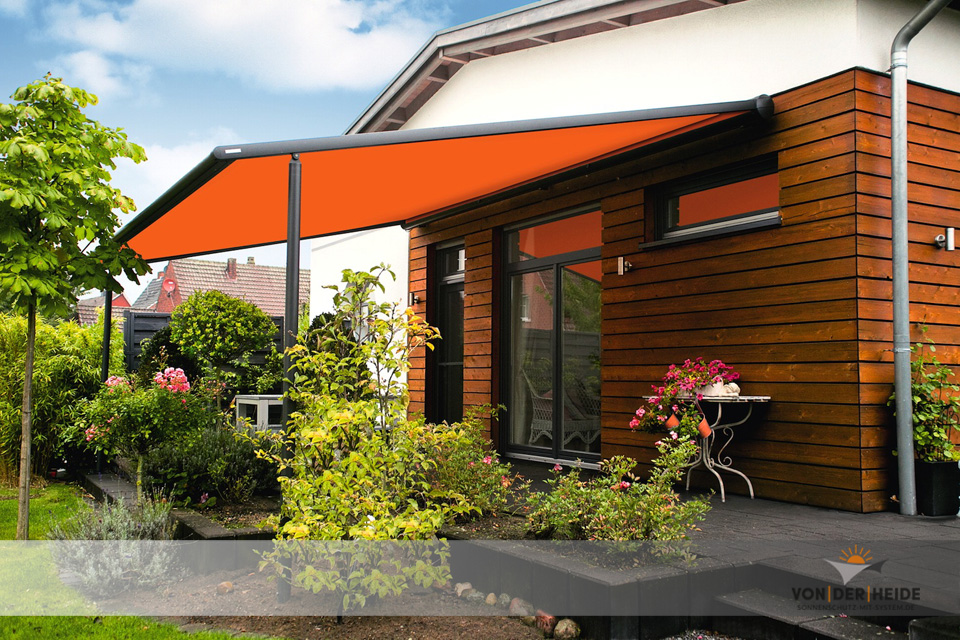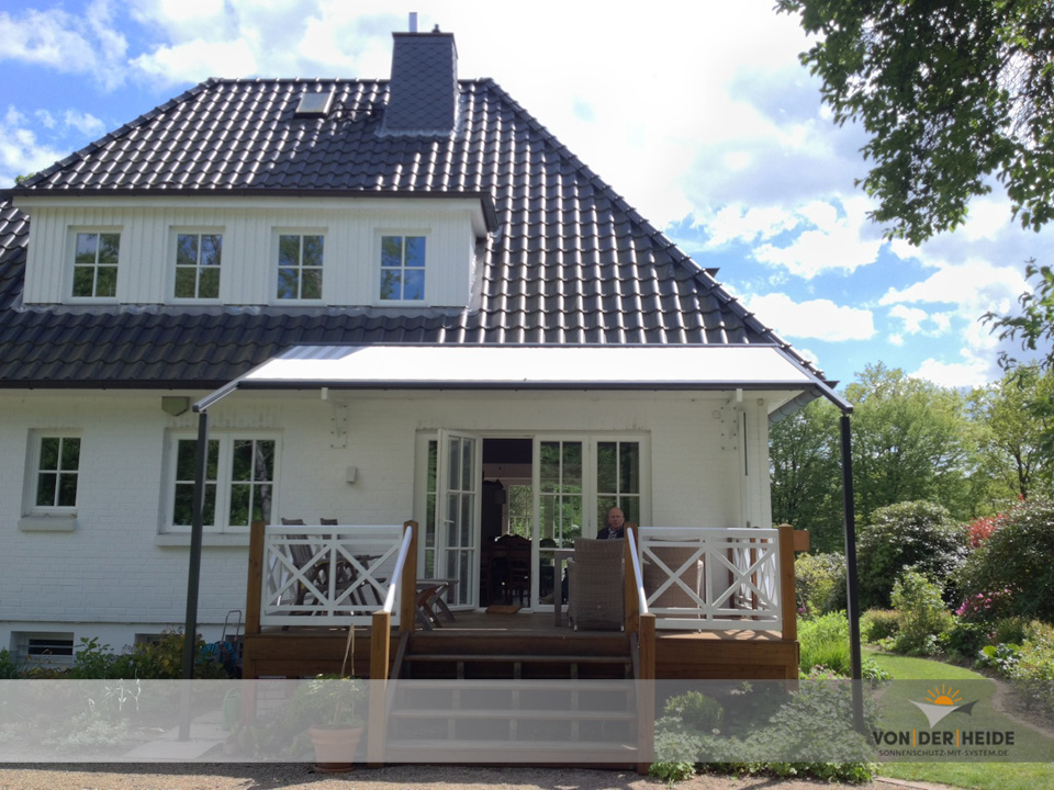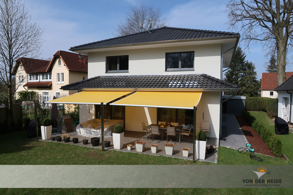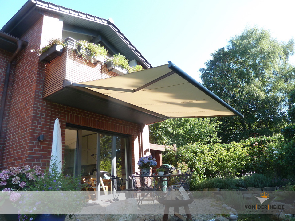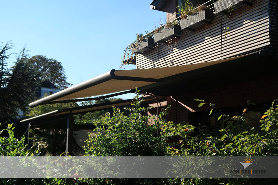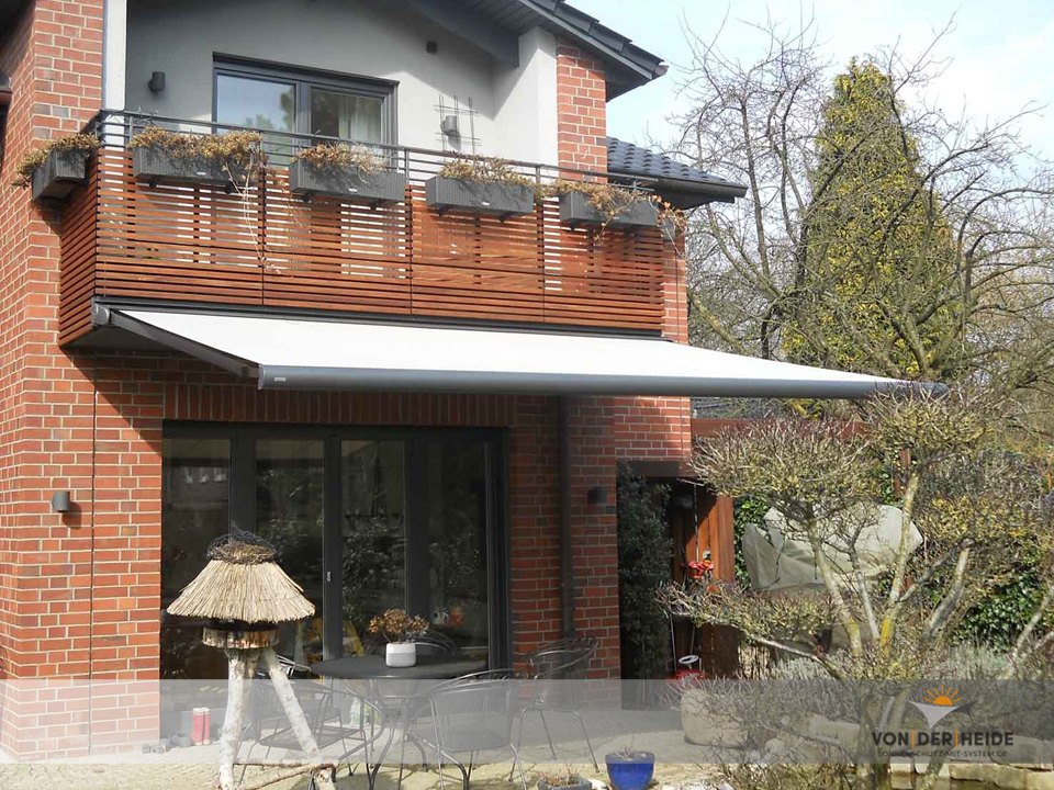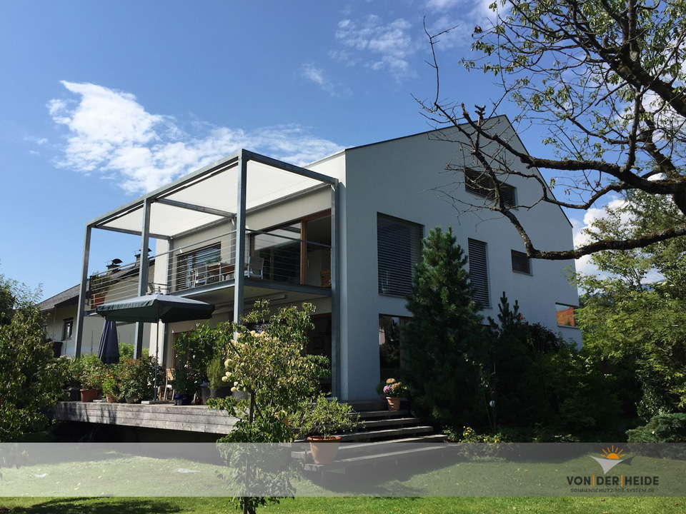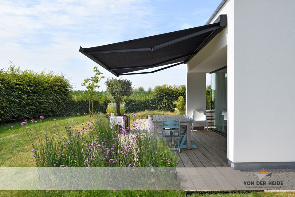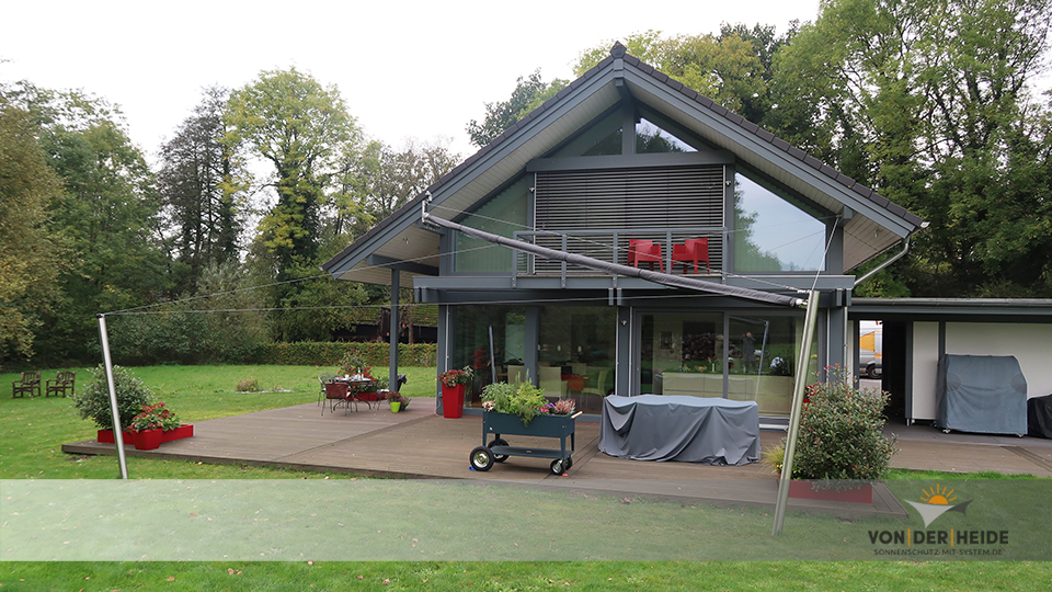 Häuser mit breiten Terrassen und hohen Traufen bieten sich ideal für Markisensegel an. Unter dem Dachüberstand ist die Tuchwelle automatisch vor Verschmutzung geschützt.