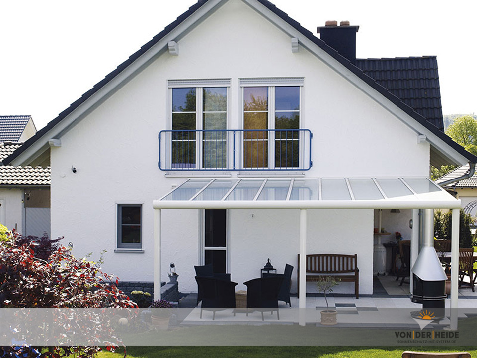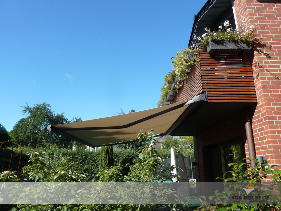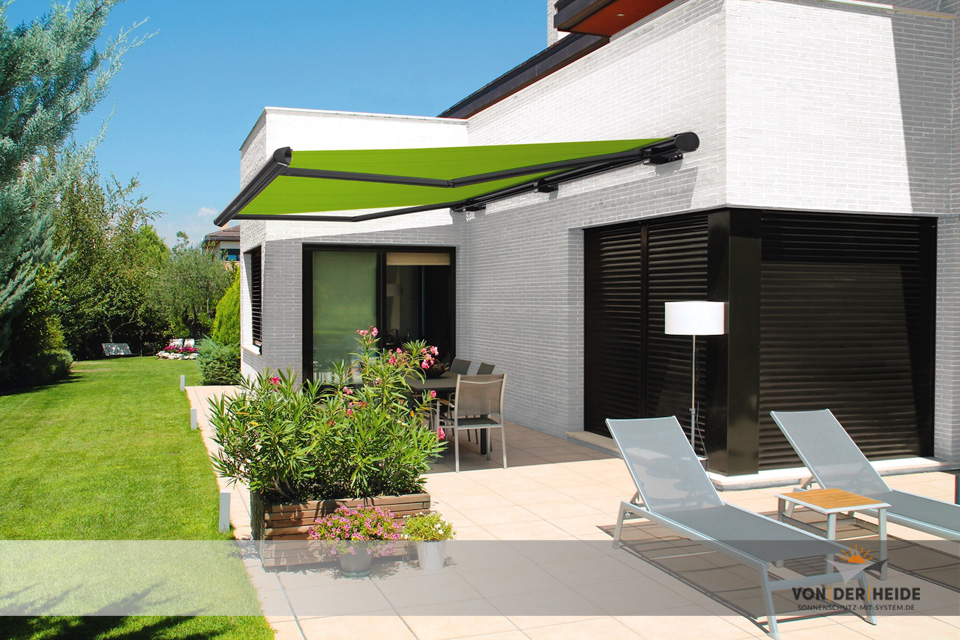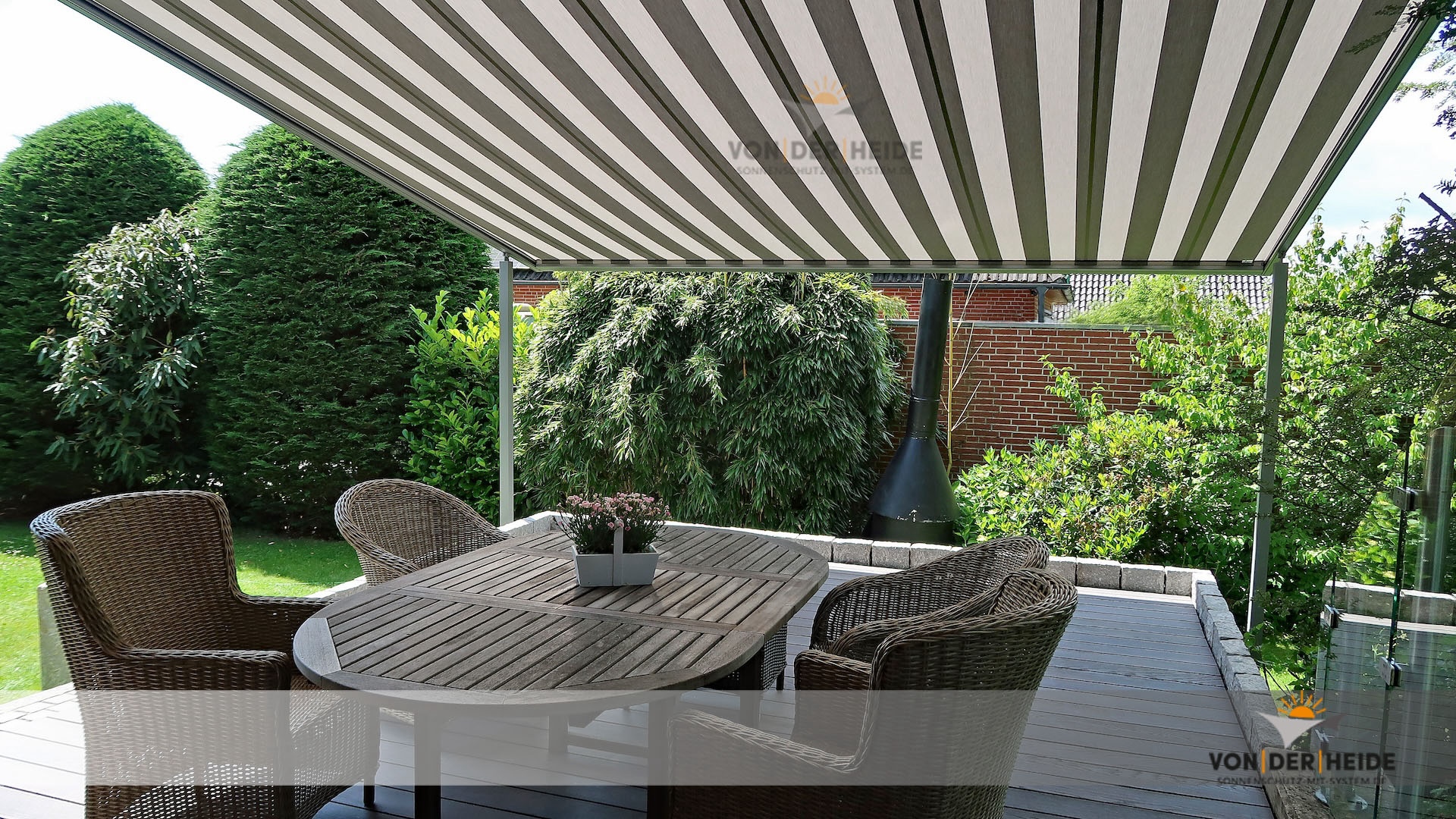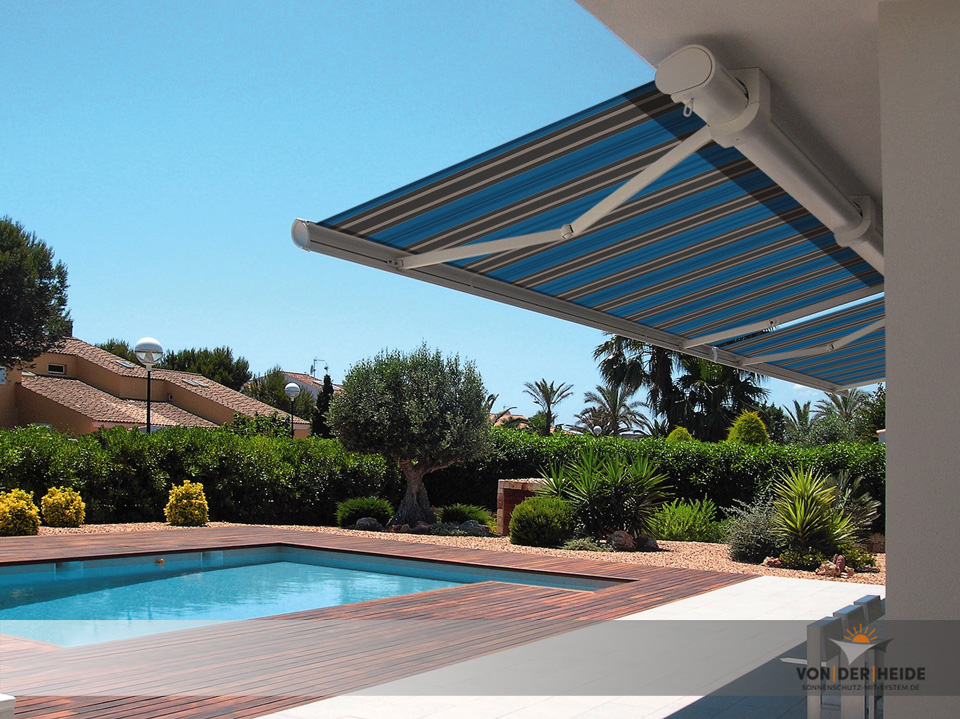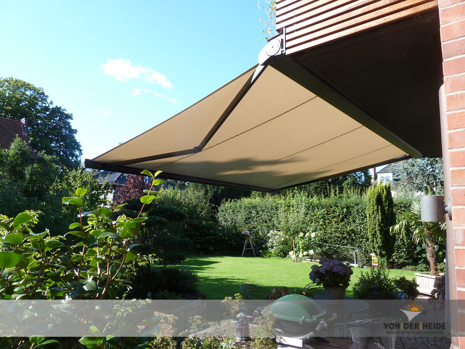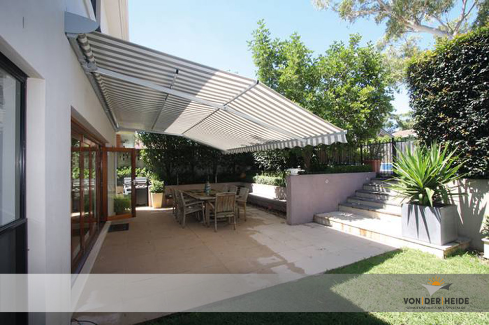 Häuser mit breiten Terrassen und hohen Traufen bieten sich ideal für Markisensegel an. Unter dem Dachüberstand ist die Tuchwelle automatisch vor Verschmutzung geschützt.