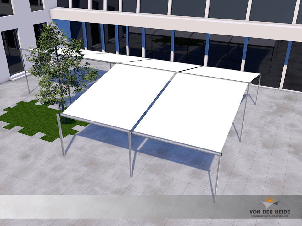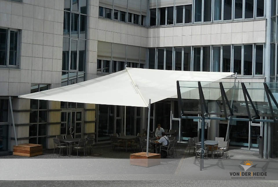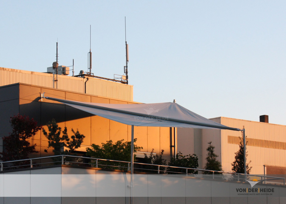 Abgesenkte Segelecken eines Markisen-Segels unterstützen das Segeldeisign und sorgen für Sonnenschutz bei tiefstehender Sonne. Über die abgesenkte Ecke kann Regenwasser gut abfließen.