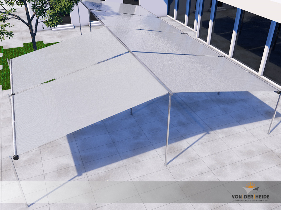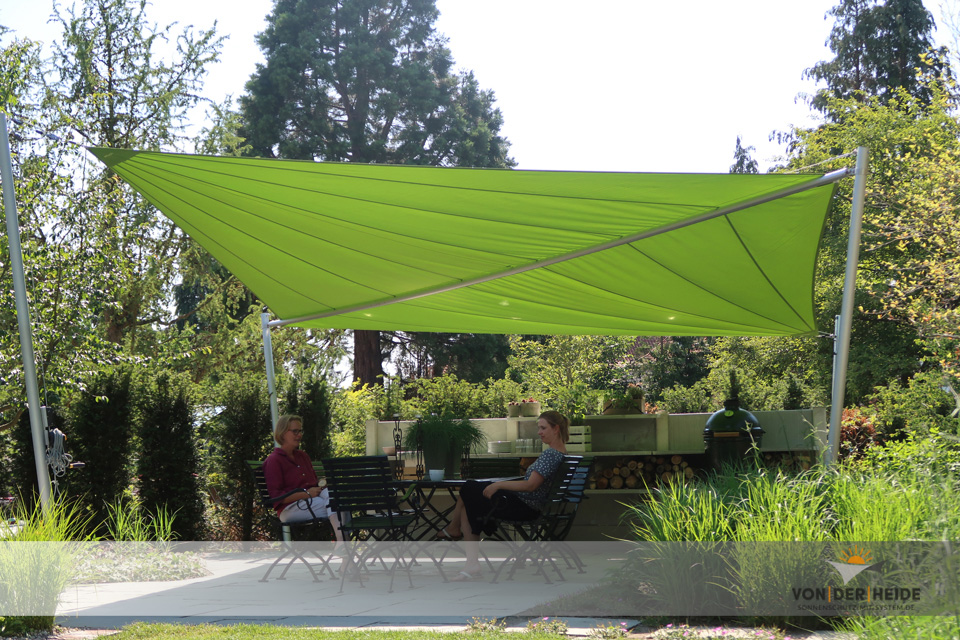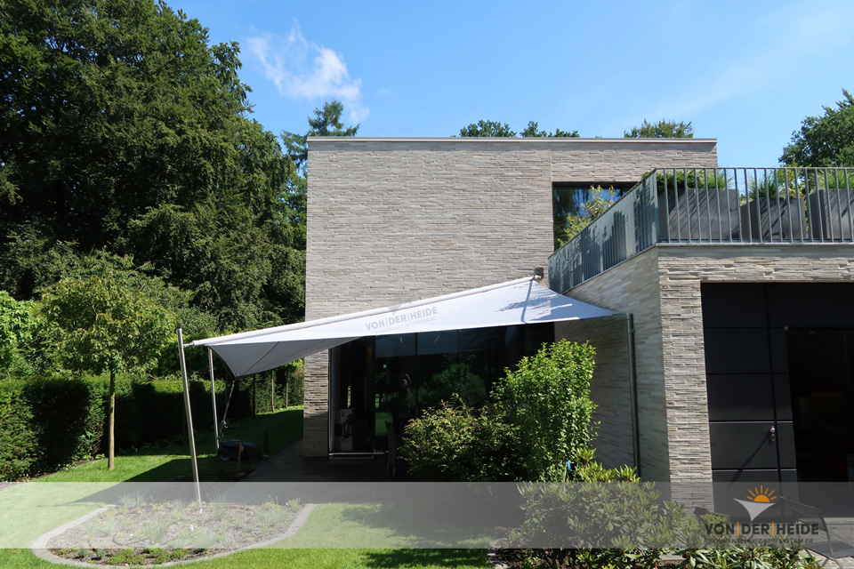 Ausgefahrenes Markisensegel Soliday CS – mit teilabgesenkten Höhenverstellungen