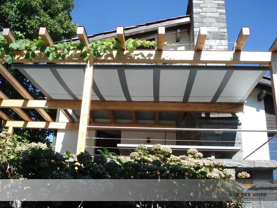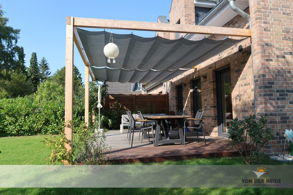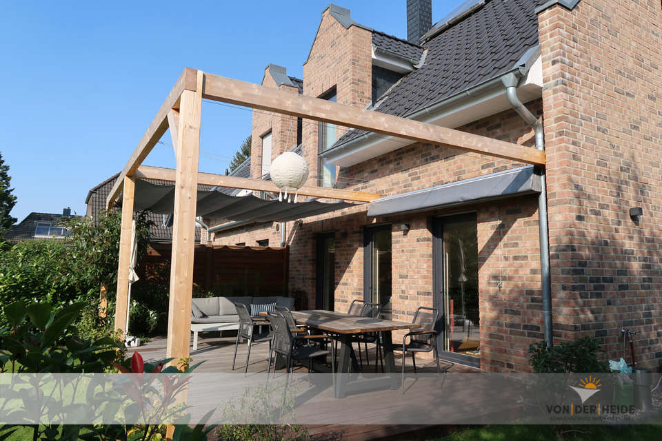 Mit unseren Raff-Sonnensegeln schützen Sie Ihre Lieblingsplätze unter Ihrer Pergola – vor Sonne und mit dem richtigen Tuch auch vor Regen.