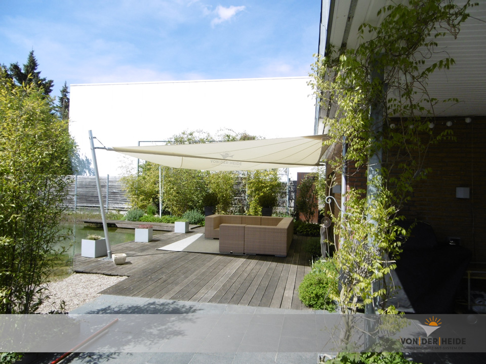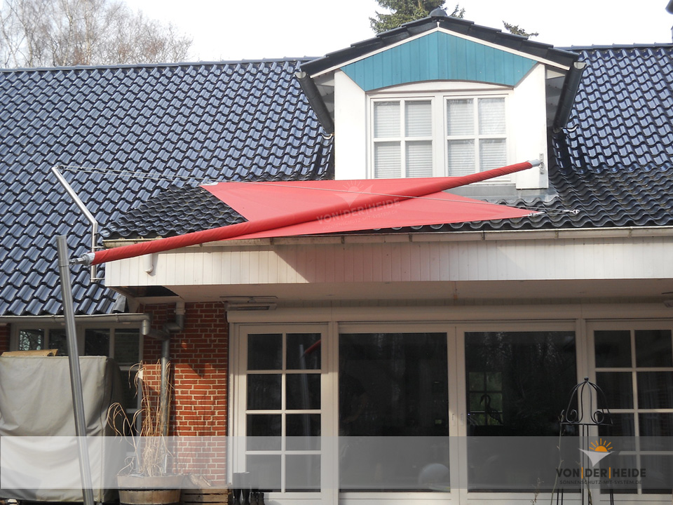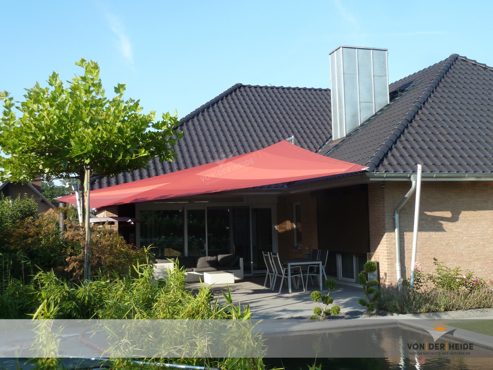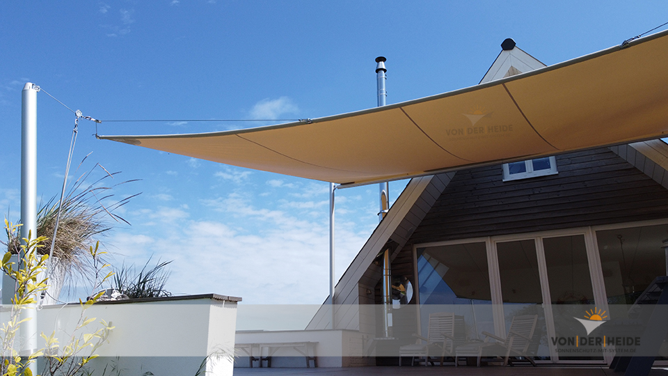 Durch die Montage eines Mastes auf dem Dach dieses Winkelbungalows , konnte das Segel komplett ohne störende Masten auf der Terrasse montiert werden. Die Montagehöhe verleiht dem Segel Leichtigkeit und führt zu angenehmem luftigen Klima unter dem Segel.