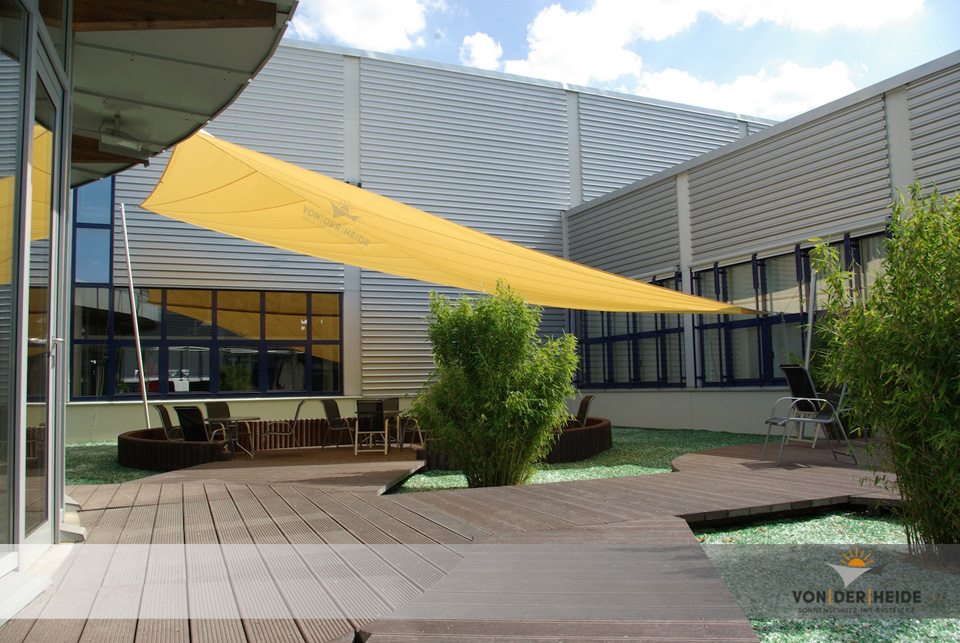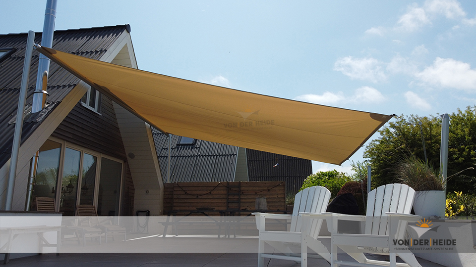 Gelbes Markisensegel Modell „Shadesign-inox“ (früher Twistersegel) auf einer Dachterrasse