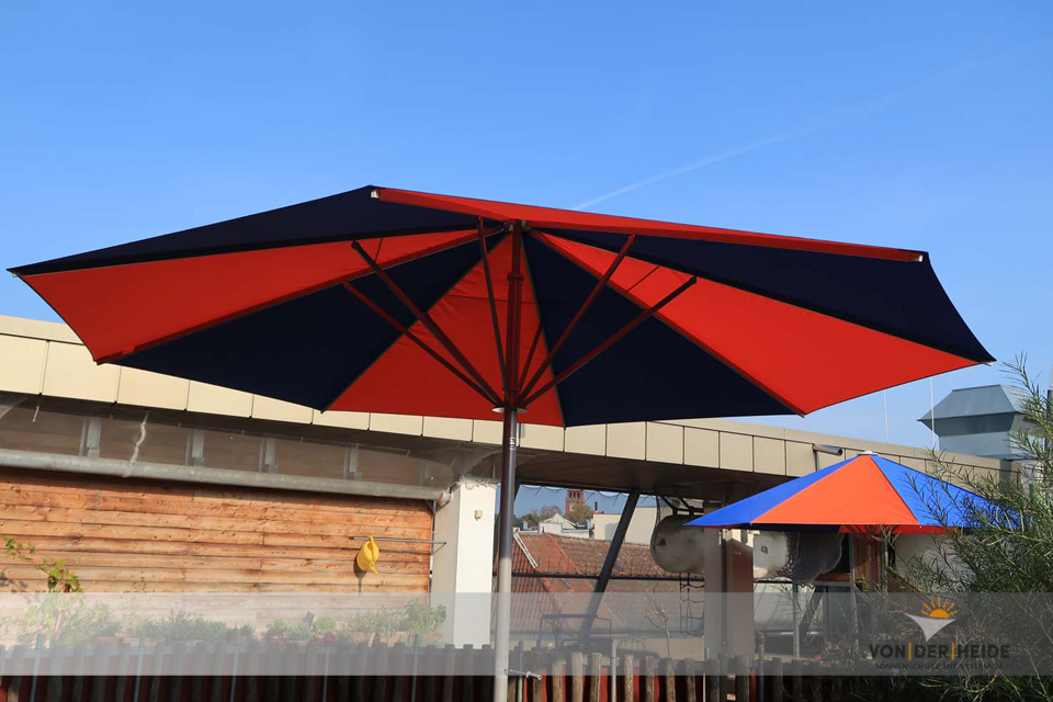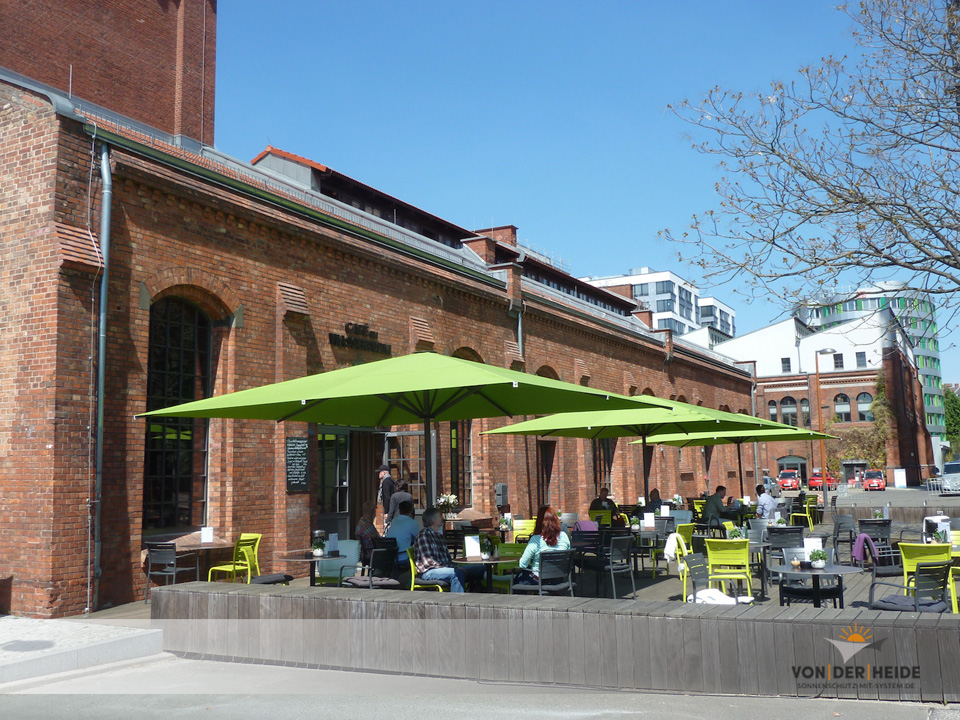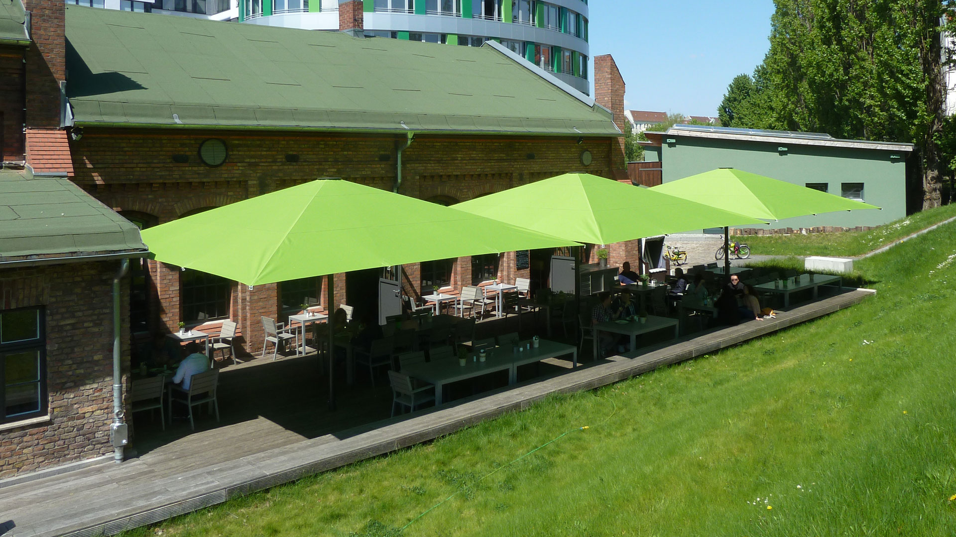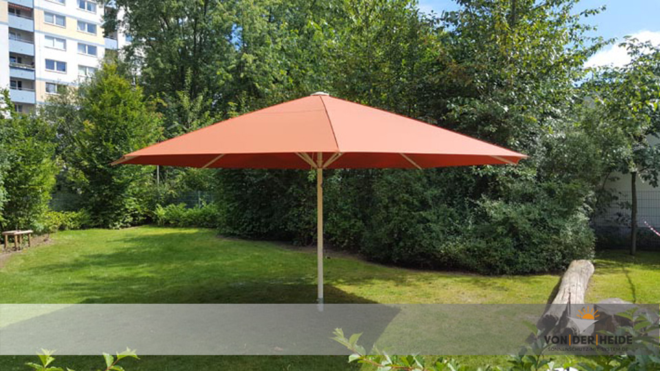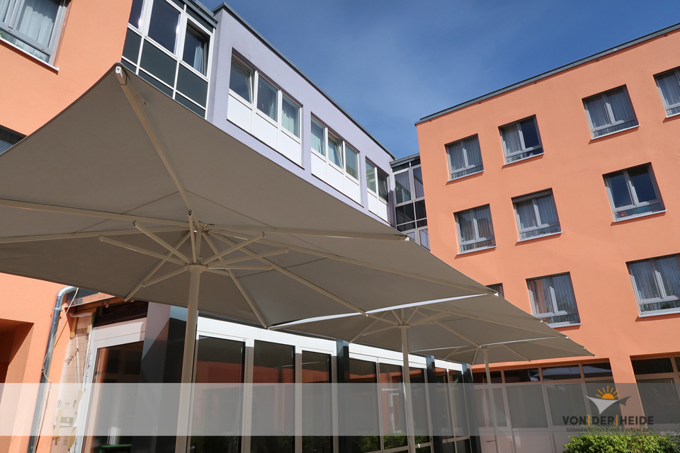 MAY-Sonnenschirme schützen Bewohner und Besucher dieser Seniorenresidenz vor Sonne und vor Regen.