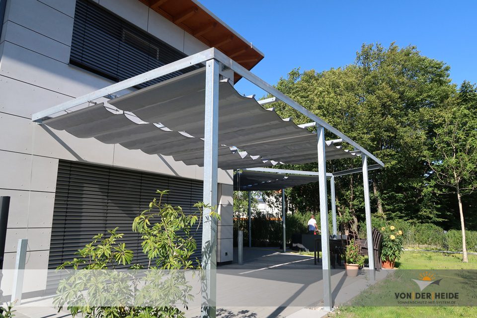 Unsere Raff-Sonnensegel lassen sich besonders gut an kubischen Pergolen montieren.