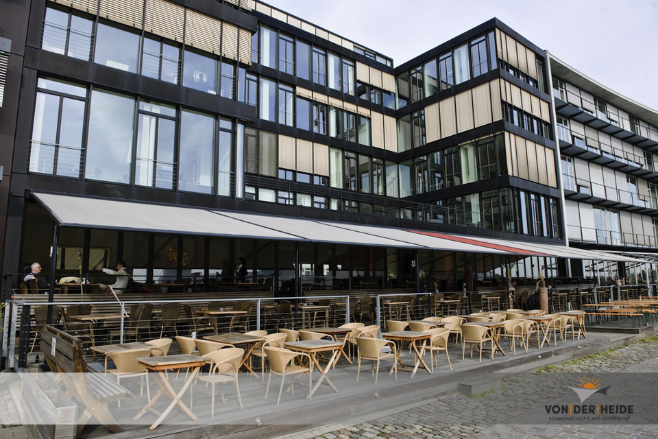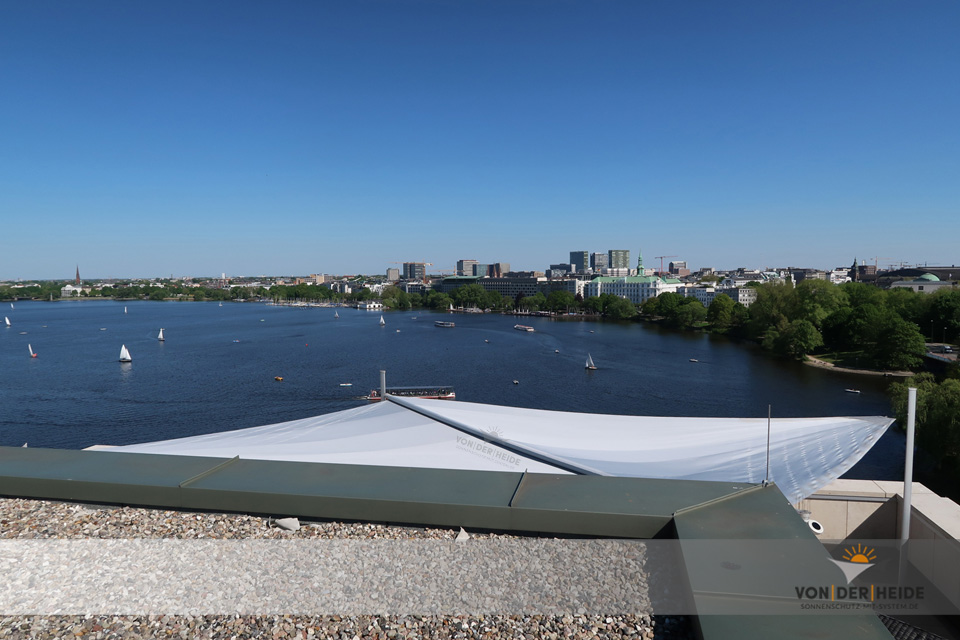 Motorisches Rollup-Sonnensegel auf Dachterrasse eines Bürogebäudes mit Loungemöbeln an der Alster in Hamburg