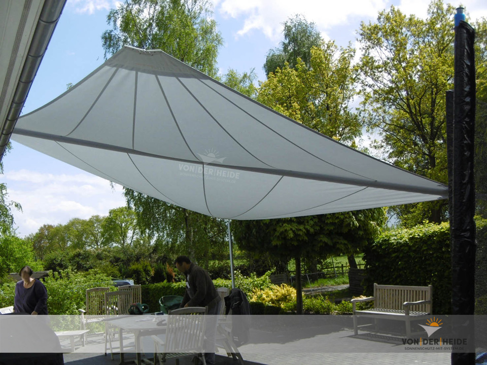 Dieses Sonnensegel mit manueller Bedienung rollt durch eine Feder in der Welle auf Wunsch automatisch ein. Schnell und komfortabel