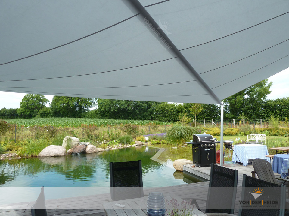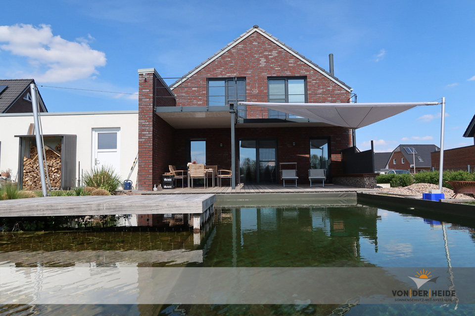 Sonnensegel an Terrasse mit Natur-Schwimmteich – Seitenansicht