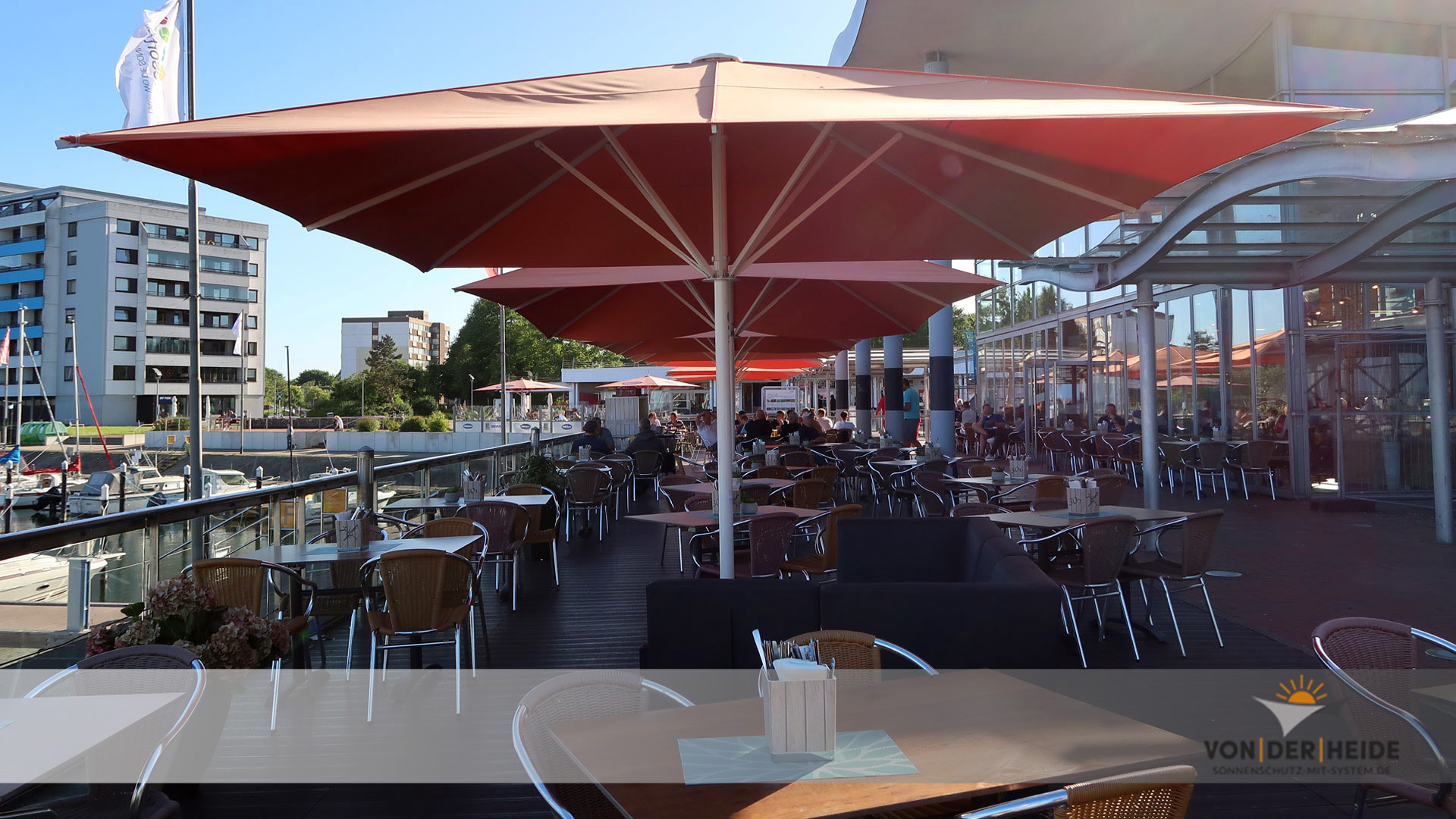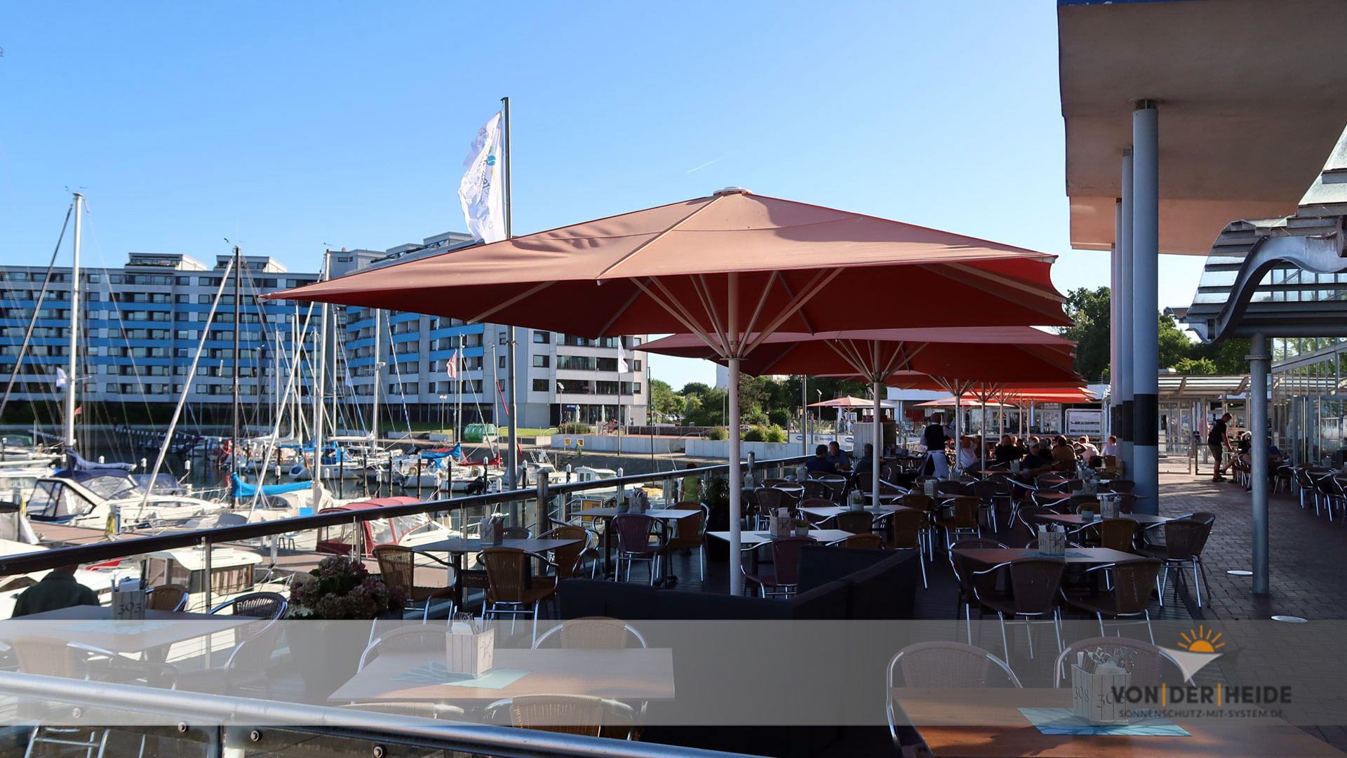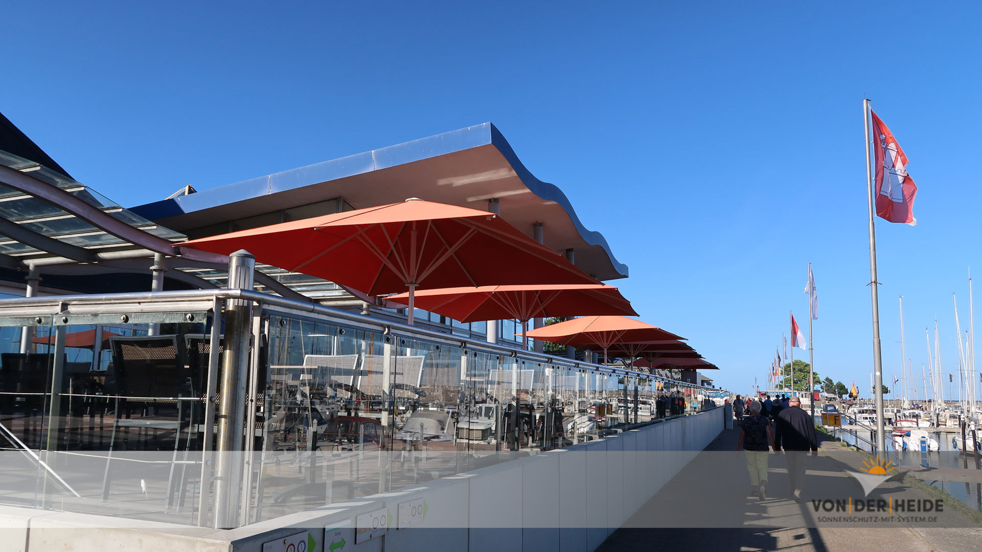 Die vier Saisonsegel schützen bei Wind und Wetter. Textile Architektur am AHOI Steffen Henssler in Scharbeutz